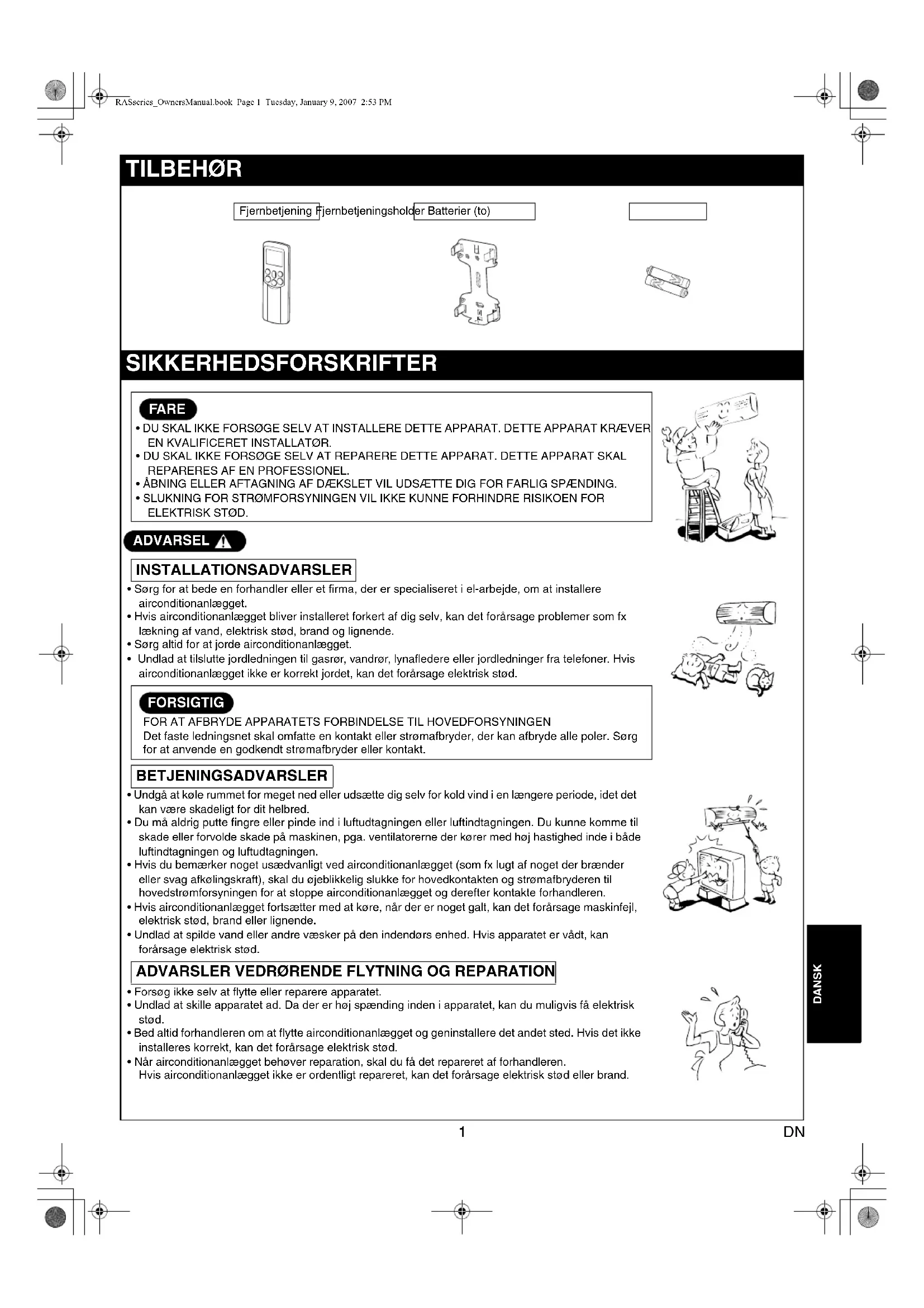 Afkøling Udendørs temperatur: –10°C til 46°C Rumtemperatur: 21°C til 32°C FORSIGTIG Relativ luftfugtighed i rum —mindre end 80%. Hvis airconditionanlægget betjenes uden for dette område, kan der dannes kondens på airconditionanlæggets overflade. Opvarmning Udendørs temperatur: –15°C til 24°C Rumtemperatur: Mindre end 28°C Tørring Udendørs temperatur: –10°C til 46°C Rumtemperatur: 17°C til 32°C RASseries_OwnersManual.book Page 24 Tuesday, January 9, 2007 2:53 PM25 DN
