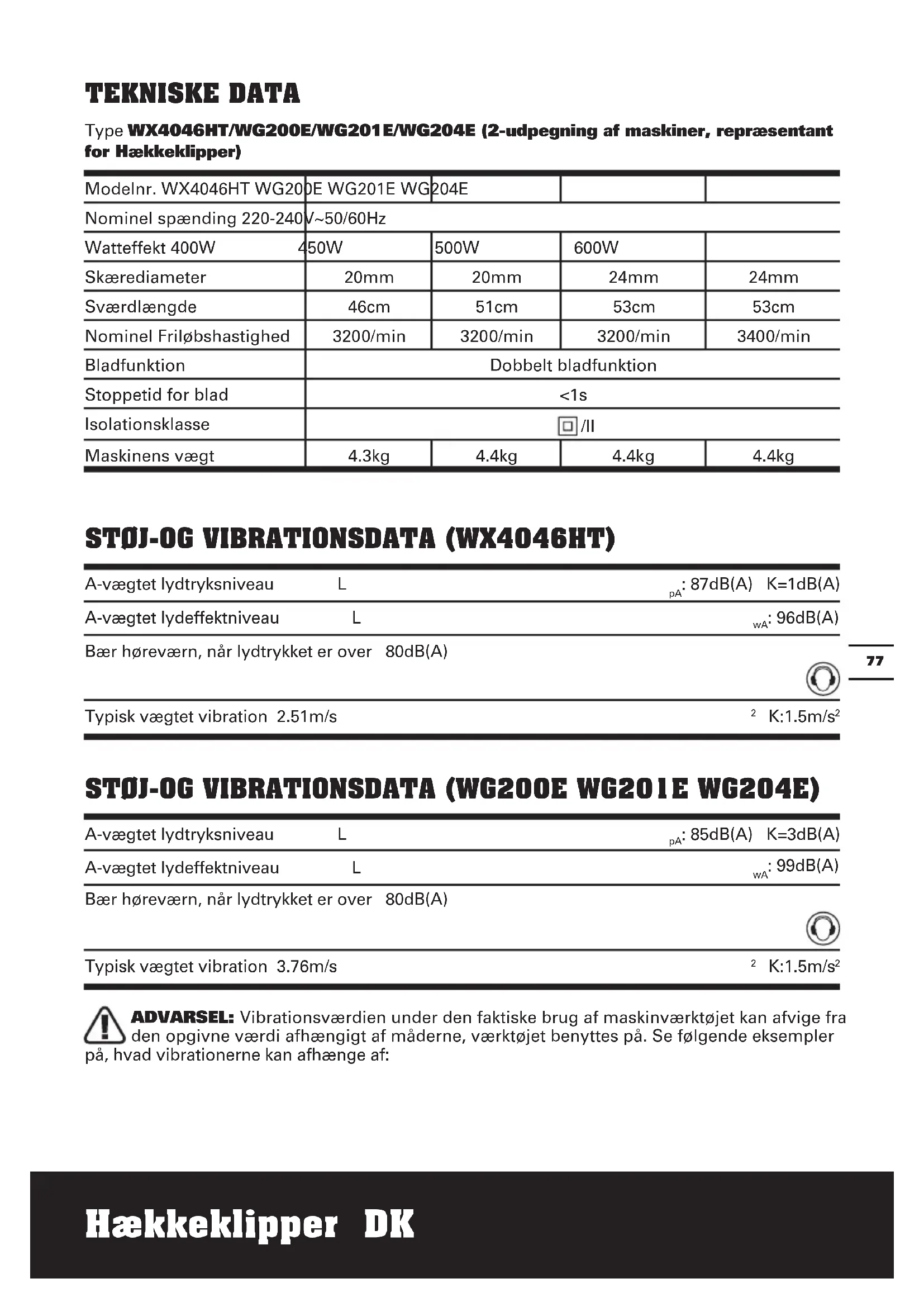 ADVARSEL: Vibrationsværdien under den faktiske brug af maskinværktøjet kan afvige fra den opgivne værdi afhængigt af måderne, værktøjet benyttes på. Se følgende eksempler på, hvad vibrationerne kan afhænge af: Modelnr. WX4046HT WG200E WG201E WG204E Nominel spænding 220-240V~50/60Hz Watteffekt 400W 450W 500W 600W Skærediameter 20mm 20mm 24mm 24mm Sværdlængde 46cm 51cm 53cm 53cm Nominel Friløbshastighed 3200/min 3200/min 3200/min 3400/min Bladfunktion Dobbelt bladfunktion Stoppetid for blad <1s Isolationsklasse /II Maskinens vægt 4.3kg 4.4kg 4.4kg 4.4kgHækkeklipper DK