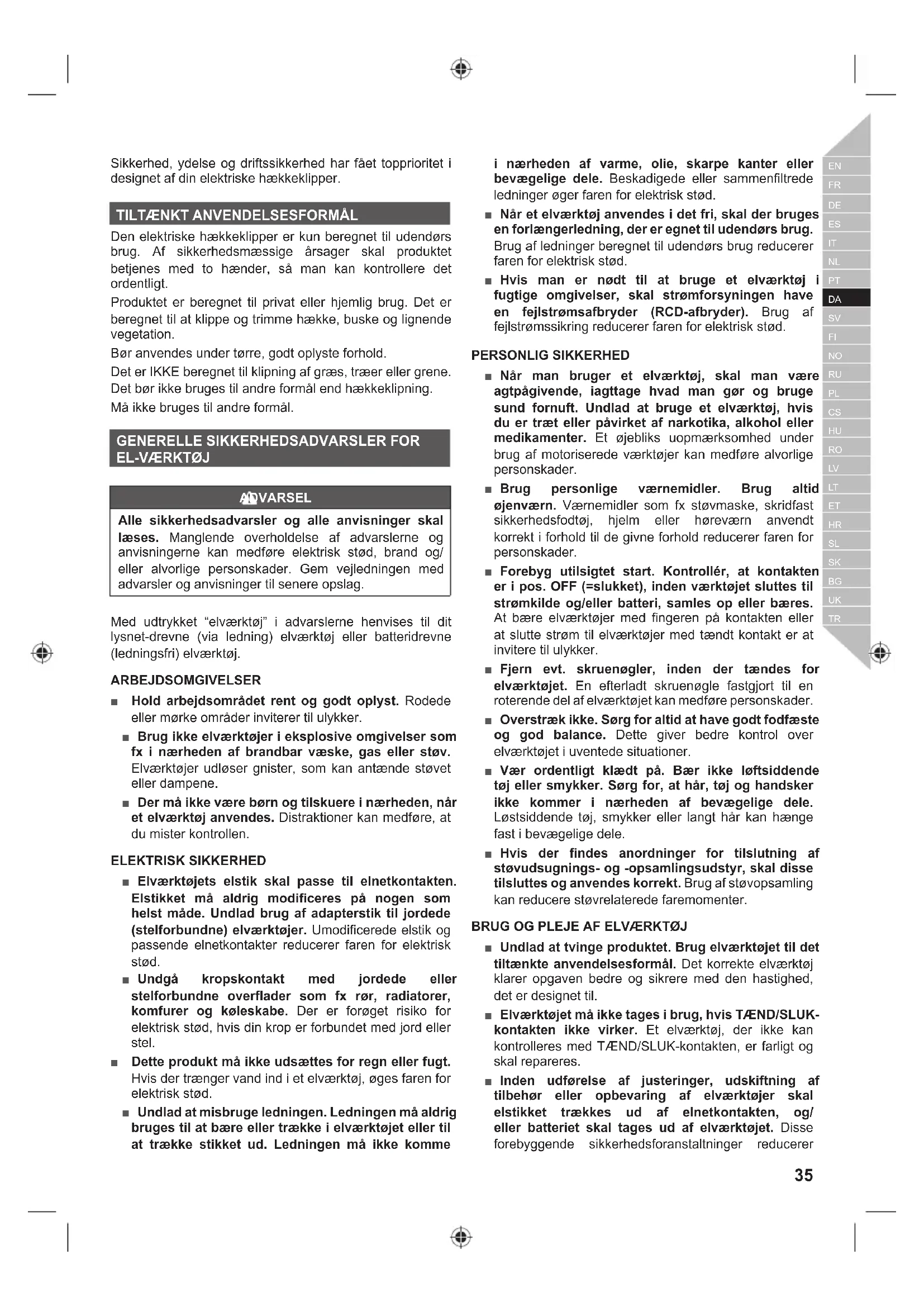 ADVARSEL Alle sikkerhedsadvarsler og alle anvisninger skal læses. Manglende overholdelse af advarslerne og anvisningerne kan medføre elektrisk stød, brand og/ eller alvorlige personskader. Gem vejledningen med advarsler og anvisninger til senere opslag. Med udtrykket “elværktøj” i advarslerne henvises til dit lysnet-drevne (via ledning) elværktøj eller batteridrevne (ledningsfri) elværktøj. ARBEJDSOMGIVELSER ■ Hold arbejdsområdet rent og godt oplyst. Rodede eller mørke områder inviterer til ulykker. ■ Brug ikke elværktøjer i eksplosive omgivelser som fx i nærheden af brandbar væske, gas eller støv. Elværktøjer udløser gnister, som kan antænde støvet eller dampene. ■ Der må ikke være børn og tilskuere i nærheden, når et elværktøj anvendes. Distraktioner kan medføre, at du mister kontrollen. ELEKTRISK SIKKERHED ■ Elværktøjets elstik skal passe til elnetkontakten. Elstikket må aldrig modificeres på nogen som helst måde. Undlad brug af adapterstik til jordede (stelforbundne) elværktøjer. Umodificerede elstik og passende elnetkontakter reducerer faren for elektrisk stød. ■ Undgå kropskontakt med jordede eller stelforbundne overflader som fx rør, radiatorer, komfurer og køleskabe. Der er forøget risiko for elektrisk stød, hvis din krop er forbundet med jord eller stel. ■ Dette produkt må ikke udsættes for regn eller fugt. Hvis der trænger vand ind i et elværktøj, øges faren for elektrisk stød. ■ Undlad at misbruge ledningen. Ledningen må aldrig bruges til at bære eller trække i elværktøjet eller til at trække stikket ud. Ledningen må ikke komme i nærheden af varme, olie, skarpe kanter eller bevægelige dele. Beskadigede eller sammenfiltrede ledninger øger faren for elektrisk stød. ■ Når et elværktøj anvendes i det fri, skal der bruges en forlængerledning, der er egnet til udendørs brug. Brug af ledninger beregnet til udendørs brug reducerer faren for elektrisk stød. ■ Hvis man er nødt til at bruge et elværktøj i fugtige omgivelser, skal strømforsyningen have en fejlstrømsafbryder (RCD-afbryder). Brug af fejlstrømssikring reducerer faren for elektrisk stød. PERSONLIG SIKKERHED ■ Når man bruger et elværktøj, skal man være agtpågivende, iagttage hvad man gør og bruge sund fornuft. Undlad at bruge et elværktøj, hvis du er træt eller påvirket af narkotika, alkohol eller medikamenter. Et øjebliks uopmærksomhed under brug af motoriserede værktøjer kan medføre alvorlige personskader. ■ Brug personlige værnemidler. Brug altid øjenværn. Værnemidler som fx støvmaske, skridfast sikkerhedsfodtøj, hjelm eller høreværn anvendt korrekt i forhold til de givne forhold reducerer faren for personskader. ■ Forebyg utilsigtet start. Kontrollér, at kontakten er i pos. OFF (=slukket), inden værktøjet sluttes til strømkilde og/eller batteri, samles op eller bæres. At bære elværktøjer med fingeren på kontakten eller at slutte strøm til elværktøjer med tændt kontakt er at invitere til ulykker. ■ Fjern evt. skruenøgler, inden der tændes for elværktøjet. En efterladt skruenøgle fastgjort til en roterende del af elværktøjet kan medføre personskader. ■ Overstræk ikke. Sørg for altid at have godt fodfæste og god balance. Dette giver bedre kontrol over elværktøjet i uventede situationer. ■ Vær ordentligt klædt på. Bær ikke løftsiddende tøj eller smykker. Sørg for, at hår, tøj og handsker ikke kommer i nærheden af bevægelige dele. Løstsiddende tøj, smykker eller langt hår kan hænge fast i bevægelige dele. ■ Hvis der findes anordninger for tilslutning af støvudsugnings- og -opsamlingsudstyr, skal disse tilsluttes og anvendes korrekt. Brug af støvopsamling kan reducere støvrelaterede faremomenter. BRUG OG PLEJE AF ELVÆRKTØJ ■ Undlad at tvinge produktet. Brug elværktøjet til det tiltænkte anvendelsesformål. Det korrekte elværktøj klarer opgaven bedre og sikrere med den hastighed, det er designet til. ■ Elværktøjet må ikke tages i brug, hvis TÆND/SLUK- kontakten ikke virker. Et elværktøj, der ikke kan kontrolleres med TÆND/SLUK-kontakten, er farligt og skal repareres. ■ Inden udførelse af justeringer, udskiftning af tilbehør eller opbevaring af elværktøjer skal elstikket trækkes ud af elnetkontakten, og/ eller batteriet skal tages ud af elværktøjet. Disse forebyggende sikkerhedsforanstaltninger reducerer36 | Dansk faren for utilsigtet start af elværktøjet. ■ Når elværktøjer ikke bruges, skal de opbevares utilgængeligt for børn; personer, som ikke er fortrolige med elværktøjet eller denne brugsanvisning, må ikke anvende elværktøjet. Elværktøjer er farlige i hænderne på ukyndige brugere. ■ Elværktøjer skal vedligeholdes. Kontrollér, om der er forkert indjusterede eller forbundne bevægelige dele, afbrækkede dele samt andre tilstande, som kan påvirke elværktøjets funktionsmåde. Hvis der konstateres skader, skal elværktøjet repareres inden brug. Mange ulykker skyldes dårligt vedligeholdte elværktøjer. ■ Skærende værktøjer skal holdes skarpe og rene. Korrekt vedligeholdte skærende værktøjer med skarpe skær er mindre tilbøjelige til at binde/blokere og er lettere at kontrollere. ■ Brug elværktøjet, tilbehøret og værktøjs-bits osv. som foreskrevet i denne brugsanvisning, og tag højde for arbejdsforholdene og den aktuelle arbejdsopgave. Brug af elværktøjet i strid med de tiltænkte anvendelsesformål kan medføre farlige situationer. VEDLIGEHOLDELSE ■ Sørg for, at elværktøjet serviceres af en kvalificeret reparatør, som kun benytter sig af originale reservedele. Herved garanteres sikkerheden for elproduktet. SIKKERHEDSADVARSLER VEDR. HÆKKEKLIPPEREN ■ Hold alle legemsdele på afstand af kniven. Forsøg ikke at fjerne afklippet materiale eller holde om materiale, der skal klippes, mens knivene er i bevægelse. Kontrollér, at kontakten er slukket, når du fjerner fastsiddende m