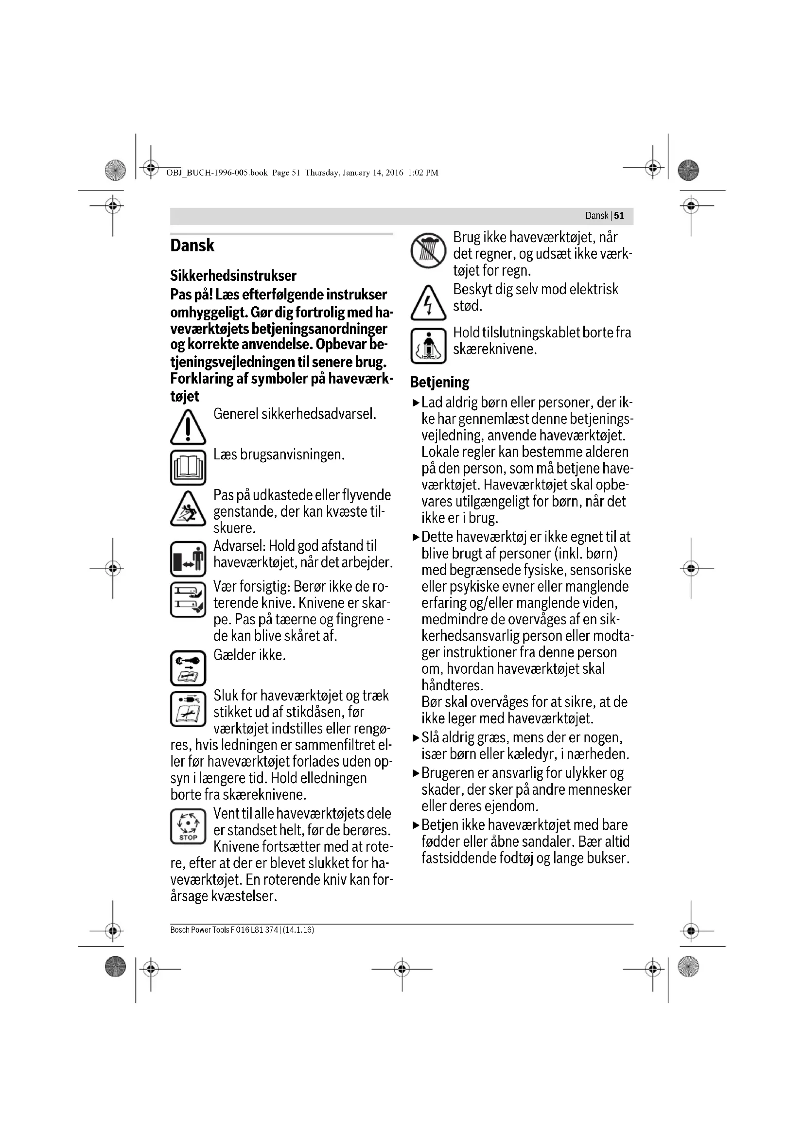 OBJ_BUCH-1996-005.book Page 49 Thursday, January 14, 2016 1:02 PM50 | Nederlands F 016 L81 374 | (14.1.16) Bosch Power Tools Storingen opsporen Klantenservice en gebruiksadviezen www.bosch-garden.com Vermeld bij vragen en bestellingen van vervangingsonderde- len altijd het uit tien cijfers bestaande zaaknummer volgens het typeplaatje van het tuingereedschap. Nederland Tel.: (076) 579 54 54 Fax: (076) 579 54 94 E-mail: gereedschappen@nl.bosch.com België Tel.: (02) 588 0589 Fax: (02) 588 0595 E-mail: outillage.gereedschap@be.bosch.com Afvalverwijdering Tuingereedschappen, toebehoren en verpakkingen moeten op een voor het milieu verantwoorde wijze worden gerecy- cled. Gooi tuingereedschappen niet bij het huisvuil. Alleen voor landen van de EU: Volgens de Europese richtlijn 2012/19/EU betreffende oude elektrische en elektroni- sche apparaten en de omzetting van de richt- lijn in nationaal recht moeten niet meer bruik- bare elektrische en elektronische apparaten worden ingezameld en op een voor het milieu verantwoorde wijze worden hergebruikt. Wijzigingen voorbehouden. STOP Symptomen Mogelijke oorzaak Oplossing Motor start niet Netspanning ontbreekt Controleren en inschakelen Stopcontact defect Gebruik een ander stopcontact Verlengkabel beschadigd Kabel controleren en vervangen, indien be- schadigd Zekering doorgeslagen Zekering vervangen Gras te lang Grotere maaihoogte instellen en tuingereed- schap kantelen om de startbelasting te vermin- deren Motorbeveiliging aangesproken Laat de motor afkoelen en stel een grotere maaihoogte in Tuingereedschap loopt met on- derbrekingen Verlengkabel beschadigd Kabel controleren en vervangen, indien be- schadigd Interne bekabeling van tuingereedschap de- fect Neem contact op met klantenservice Motorbeveiliging aangesproken Laat de motor afkoelen en stel een grotere maaihoogte in Tuingereedschap maait onre- gelmatig en/of Motor loopt moeilijk Maaihoogte te laag Grotere maaihoogte instellen Messen bot Mes vervangen Verstopping mogelijk Onderzijde van het tuingereedschap controle- ren en indien nodig vrij maken (draag altijd tuinhandschoenen) Mes omgekeerd gemonteerd Mes goed monteren Na het inschakelen van het tuingereedschap draait het mes niet Mes wordt gehinderd door gras Tuingereedschap uitschakelen Verstopping verwijderen (draag altijd tuin- handschoenen) Moer of schroef van mes los Draai de moer of de schroef van het mes vast (17 Nm) Sterke trillingen of geluiden Moer of schroef van mes los Draai de moer of de schroef van het mes vast (17 Nm) Mes beschadigd Mes vervangen OBJ_BUCH-1996-005.book Page 50 Thursday, January 14, 2016 1:02 PMDansk | 51 Bosch Power Tools F 016 L81 374 | (14.1.16) Dansk Sikkerhedsinstrukser Pas på! Læs efterfølgende instrukser omhyggeligt. Gør dig fortrolig med ha- veværktøjets betjeningsanordninger og korrekte anvendelse. Opbevar be- tjeningsvejledningen til senere brug. Forklaring af symboler på haveværk- tøjet Generel sikkerhedsadvarsel. Læs brugsanvisningen. Pas på udkastede eller flyvende genstande, der kan kvæste til- skuere. Advarsel: Hold god afstand til haveværktøjet, når det arbejder. Vær forsigtig: Berør ikke de ro- terende knive. Knivene er skar- pe. Pas på tæerne og fingrene - de kan blive skåret af. Gælder ikke. Sluk for haveværktøjet og træk stikket ud af stikdåsen, før værktøjet indstilles eller rengø- res, hvis ledningen er sammenfiltret el- ler før haveværktøjet forlades uden op- syn i længere tid. Hold elledningen borte fra skæreknivene. Vent til alle haveværktøjets dele er standset helt, før de berøres. Knivene fortsætter med at rote- re, efter at der er blevet slukket for ha- veværktøjet. En roterende kniv kan for- årsage kvæstelser. Brug ikke haveværktøjet, når det regner, og udsæt ikke værk- tøjet for regn. Beskyt dig selv mod elektrisk stød. Hold tilslutningskablet borte fra skæreknivene. Betjening Lad aldrig børn eller personer, der ik- ke har gennemlæst denne betjenings- vejledning, anvende haveværktøjet. Lokale regler kan bestemme alderen på den person, som må betjene have- værktøjet. Haveværktøjet skal opbe- vares utilgængeligt for børn, når det ikke er i brug. Dette haveværktøj er ikke egnet til at blive brugt af personer (inkl. børn) med begrænsede fysiske, sensoriske eller psykiske evner eller manglende erfaring og/eller manglende viden, medmindre de overvåges af en sik- kerhedsansvarlig person eller modta- ger instruktioner fra denne person om, hvordan haveværktøjet skal håndteres. Bør skal overvåges for at sikre, at de ikke leger med haveværktøjet. Slå aldrig græs, mens der er nogen, især børn eller kæledyr, i nærheden. Brugeren er ansvarlig for ulykker og skader, der sker på andre mennesker eller deres ejendom. Betjen ikke haveværktøjet med bare fødder eller åbne sandaler. Bær altid fastsiddende fodtøj og lange bukser. OBJ_BUCH-1996-005.book Page 51 Thursday, January 14, 2016 1:02 PM52 | Dansk F 016 L81 374 | (14.1.16) Bosch Power Tools Undersøg det område, der skal bear- bejdes, og fjern sten, pinde, ståltråd, kødben og andre fremmedlegemer. Kontrollér altid inden brug, at knive- ne, knivboltene og klippeenheden ik- ke er slidte eller beskadigede. Udskift altid slidte eller beskadigede knive samt knivbolte sammen for at undgå ubalance. Slå kun græs i dagslys eller i god kun- stig belysning. Arbejd ikke med græsslåmaskinen, hvis det er dårligt vejr, især ikke hvis der er tegn på uvejr. Haveværktøjet må helst ikke anven- des i vådt græs. Gå altid – løb aldrig. Brug aldrig haveværktøjet med de- fekte beskyttelsesanordninger, af- dækninger eller uden sikkerhedsud- styr som f.eks. udkastningsskærm og/eller græsboks. Brug høreværn. Det kan være farligt at arbejde på skråninger: – Slå aldrig græs på alt for stejle skrå- ninger. – Man skal altid passe på ikke at miste fodfæstet på skråninger eller vådt græs. – Slå altid græs på tværs af skråninger – aldrig o