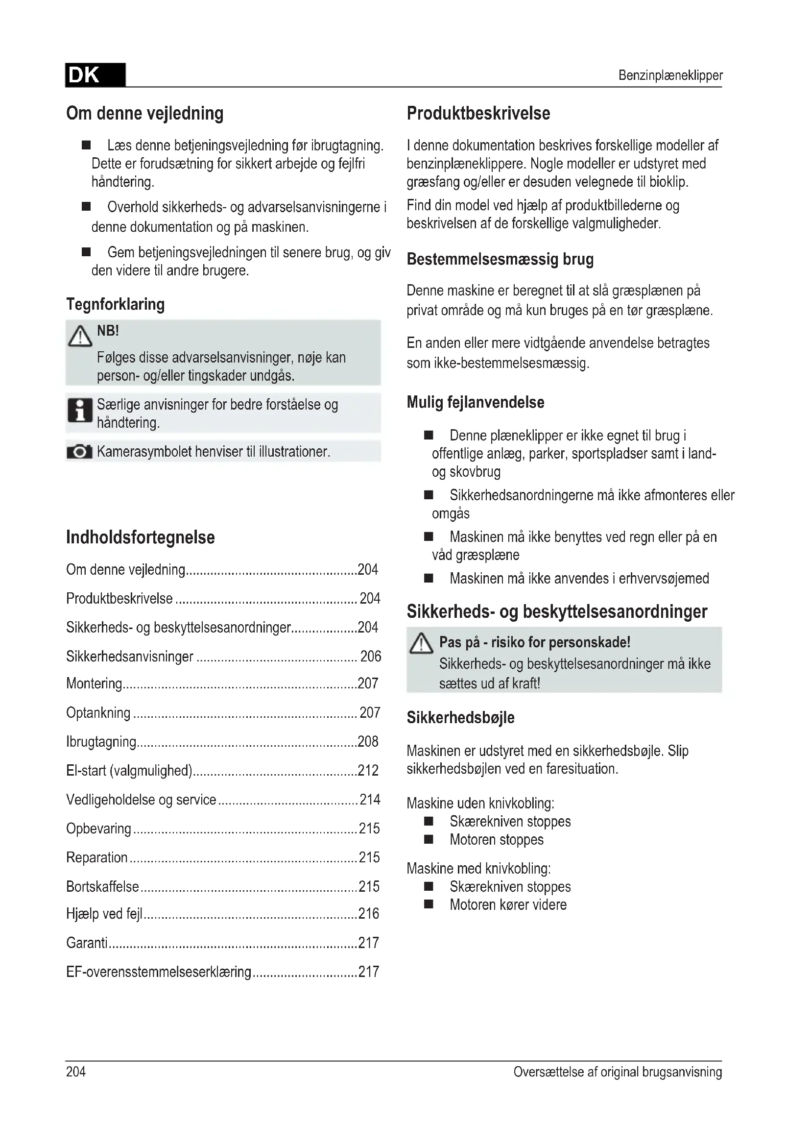 - EF-overensstemmelseserklæring Om denne vejledning Læs denne betjeningsvejledning før ibrugtagning. Dette er forudsætning for sikkert arbejde og fejlfri håndtering. Overhold sikkerheds- og advarselsanvisningerne i denne dokumentation og på maskinen. Gem betjeningsvejledningen til senere brug, og giv den videre til andre brugere. Tegnforklaring NB! Følges disse advarselsanvisninger, nøje kan person- og/eller tingskader undgås. Særlige anvisninger for bedre forståelse og håndtering. Kamerasymbolet henviser til illustrationer. Produktbeskrivelse I denne dokumentation beskrives forskellige modeller af benzinplæneklippere. Nogle modeller er udstyret med græsfang og/eller er desuden velegnede til bioklip. Find din model ved hjælp af produktbillederne og beskrivelsen af de forskellige valgmuligheder. Bestemmelsesmæssig brug Denne maskine er beregnet til at slå græsplænen på privat område og må kun bruges på en tør græsplæne. En anden eller mere vidtgående anvendelse betragtes som ikke-bestemmelsesmæssig. Mulig fejlanvendelse Denne plæneklipper er ikke egnet til brug i offentlige anlæg, parker, sportspladser samt i land- og skovbrug Sikkerhedsanordningerne må ikke afmonteres eller omgås Maskinen må ikke benyttes ved regn eller på en våd græsplæne Maskinen må ikke anvendes i erhvervsøjemed Sikkerheds- og beskyttelsesanordninger Pas på - risiko for personskade! Sikkerheds- og beskyttelsesanordninger må ikke sættes ud af kraft! Sikkerhedsbøjle Maskinen er udstyret med en sikkerhedsbøjle. Slip sikkerhedsbøjlen ved en faresituation. Maskine uden knivkobling: Skærekniven stoppes Motoren stoppes Maskine med knivkobling: Skærekniven stoppes Motoren kører videreDK 205470 592_c 1 Startsnor 9 Indstilling af klippehøjde* 2 Start, Stop* 10 Knivkobling* 3 Hjuldrev* 11 Variogear* 4 Sikkerhedsbøjle 12 Brugsvejledning 5 Ergonomisk højdeindstilling* 13 Udkastelement* 6 Benzinstandsvisning* 14 Lukkeklap* 7 Prelklap* 15 Biosæt* 8 Græsfang* * alt efter udførelse Symboler på maskinen NB! Særlig forsigtighed ved håndtering. Træk stikket til tændrøret ud, før du arbejder på skæret. Læs brugsanvisningen før ibrugtagning! Løsn motordremsen. Hold uvedkommende væk fra fareområdet! Kobl hjuldrevet til. Hold hænder og fødder væk fra skæreværket! p. 217