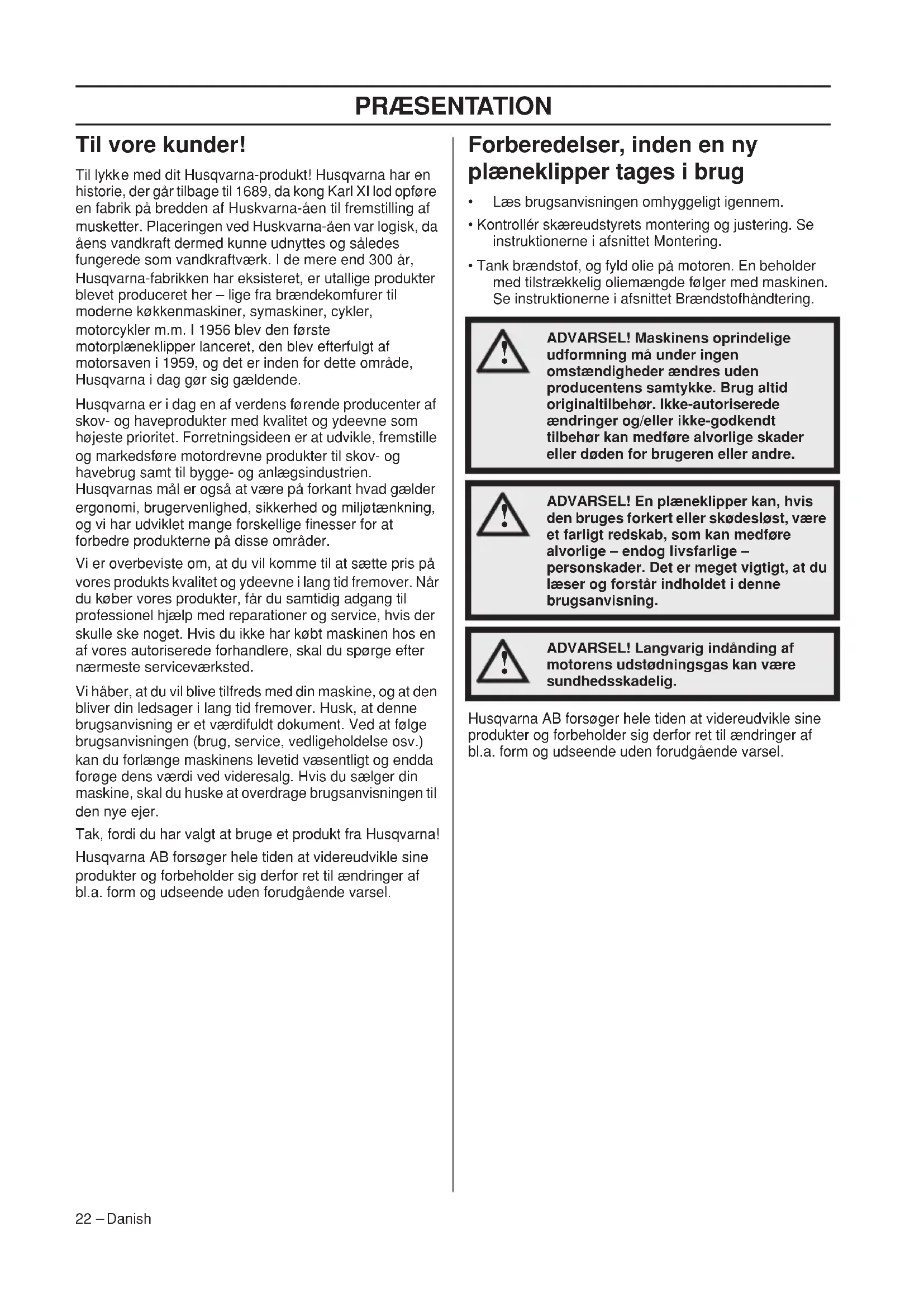 Danish Til v ore kunder! Til lykk e med dit Husqvarna-produkt! Husqvarna har en historie, der går tilbage til 1689, da kong Karl XI lod opføre en fabrik på bredden af Huskvarna-åen til fremstilling af musketter. Placeringen ved Huskvarna-åen var logisk, da åens vandkraft dermed kunne udnyttes og således fungerede som vandkraftværk. I de mere end 300 år, Husqvarna-fabrikken har eksisteret, er utallige produkter blevet produceret her – lige fra brændekomfurer til moderne køkkenmaskiner, symaskiner, cykler, motorcykler m.m. I 1956 blev den første motorplæneklipper lanceret, den blev efterfulgt af motorsaven i 1959, og det er inden for dette område, Husqvarna i dag gør sig gældende. Husqvarna er i dag en af verdens førende producenter af skov- og haveprodukter med kvalitet og ydeevne som højeste prioritet. Forretningsideen er at udvikle, fremstille og markedsføre motordrevne produkter til skov- og havebrug samt til bygge- og anlægsindustrien. Husqvarnas mål er også at være på forkant hvad gælder ergonomi, brugervenlighed, sikkerhed og miljøtænkning, og vi har udviklet mange forskellige finesser for at forbedre produkterne på disse områder. Vi er overbeviste om, at du vil komme til at sætte pris på vores produkts kvalitet og ydeevne i lang tid fremover. Når du køber vores produkter, får du samtidig adgang til professionel hjælp med reparationer og service, hvis der skulle ske noget. Hvis du ikke har købt maskinen hos en af vores autoriserede forhandlere, skal du spørge efter nærmeste serviceværksted. Vi håber, at du vil blive tilfreds med din maskine, og at den bliver din ledsager i lang tid fremover. Husk, at denne brugsanvisning er et værdifuldt dokument. Ved at følge brugsanvisningen (brug, service, vedligeholdelse osv.) kan du forlænge maskinens levetid væsentligt og endda forøge dens værdi ved videresalg. Hvis du sælger din maskine, skal du huske at overdrage brugsanvisningen til den nye ejer. Tak, fordi du har valgt at bruge et produkt fra Husqvarna! Husqvarna AB forsøger hele tiden at videreudvikle sine produkter og forbeholder sig derfor ret til ændringer af bl.a. form og udseende uden forudgående varsel. Forberedelser , inden en ny plæneklipper tages i brug