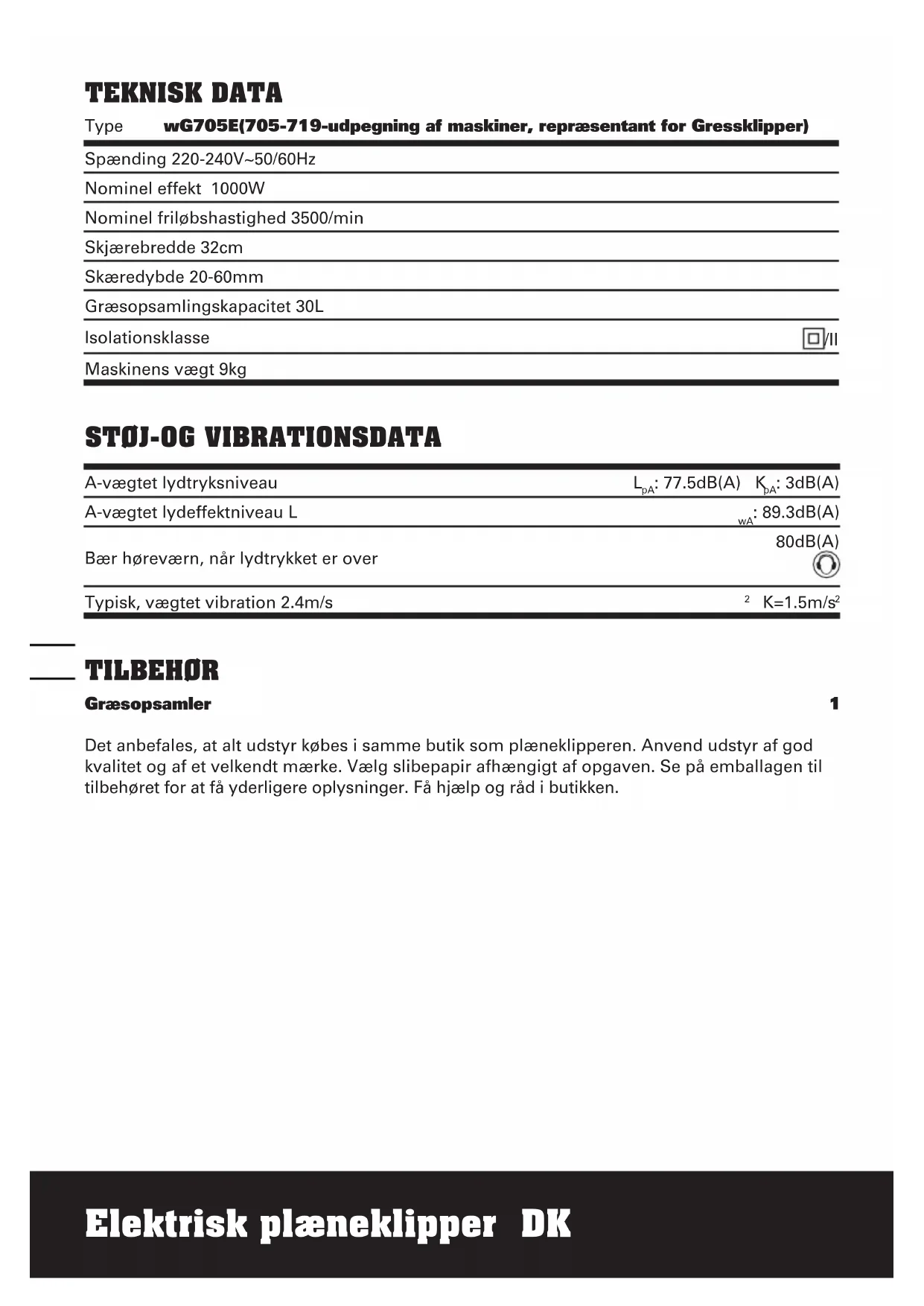 TEKNISK DATA Type wG705E(705-719-udpegning af maskiner, repræsentant for Gressklipper) Spænding 220-240V~50/60Hz Nominel effekt 1000W Nominel friløbshastighed 3500/min Skjærebredde 32cm Skæredybde 20-60mm Græsopsamlingskapacitet 30L Isolationsklasse /II Maskinens vægt 9kg