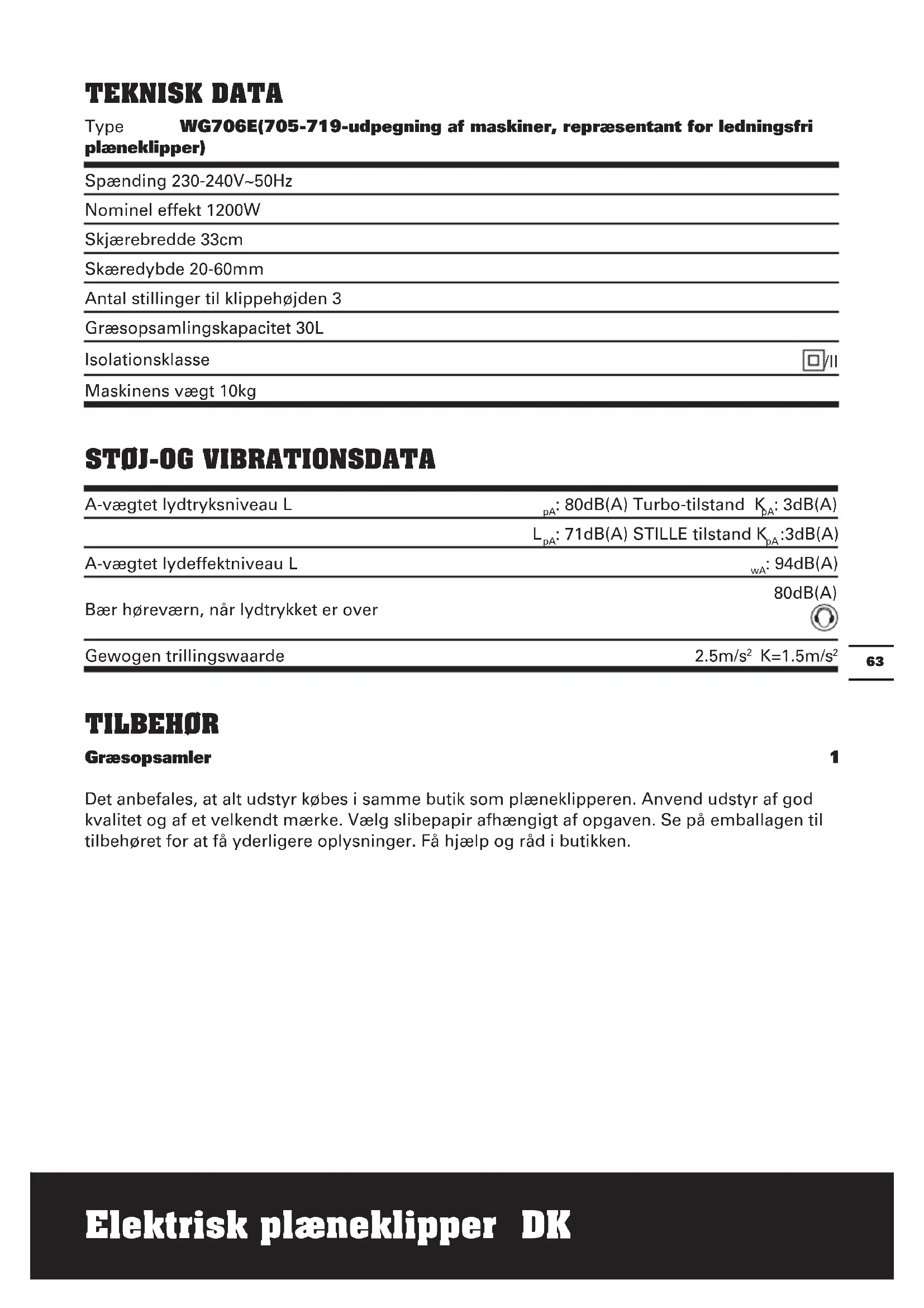 Elektrisk plæneklipper DK TEKNISK DATA Type WG706E(705-719-udpegning af maskiner, repræsentant for ledningsfri plæneklipper) Spænding 230-240V~50Hz Nominel effekt 1200W Skjærebredde 33cm Skæredybde 20-60mm Antal stillinger til klippehøjden 3 Græsopsamlingskapacitet 30L Isolationsklasse /II Maskinens vægt 10kg