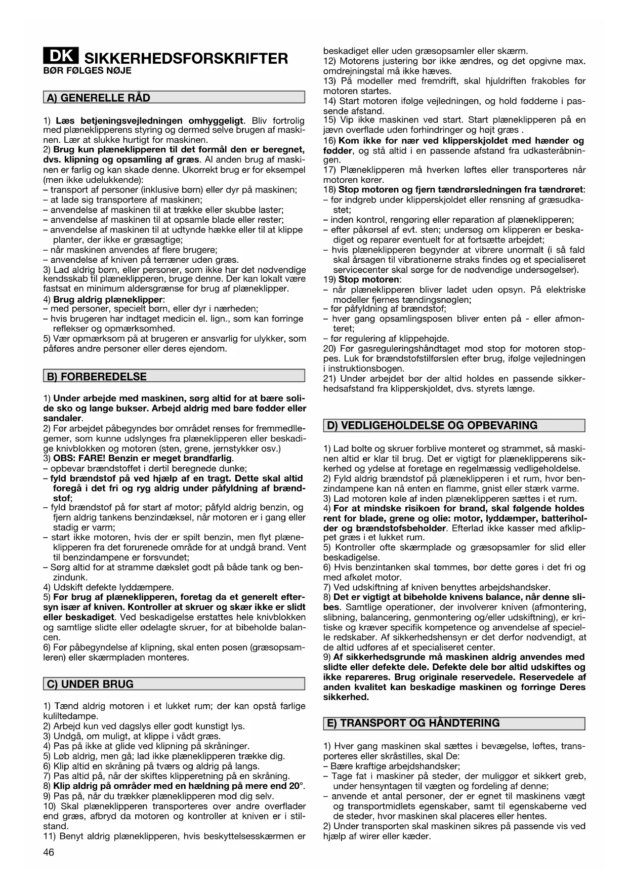 håndtag (1) mod styrehåndtaget og træk i startkablets greb med faste ryk (2). For at opnå det bedste resultat af klipningen, anbe- fales det at anvende den samme klippehøjde og at skifte køreretning. ET PAR RÅD TIL PLEJE AF GRÆSPLÆNEN Forskellige typer af græs har hver sine egenskaber og kan derfor kræve, at de skal pleje på forskellig vis. Læs altid anvisningerne på græsfrøets pakning hvad angår klippe- højde i forhold til vækstbetingelserne på det område, hvor man arbejder. Vær opmærksom på, at de fleste typer græs består af en stilk og et eller flere blade. Hvis bladene klippes fuldstæn- digt, vil plænen blive beskadiget og genvæksten bliver van- skeligere. Som tommelfingerregel kan man holde sig til nedenståen- de anvisninger: – en alt for lav klipning medfører afrivninger og udtyndin- ger i græsmåtten, med et "plettet" udseende; – om sommeren skal klipningen være højere for at undgå, at jorden tørrer ud; – klip ikke græsset, mens det er vådt - dette kan reducere knivens effektivitet på grund af græs, der sætter sig fast på kniven, og kan medføre afrivninger i græsmåtten; – i tilfælde af særligt højt græs bør der først klippes ved den største højde, som maskinen tillader, og derefter klippe igen efter 2-3 dage. Efter brug slippes bremsegrebet (1) og tændrørs- ledningen (2) tages ud. VENT, TIL KNIVEN ER STANDSET, inden der foretages et hvilket som helst indgreb. VIGTIG – En regelmæssig og omhyggelig vedligeholdel- se er uundgåelig for at fastholde maskinens sikker- hedsniveauer og ydelser gennem tiden. Opbevar plæneklipperen på et tørt sted.