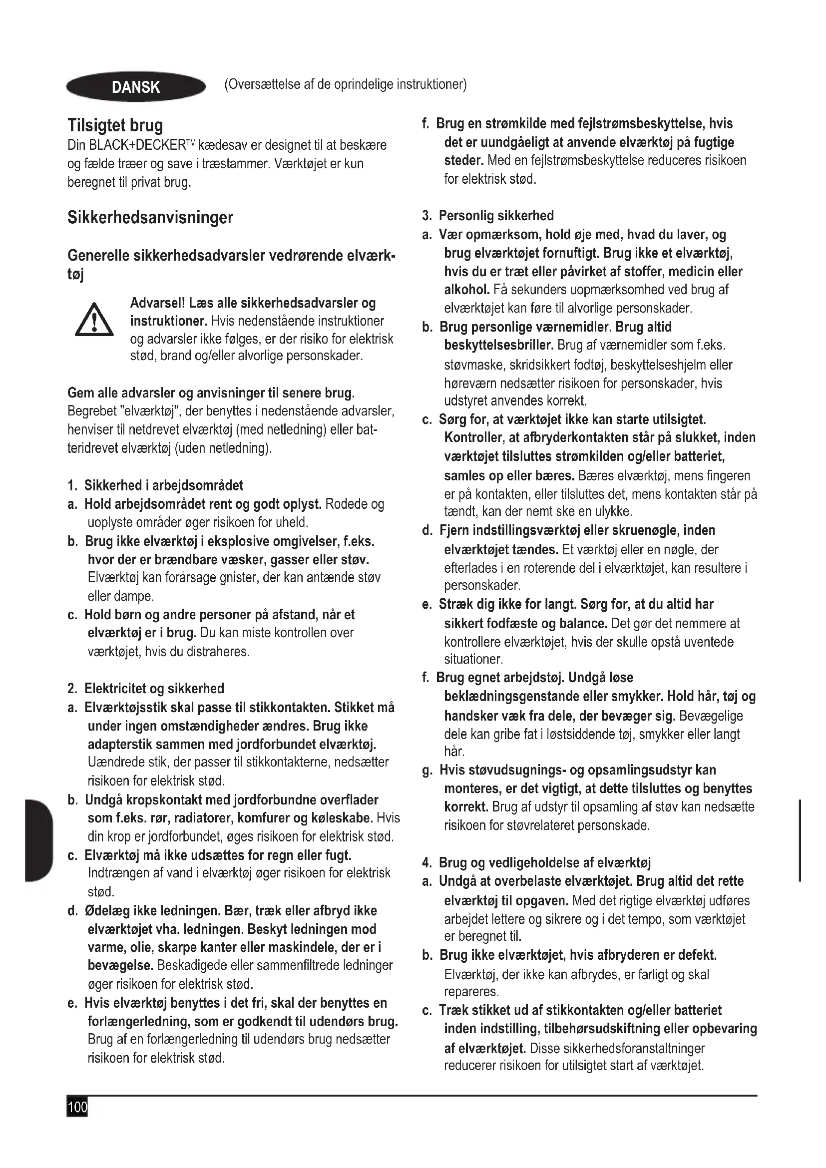 (Oversættelse af de oprindelige instruktioner) DANSK u Værktøjet er nu klar til brug. Tænd Bemærk! Det er ikke muligt at tænde for værktøjet, hvis forsideskærmen/kædebremsen ikke er i den ”indstillede” position. u Hold fast i kædesaven med begge hænder. Tryk på låseknappen (2), og derefter på tænd/sluk-kontakten (1) for at starte. u Når motoren starter, skal du fjerne tommelngeren fra låseknappen (2) og gribe fast om håndtaget. Overbelast ikke værktøjet, lad værktøjet gøre arbejdet. Værktøjet arbejder bedre og sikrere med den hastighed, det er designet til. Savkæden (5) udvider sig, hvis den udsættes for pres. Sådan fungerer anti-tilbageslagskædebremsen I tilfælde af tilbageslag kommer din venstre hånd i kontakt med forsideskærmen og skubber den fremad mod arbejd- semnet, så værktøjet standses på en brøkdel af et sekund. Sådan testes anti-tilbageslagskædebremsen (g. A) u Kontroller altid inden brug, at tilbageslagsbremsen fun- gerer korrekt. u Grib fast om værktøjet med begge hænder på en fast overade. Sørg for, at savkæden (5) er fri af jorden, og tænd for værktøjet (se afsnittet ”Sådan tændes for kæde- saven”). u Drej venstre hånd fremad omkring det forreste håndtag, så bagsiden af hånden rører ved forsideskærmen/kæde- bremsen (3), og skub den fremad mod arbejdsemnet (g. A). Savkæden (5) skal nu standse på en brøkdel af et sekund. Følg anvisningerne for "Sådan indstilles kæde- bremsen" for at nulstille efter betjening af forsideskærmen/ kædebremsen (3). Bemærk! Undgå at genstarte værktøjet, indtil du kan høre, at motoren er helt standset. Bemærk: Indlever produktet til et autoriseret BLACK+DECKER-servicecenter, hvis kædebremsen ikke fungerer korrekt. Hvis savkæden (5) eller sværdet (4) kommer i klemme u Sluk værktøjet. u Træk værktøjets ledning ud af stikkontakten. u Åbn snittet med kiler for at mindske belastningen på sværdet (4). Prøv ikke at vride kædesaven fri. u Sav igen et nyt sted. Fældning (g. I - K) Uerfarne brugere bør ikke forsøge at fælde træer. Brugeren kan komme til skade eller beskadige ejendom, hvis faldretnin- gen ikke kontrolleres, træet kan splintre, eller beskadigede/ døde grene kan falde ned under savningen. Sikkerhed- safstanden mellem et træ, der skal fældes, og tilskuere, bygninger og andre genstande er mindst 2 1/2 gange træets højde. Enhver anden person, bygning eller genstand inden for denne afstand risikerer at blive ramt af træet, når det fældes. Før du forsøger at fælde et træ: u Kontroller, at der ikke er lokale vedtægter eller bestemmel- ser, som forbyder eller begrænser fældning af træer. u Tag alle forhold, som kan påvirke faldretningen, i betragt- ning, herunder: u Den tilsigtede faldretning. u Træets naturlige hældning. u En usædvanligt tung stammestruktur eller forrådnelse. u Omkringstående træer og hindringer inkl. el-ledninger og underjordiske rør. u Vindens hastighed og retning. Planlæg en sikker ugtvej fra faldende træer eller grene. Sørg for, at denne ugtvej er fri for genstande, der kan forhindre el- ler besværliggøre bevægelse. Husk, at vådt græs og nyskåret bark er glat. u Forsøg ikke at fælde træer, hvis diameter er større end kædesavens skærelængde. u Sav et retningssnit for at bestemme faldretningen. u Lav et vandret snit til en dybde af mellem 1/5 og 1/3 af træets diameter vinkelret på faldlinjen nederst på træet (g. I). u Lav yderligere et snit ovenfra, så det skærer det første i en vinkel på omkring 45°. u Skær et enkelt vandret fældningssnit fra den anden side 25 mm til 50 mm over midten af retningssnittet. (g. J). Undgå at skære igennem til retningssnittet, da du kan miste kontrollen med faldretningen. u Driv én eller ere kiler ind i dette snit for at åbne det og få træet til at falde (g. K). Beskæring af træer Kontroller, at der ikke er lokale vedtægter eller bestemmelser, som forbyder eller begrænser beskæring af træer. Beskæring må kun udføres af erfarne brugere, da der er forøget risiko for, at savkæden klemmes fast og medfører tilbageslag. Før beskæring skal du overveje de forhold, der påvirker faldretningen, bl.a.: u Længde og vægt af den gren, der skal skæres af. u En usædvanligt tung stammestruktur eller forrådnelse. u Omkringstående træer og hindringer inkl. el-ledninger. u Vindens hastighed og retning.106 (Oversættelse af de oprindelige instruktioner) DANSK