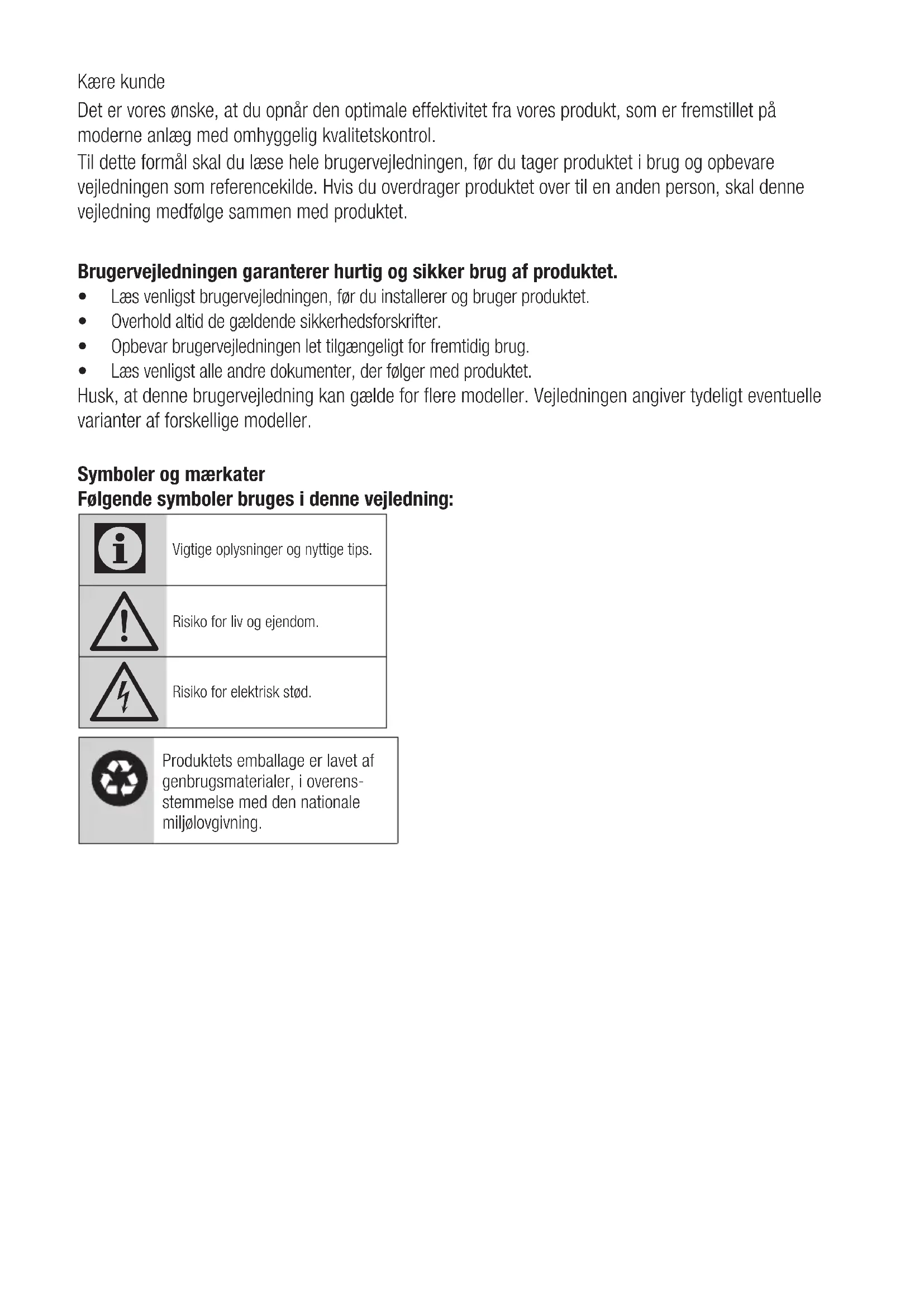 RECOMENDAÇÕES: Se os problemas persistirem depois de seguir as instruções nesta secção, contactar o seu vendedor ou uma Assistência Autorizada. Não tentar reparar o produto.Kære kunde Det er vores ønske, at du opnår den optimale effektivitet fra vores produkt, som er fremstillet på moderne anlæg med omhyggelig kvalitetskontrol. Til dette formål skal du læse hele brugervejledningen, før du tager produktet i brug og opbevare vejledningen som referencekilde. Hvis du overdrager produktet over til en anden person, skal denne vejledning medfølge sammen med produktet. Brugervejledningen garanterer hurtig og sikker brug af produktet. t Læs venligst brugervejledningen, før du installerer og bruger produktet. t Overhold altid de gældende sikkerhedsforskrifter. t Opbevar brugervejledningen let tilgængeligt for fremtidig brug. t Læs venligst alle andre dokumenter, der følger med produktet. Husk, at denne brugervejledning kan gælde for flere modeller. Vejledningen angiver tydeligt eventuelle varianter af forskellige modeller. Symboler og mærkater Følgende symboler bruges i denne vejledning: