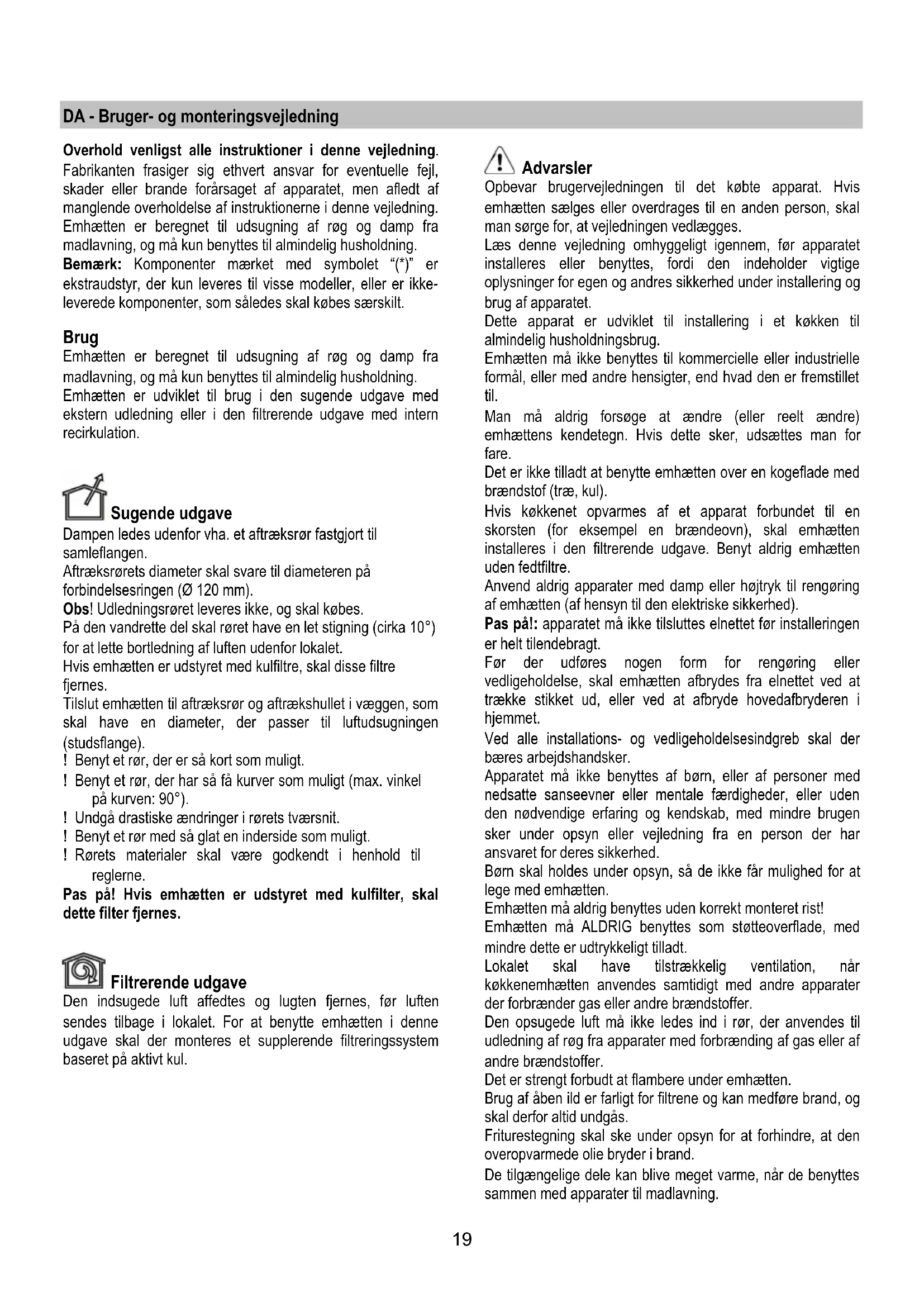 - Eftersalgsservice DA - Bruger- og monteringsvejledning Overhold venligst alle instruktioner i denne vejledning. Fabrikanten frasiger sig ethvert ansvar for eventuelle fejl, skader eller brande forårsaget af apparatet, men afledt af manglende overholdelse af instruktionerne i denne vejledning. Emhætten er beregnet til udsugning af røg og damp fra madlavning, og må kun benyttes til almindelig husholdning. Bemærk: Komponenter mærket med symbolet “(*)” er ekstraudstyr, der kun leveres til visse modeller, eller er ikke- leverede komponenter, som således skal købes særskilt. Brug Emhætten er beregnet til udsugning af røg og damp fra madlavning, og må kun benyttes til almindelig husholdning. Emhætten er udviklet til brug i den sugende udgave med ekstern udledning eller i den filtrerende udgave med intern recirkulation. Sugende udgave Dampen ledes udenfor vha. et aftræksrør fastgjort til samleflangen. Aftræksrørets diameter skal svare til diameteren på forbindelsesringen (Ø 120 mm). Obs! Udledningsrøret leveres ikke, og skal købes. På den vandrette del skal røret have en let stigning (cirka 10°) for at lette bortledning af luften udenfor lokalet. Hvis emhætten er udstyret med kulfiltre, skal disse filtre fjernes. Tilslut emhætten til aftræksrør og aftrækshullet i væggen, som skal have en diameter, der passer til luftudsugningen (studsflange). ! Benyt et rør, der er så kort som muligt. ! Benyt et rør, der har så få kurver som muligt (max. vinkel på kurven: 90°). ! Undgå drastiske ændringer i rørets tværsnit. ! Benyt et rør med så glat en inderside som muligt. ! Rørets materialer skal være godkendt i henhold til reglerne. Pas på! Hvis emhætten er udstyret med kulfilter, skal dette filter fjernes. Filtrerende udgave Den indsugede luft affedtes og lugten fjernes, før luften sendes tilbage i lokalet. For at benytte emhætten i denne udgave skal der monteres et supplerende filtreringssystem baseret på aktivt kul. Advarsler Opbevar brugervejledningen til det købte apparat. Hvis emhætten sælges eller overdrages til en anden person, skal man sørge for, at vejledningen vedlægges. Læs denne vejledning omhyggeligt igennem, før apparatet installeres eller benyttes, fordi den indeholder vigtige oplysninger for egen og andres sikkerhed under installering og brug af apparatet. Dette apparat er udviklet til installering i et køkken til almindelig husholdningsbrug. Emhætten må ikke benyttes til kommercielle eller industrielle formål, eller med andre hensigter, end hvad den er fremstillet til. Man må aldrig forsøge at ændre (eller reelt ændre) emhættens kendetegn. Hvis dette sker, udsættes man for fare. Det er ikke tilladt at benytte emhætten over en kogeflade med brændstof (træ, kul). Hvis køkkenet opvarmes af et apparat forbundet til en skorsten (for eksempel en brændeovn), skal emhætten installeres i den filtrerende udgave. Benyt aldrig emhætten uden fedtfiltre. Anvend aldrig apparater med damp eller højtryk til rengøring af emhætten (af hensyn til den elektriske sikkerhed). Pas på!: apparatet må ikke tilsluttes elnettet før installeringen er helt tilendebragt. Før der udføres nogen form for rengøring eller vedligeholdelse, skal emhætten afbrydes fra elnettet ved at trække stikket ud, eller ved at afbryde hovedafbryderen i hjemmet. Ved alle installations- og vedligeholdelsesindgreb skal der bæres arbejdshandsker. Apparatet må ikke benyttes af børn, eller af personer med nedsatte sanseevner eller mentale færdigheder, eller uden den nødvendige erfaring og kendskab, med mindre brugen sker under opsyn eller vejledning fra en person der har ansvaret for deres sikkerhed. Børn skal holdes under opsyn, så de ikke får mulighed for at lege med emhætten. Emhætten må aldrig benyttes uden korrekt monteret rist! Emhætten må ALDRIG benyttes som støtteoverflade, med mindre dette er udtrykkeligt tilladt. Lokalet skal have tilstrækkelig ventilation, når køkkenemhætten anvendes samtidigt med andre apparater der forbrænder gas eller andre brændstoffer. Den opsugede luft må ikke ledes ind i rør, der anvendes til udledning af røg fra apparater med forbrænding af gas eller af andre brændstoffer. Det er strengt forbudt at flambere under emhætten. Brug af åben ild er farligt for filtrene og kan medføre brand, og skal derfor altid undgås. Friturestegning skal ske under opsyn for at forhindre, at den overopvarmede olie bryder i brand. De tilgængelige dele kan blive meget varme, når de benyttes sammen med apparater til madlavning.20 Hvad angår de nødvendige tekniske forholdsregler og sikkerhedskrav for udledning af røg, skal alle reglementer fra de lokale myndigheder overholdes uden undtagelse. Emhætten skal rengøres ofte, både indvendigt og udvendigt (MINDST EN GANG OM MÅNEDEN; overhold under alle omstændigheder angivelserne i kapitlet om vedligeholdelse i denne vejledning). Manglende overholdelse af kravene for rengøring af emhætten, og for udskiftning og rengøring af filtrene, medfører brandfare. Emhætten må hverken benyttes eller efterlades uden korrekt indsatte lyspærer pga. fare for elektrisk stød. Fabrikanten fralægger sig ethvert ansvar for eventuelle fejl, skader eller brand forårsaget af apparatet, men afledt af manglende overholdelse af instruktionerne i denne vejledning. Installering Minimumsafstanden mellem kogegrejets støtteoverflade på komfuret og den nederste del af emhætten må ikke være under 50cm ved elektriske kogeplader, og ikke under 65cm ved gasblus eller komfurer med både gasblus og elektriske kogeplader. Hvis gaskomfurets vejledning angiver en større afstand, skal dette overholdes. Elektrisk tilslutning Netspændingen skal svare til spændingen vist på typeskiltet internt i emhætten. Hvis emhætten er udstyret med et stik, skal emhætten tilsluttes en let tilgængelig stikkontakt, der er i overensstemmelse med de gældende standarder. Stikkontakten skal også være let 