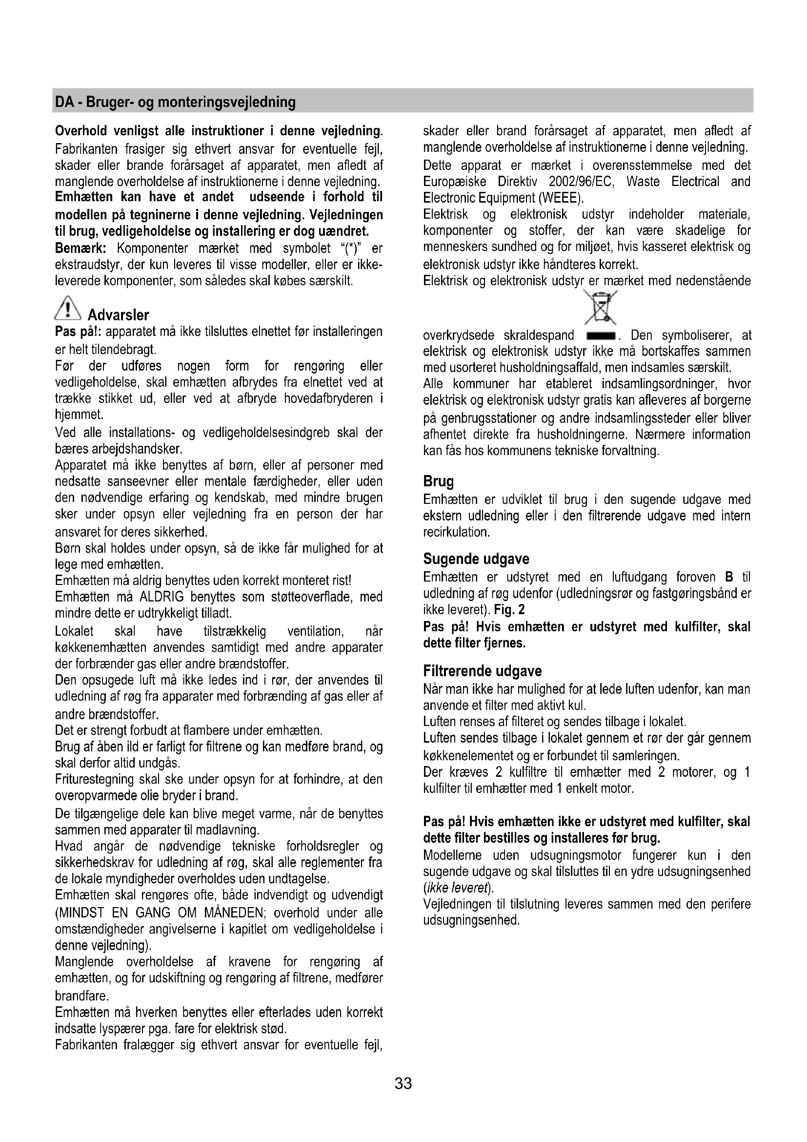 Na het glas gereinigd te hebben de handelingen in de tegengestelde volgorde uitvoeren. Vetfilter Moet eenmaal per maand worden gereinigd met neutrale reinigingsmiddelen, met de hand of in de vaatwasmachine op lage temperaturen en met een kort programma. Door hem in de vaatwasmachine te wassen kan het metalen vetfilter ontkleuren, maar dit is niet van invloed op de eigenschappen, die beslist niet veranderen. Om het vetfilter te demonteren trekt u aan de veerbelaste ontgrendelingshandgreep. afb. 9 Koolstoffilter (alleen voor filterend apparaat) Houdt de lastige kookgeuren vast. Voor de wasemkap met 2 afzuigmotoren zijn 2 koolstoffilters nodig en 1 koolstoffilter voor de kap met 1 motor. De verzadiging van de koolstoffilter vindt plaats na een min of meer geprolongeerd gebruik en hangt af van het soort koken en de regelmaat waarmee de vetfilter wordt gewassen. In ieder geval moet de filter minstens om de 4 maanden vervangen worden. Het kan NIET gewassen of opnieuw gebruikt worden afb. 10 Plaats het koolstoffilter op het beschermrooster van het motorwiel, draai dan de centrale handgreep P van het filter met de klok mee. Om het weer te demonteren de centrale handgreep P van het filter tegen de klok in draaien. Vervanging lampjes afb. 11 Sluit de stroom af. Attentie! Alvorens de lampjes aan te raken controleer eerst of ze koud zijn. De lamphouder bereiken: verwijder de lamphouder door middel van een kleine rechte schroevedraaier of een gelijksoortig voorwerp. Vervang het beschadigde lampje. Naargelang het model in Uw bezit: Gebruik lampjes van max. 40W (E14) of halogeenlampjes van max. 20W (G4 12V) Sluit de lamphouder weer af (klik- verbinding). Als de verlichting niet werkt, controleer dan of de lampjes goed op hun plaats zitten alvorens de assistentiedienst te bellen.33 DA - Bruger- og monteringsvejledning Overhold venligst alle instruktioner i denne vejledning. Fabrikanten frasiger sig ethvert ansvar for eventuelle fejl, skader eller brande forårsaget af apparatet, men afledt af manglende overholdelse af instruktionerne i denne vejledning. Emhætten kan have et andet udseende i forhold til modellen på tegninerne i denne vejledning. Vejledningen til brug, vedligeholdelse og installering er dog uændret. Bemærk: Komponenter mærket med symbolet “(*)” er ekstraudstyr, der kun leveres til visse modeller, eller er ikke- leverede komponenter, som således skal købes særskilt. Advarsler Pas på!: apparatet må ikke tilsluttes elnettet før installeringen er helt tilendebragt. Før der udføres nogen form for rengøring eller vedligeholdelse, skal emhætten afbrydes fra elnettet ved at trække stikket ud, eller ved at afbryde hovedafbryderen i hjemmet. Ved alle installations- og vedligeholdelsesindgreb skal der bæres arbejdshandsker. Apparatet må ikke benyttes af børn, eller af personer med nedsatte sanseevner eller mentale færdigheder, eller uden den nødvendige erfaring og kendskab, med mindre brugen sker under opsyn eller vejledning fra en person der har ansvaret for deres sikkerhed. Børn skal holdes under opsyn, så de ikke får mulighed for at lege med emhætten. Emhætten må aldrig benyttes uden korrekt monteret rist! Emhætten må ALDRIG benyttes som støtteoverflade, med mindre dette er udtrykkeligt tilladt. Lokalet skal have tilstrækkelig ventilation, når køkkenemhætten anvendes samtidigt med andre apparater der forbrænder gas eller andre brændstoffer. Den opsugede luft må ikke ledes ind i rør, der anvendes til udledning af røg fra apparater med forbrænding af gas eller af andre brændstoffer. Det er strengt forbudt at flambere under emhætten. Brug af åben ild er farligt for filtrene og kan medføre brand, og skal derfor altid undgås. Friturestegning skal ske under opsyn for at forhindre, at den overopvarmede olie bryder i brand. De tilgængelige dele kan blive meget varme, når de benyttes sammen med apparater til madlavning. Hvad angår de nødvendige tekniske forholdsregler og sikkerhedskrav for udledning af røg, skal alle reglementer fra de lokale myndigheder overholdes uden undtagelse. Emhætten skal rengøres ofte, både indvendigt og udvendigt (MINDST EN GANG OM MÅNEDEN; overhold under alle omstændigheder angivelserne i kapitlet om vedligeholdelse i denne vejledning). Manglende overholdelse af kravene for rengøring af emhætten, og for udskiftning og rengøring af filtrene, medfører brandfare. Emhætten må hverken benyttes eller efterlades uden korrekt indsatte lyspærer pga. fare for elektrisk stød. Fabrikanten fralægger sig ethvert ansvar for eventuelle fejl, skader eller brand forårsaget af apparatet, men afledt af manglende overholdelse af instruktionerne i denne vejledning. Dette apparat er mærket i overensstemmelse med det Europæiske Direktiv 2002/96/EC, Waste Electrical and Electronic Equipment (WEEE). Elektrisk og elektronisk udstyr indeholder materiale, komponenter og stoffer, der kan være skadelige for menneskers sundhed og for miljøet, hvis kasseret elektrisk og elektronisk udstyr ikke håndteres korrekt. Elektrisk og elektronisk udstyr er mærket med nedenstående overkrydsede skraldespand . Den symboliserer, at elektrisk og elektronisk udstyr ikke må bortskaffes sammen med usorteret husholdningsaffald, men indsamles særskilt. Alle kommuner har etableret indsamlingsordninger, hvor elektrisk og elektronisk udstyr gratis kan afleveres af borgerne på genbrugsstationer og andre indsamlingssteder eller bliver afhentet direkte fra husholdningerne. Nærmere information kan fås hos kommunens tekniske forvaltning. Brug Emhætten er udviklet til brug i den sugende udgave med ekstern udledning eller i den filtrerende udgave med intern recirkulation. Sugende udgave Emhætten er udstyret med en luftudgang foroven B til udledning af røg udenfor (udledningsrør og fastgøringsbånd er ikke leveret). Fig. 2 Pas på! Hvis emhætten er udstyret med kulfilter, skal dette filter fjernes. Filtrerende udgave Når man ikke har mulighed for at lede 