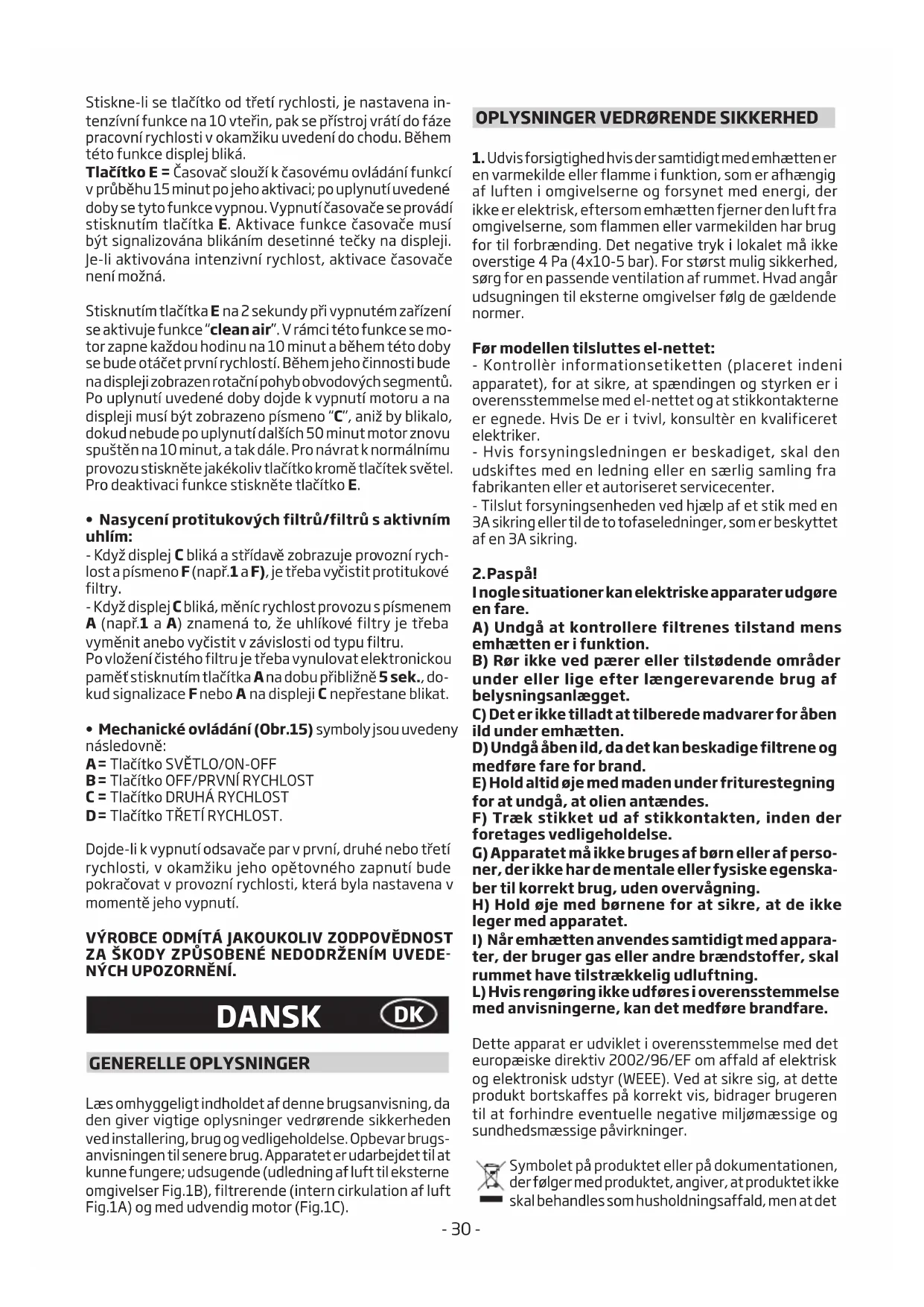 ter, der bruger gas eller andre brændstoffer, skal rummet have tilstrækkelig udluftning. L) Hvis rengøring ikke udføres i overensstemmelse med anvisningerne, kan det medføre brandfare. Dette apparat er udviklet i overensstemmelse med det europæiske direktiv 2002/96/EF om affald af elektrisk og elektronisk udstyr (WEEE). Ved at sikre sig, at dette produkt bortskaffes på korrekt vis, bidrager brugeren til at forhindre eventuelle negative miljømæssige og sundhedsmæssige påvirkninger. Symbolet på produktet eller på dokumentationen, der følger med produktet, angiver, at produktet ikke skal behandles som husholdningsaffald, men at det- 31 - skal bortskaffes på passende vis på genbrugsstationer til elektriske og elektroniske apparater. Apparatet skal bortskaffes i overensstemmelse med de gældende regler for bortskaffelse af affald. For yderligere oplys- ninger om håndtering, genvinding og genbrug af dette produkt, bedes man kontakte de lokale myndigheder, teknisk forvaltning eller forretningen, hvor produktet er købt.