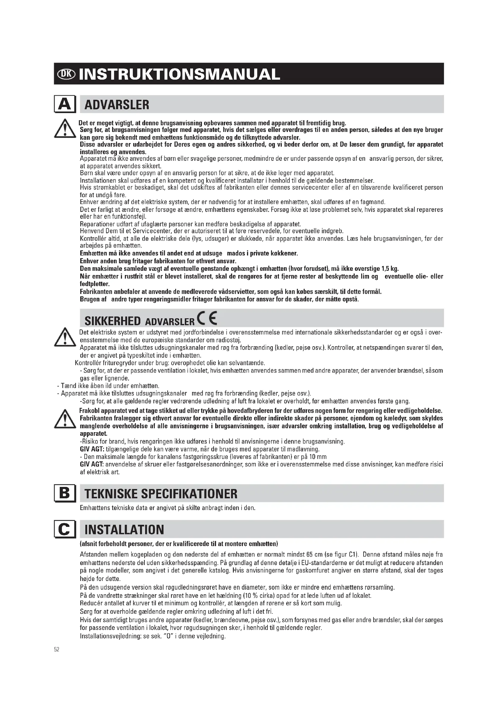 Det er meget vigtigt, at denne brugsanvisning opbevares sammen med apparatet til fremtidig brug. Sørg for, at brugsanvisningen følger med apparatet, hvis det sælges eller overdrages til en anden person, således at den nye bruger kan gøre sig bekendt med emhættens funktionsmåde og de tilknyttede advarsler. Disse advarsler er udarbejdet for Deres egen og andres sikkerhed, og vi beder derfor om, at De læser dem grundigt, før apparatet installeres og anvendes. Apparatet må ikke anvendes af børn eller svagelige personer, medmindre de er under passende opsyn af en ansvarlig person, der sikrer, at apparatet anvendes sikkert.Børn skal være under opsyn af en ansvarlig person for at sikre, at de ikke leger med apparatet.Installationen skal udføres af en kompetent og kvalificeret installatør i henhold til de gældende bestemmelser. Hvis strømkablet er beskadiget, skal det udskiftes af fabrikanten eller dennes servicecenter eller af en tilsvarende kvalificeret person for at undgå fare.Enhver ændring af det elektriske system, der er nødvendig for at installere emhætten, skal udføres af en fagmand. Det er farligt at ændre, eller forsøge at ændre, emhættens egenskaber. Forsøg ikke at løse problemet selv, hvis apparatet skal repareres eller har en funktionsfejl.Reparationer udført af ufaglærte personer kan medføre beskadigelse af apparatet.Henvend Dem til et Servicecenter, der er autoriseret til at føre reservedele, for eventuelle indgreb. Kontrollér altid, at alle de elektriske dele (lys, udsuger) er slukkede, når apparatet ikke anvendes. Læs hele brugsanvisningen, før der arbejdes på emhætten.Emhætten må ikke anvendes til andet end at udsuge mados i private køkkener.Enhver anden brug fritager fabrikanten for ethvert ansvar.Den maksimale samlede vægt af eventuelle genstande ophængt i emhætten (hvor forudset), må ikke overstige 1,5 kg. Når emhætter i rustfrit stål er blevet installeret, skal de rengøres for at fjerne rester af beskyttende lim og eventuelle olie- eller fedtpletter.Fabrikanten anbefaler at anvende de medleverede vådservietter, som også kan købes særskilt, til dette formål.Brugen af andre typer rengøringsmidler fritager fabrikanten for ansvar for de skader, der måtte opstå. SIKKERHED ADVARSLER Det elektriske system er udstyret med jordforbindelse i overensstemmelse med internationale sikkerhedsstandarder og er også i over- ensstemmelse med de europæiske standarder om radiostøj. Apparatet må ikke tilsluttes udsugningskanaler med røg fra forbrænding (kedler, pejse osv.). Kontroller, at netspændingen svarer til den, der er angivet på typeskiltet inde i emhætten. Kontrollér frituregryder under brug: overophedet olie kan selvantænde. - Sørg for, at der er passende ventilation i lokalet, hvis emhætten anvendes sammen med andre apparater, der anvender brændsel, såsom gas eller lignende. - Tænd ikke åben ild under emhætten. - Apparatet må ikke tilsluttes udsugningskanaler med røg fra forbrænding (kedler, pejse osv.). -Sørg for, at alle gældende regler vedrørende udledning af luft fra lokalet er overholdt, før emhætten anvendes første gang. Frakobl apparatet ved at tage stikket ud eller trykke på hovedafbryderen før der udføres nogen form for rengøring eller vedligeholdelse. Fabrikanten fralægger sig ethvert ansvar for eventuelle direkte eller indirekte skader på personer, ejendom og kæledyr, som skyldes manglende overholdelse af alle anvisningerne i brugsanvisningen, især advarsler omkring installation, brug og vedligeholdelse af apparatet.-Risiko for brand, hvis rengøringen ikke udføres i henhold til anvisningerne i denne brugsanvisning.GIV AGT: tilgængelige dele kan være varme, når de bruges med apparater til madlavning.- Den maksimale længde for kanalens fastgøringsskrue (leveres af fabrikanten) er på 10 mm GIV AGT: anvendelse af skruer eller fastgørelsesanordninger, som ikke er i overensstemmelse med disse anvisninger, kan medføre risici af elektrisk art. TEKNISKE SPECIFIKATIONER