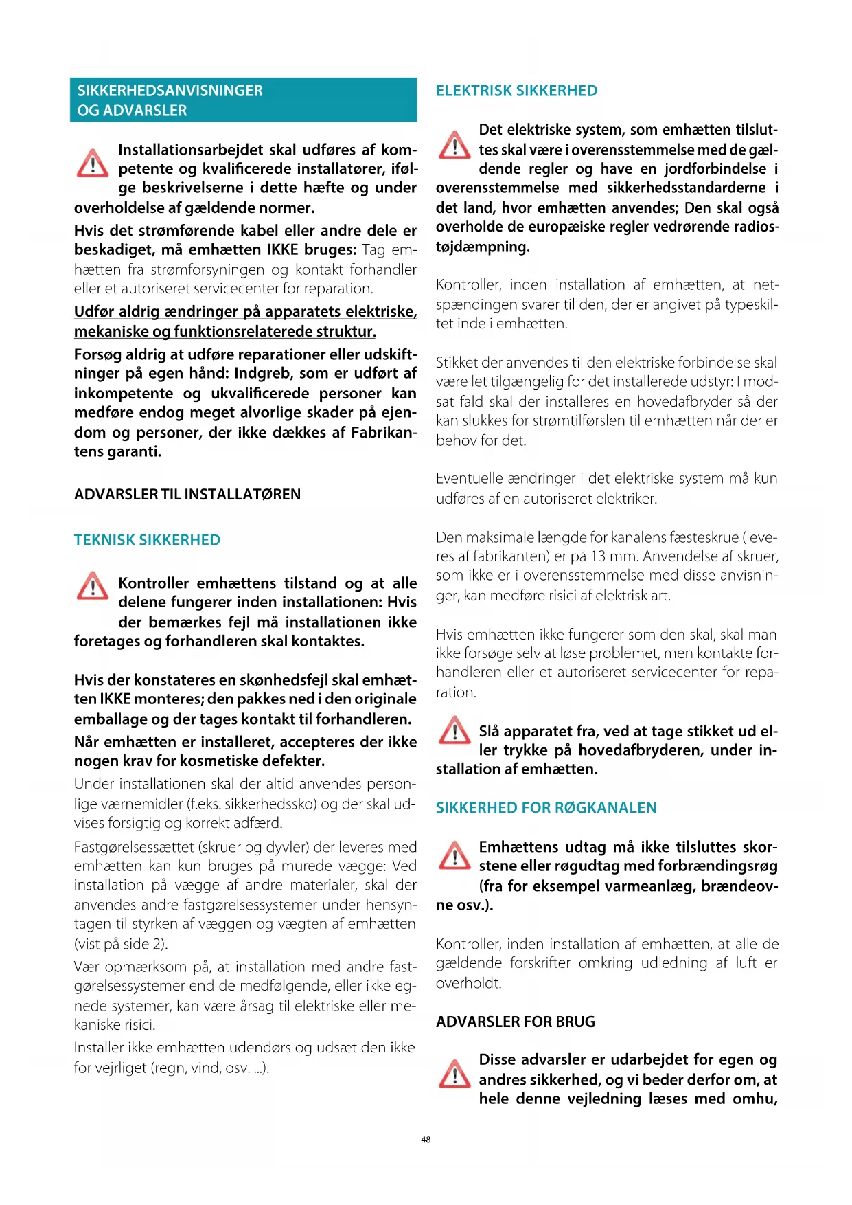 TEKNISK SIKKERHED Kontroller emhættens tilstand og at alle delene fungerer inden installationen: Hvis der bemærkes fejl må installationen ikke foretages og forhandleren skal kontaktes. Hvis der konstateres en skønhedsfejl skal emhæt- ten IKKE monteres; den pakkes ned i den originale emballage og der tages kontakt til forhandleren. Når emhætten er installeret, accepteres der ikke nogen krav for kosmetiske defekter. Under installationen skal der altid anvendes person- lige værnemidler (f.eks. sikkerhedssko) og der skal ud- vises forsigtig og korrekt adfærd. Fastgørelsessættet (skruer og dyvler) der leveres med emhætten kan kun bruges på murede vægge: Ved installation på vægge af andre materialer, skal der anvendes andre fastgørelsessystemer under hensyn- tagen til styrken af væggen og vægten af emhætten (vist på side 2). Vær opmærksom på, at installation med andre fast- gørelsessystemer end de medfølgende, eller ikke eg- nede systemer, kan være årsag til elektriske eller me- kaniske risici. Installer ikke emhætten udendørs og udsæt den ikke for vejrliget (regn, vind, osv. ...). ELEKTRISK SIKKERHED Det elektriske system, som emhætten tilslut- tes skal være i overensstemmelse med de gæl- dende regler og have en jordforbindelse i overensstemmelse med sikkerhedsstandarderne i det land, hvor emhætten anvendes; Den skal også overholde de europæiske regler vedrørende radios- tøjdæmpning. Kontroller, inden installation af emhætten, at net- spændingen svarer til den, der er angivet på typeskil- tet inde i emhætten. Stikket der anvendes til den elektriske forbindelse skal være let tilgængelig for det installerede udstyr: I mod- sat fald skal der installeres en hovedafbryder så der kan slukkes for strømtilførslen til emhætten når der er behov for det. Eventuelle ændringer i det elektriske system må kun udføres af en autoriseret elektriker. Den maksimale længde for kanalens fæsteskrue (leve- res af fabrikanten) er på 13 mm. Anvendelse af skruer, som ikke er i overensstemmelse med disse anvisnin- ger, kan medføre risici af elektrisk art. Hvis emhætten ikke fungerer som den skal, skal man ikke forsøge selv at løse problemet, men kontakte for- handleren eller et autoriseret servicecenter for repa- ration. Slå apparatet fra, ved at tage stikket ud el- ler trykke på hovedafbryderen, under in- stallation af emhætten.