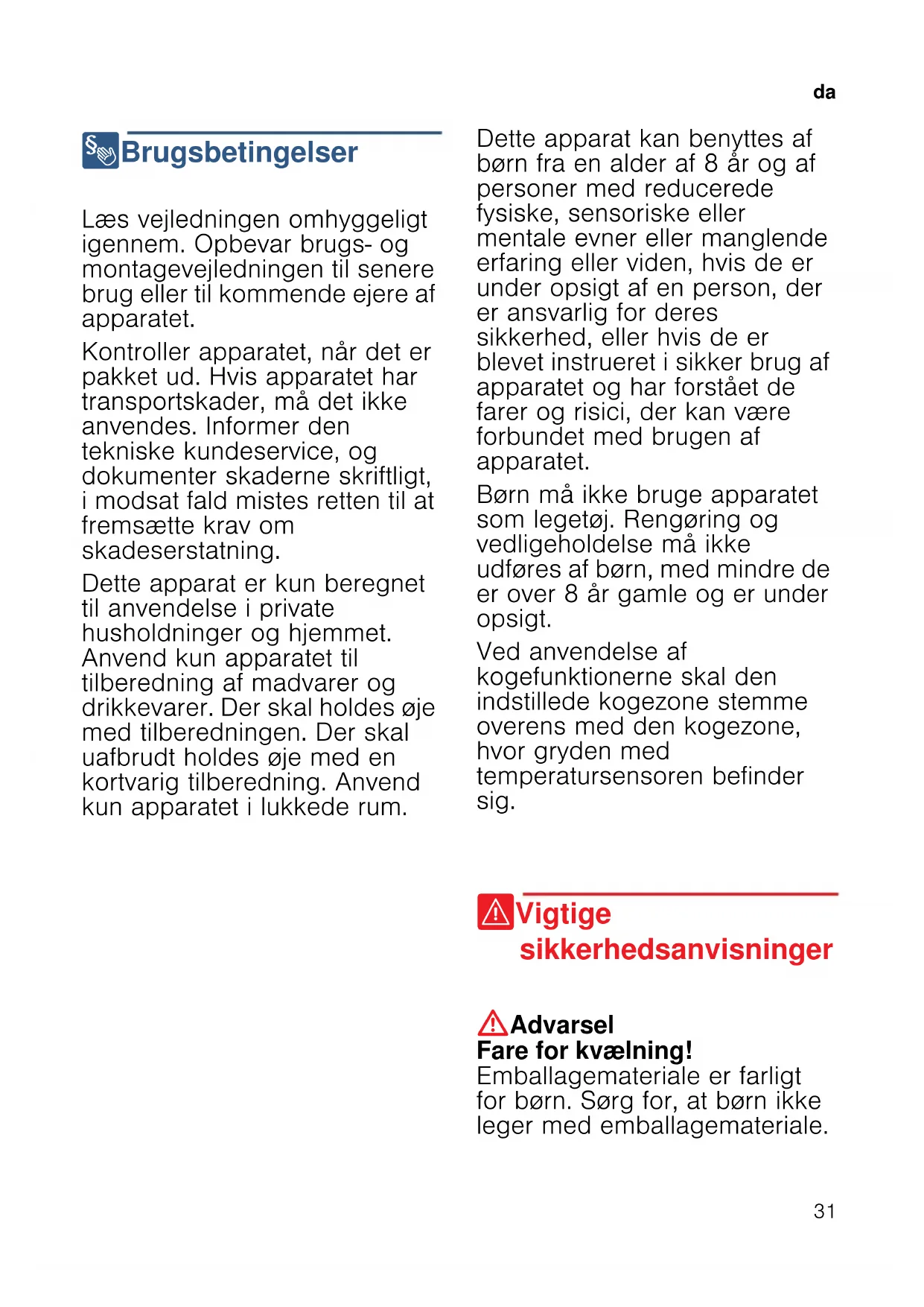8 Brugsbetingelser Br ugsbet i ngel ser Læs vejledningen omhyggeligt igennem. Opbevar brugs- og montagevejledningen til senere brug eller til kommende ejere af apparatet. Kontroller apparatet, når det er pakket ud. Hvis apparatet har transportskader, må det ikke anvendes. Informer den tekniske kundeservice, og dokumenter skaderne skriftligt, i modsat fald mistes retten til at fremsætte krav om skadeserstatning. Dette apparat er kun beregnet til anvendelse i private husholdninger og hjemmet. Anvend kun apparatet til tilberedning af madvarer og drikkevarer. Der skal holdes øje med tilberedningen. Der skal uafbrudt holdes øje med en kortvarig tilberedning. Anvend kun apparatet i lukkede rum. Dette apparat kan benyttes af børn fra en alder af 8 år og af personer med reducerede fysiske, sensoriske eller mentale evner eller manglende erfaring eller viden, hvis de er under opsigt af en person, der er ansvarlig for deres sikkerhed, eller hvis de er blevet instrueret i sikker brug af apparatet og har forstået de farer og risici, der kan være forbundet med brugen af apparatet. Børn må ikke bruge apparatet som legetøj. Rengøring og vedligeholdelse må ikke udføres af børn, med mindre de er over 8 år gamle og er under opsigt. Ved anvendelse af kogefunktionerne skal den indstillede kogezone stemme overens med den kogezone, hvor gryden med temperatursensoren befinder sig. ( Vigtige sikkerhedsanvisninger Vi g t i g e si k ker hedsanvi s ni nger :Advarsel Fare for kvælning! Emballagemateriale er farligt for børn. Sørg for, at børn ikke leger med emballagemateriale.da