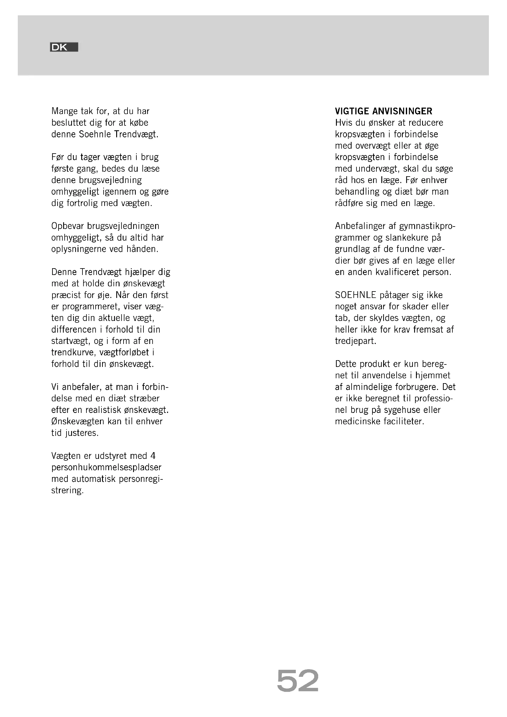 No caso de activação da garantia devolver a balança com este talão de garantia e comprovativo de compra junto do seu vendedor. Remetente Motivo de reclamação Este aparelho possui supres- são de interferências em con- formidade com a directiva CE 89/336/CEE vigente. Aviso: No caso de interferências electromagnéticos extremas, por exemplo, na utilização de um aparelho de radiocomuni- cação próximo da balança, podem ocorrer interferências no valor de indicação. Depois de eliminado o factor de interferência o produto volta a estar funcional, eventual- mente será necessário voltar a ligar a balança. BA63150tendence117634_V8.qxd 07.02.2007 7:08 Uhr Seite 5152 Mange tak for, at du har besluttet dig for at købe denne Soehnle Trendvægt. Før du tager vægten i brug første gang, bedes du læse denne brugsvejledning omhyggeligt igennem og gøre dig fortrolig med vægten. Opbevar brugsvejledningen omhyggeligt, så du altid har oplysningerne ved hånden. Denne Trendvægt hjælper dig med at holde din ønskevægt præcist for øje. Når den først er programmeret, viser væg- ten dig din aktuelle vægt, differencen i forhold til din startvægt, og i form af en trendkurve, vægtforløbet i forhold til din ønskevægt. Vi anbefaler, at man i forbin- delse med en diæt stræber efter en realistisk ønskevægt. Ønskevægten kan til enhver tid justeres. Vægten er udstyret med 4 personhukommelsespladser med automatisk personregi- strering. VIGTIGE ANVISNINGER Hvis du ønsker at reducere kropsvægten i forbindelse med overvægt eller at øge kropsvægten i forbindelse med undervægt, skal du søge råd hos en læge. Før enhver behandling og diæt bør man rådføre sig med en læge. Anbefalinger af gymnastikpro- grammer og slankekure på grundlag af de fundne vær- dier bør gives af en læge eller en anden kvalificeret person. SOEHNLE påtager sig ikke noget ansvar for skader eller tab, der skyldes vægten, og heller ikke for krav fremsat af tredjepart. Dette produkt er kun bereg- net til anvendelse i hjemmet af almindelige forbrugere. Det er ikke beregnet til professio- nel brug på sygehuse eller medicinske faciliteter.