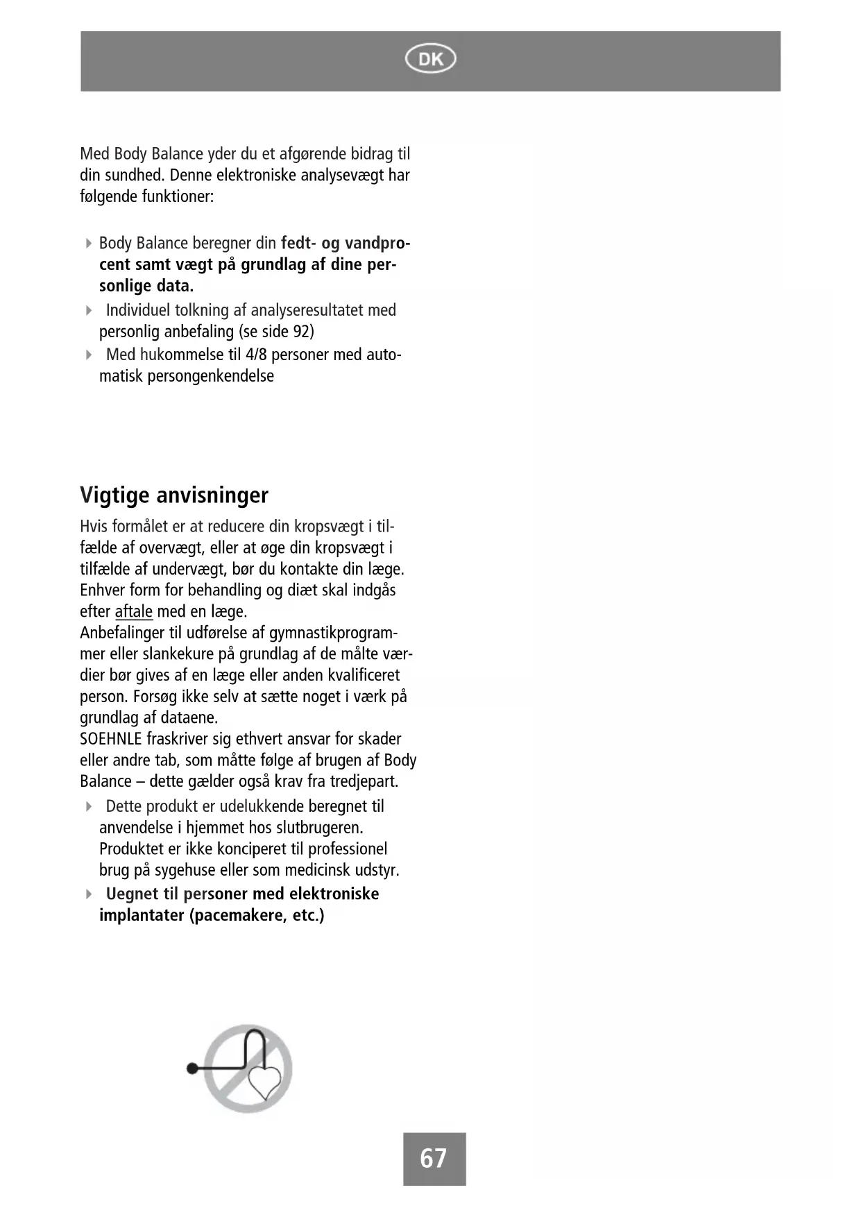 SOEHNLE fraskriver sig ethvert ansvar for skader erer andre tab, som matte folge af brugen af Body Balance - dette gælder ogsa krav fra tredjepart.