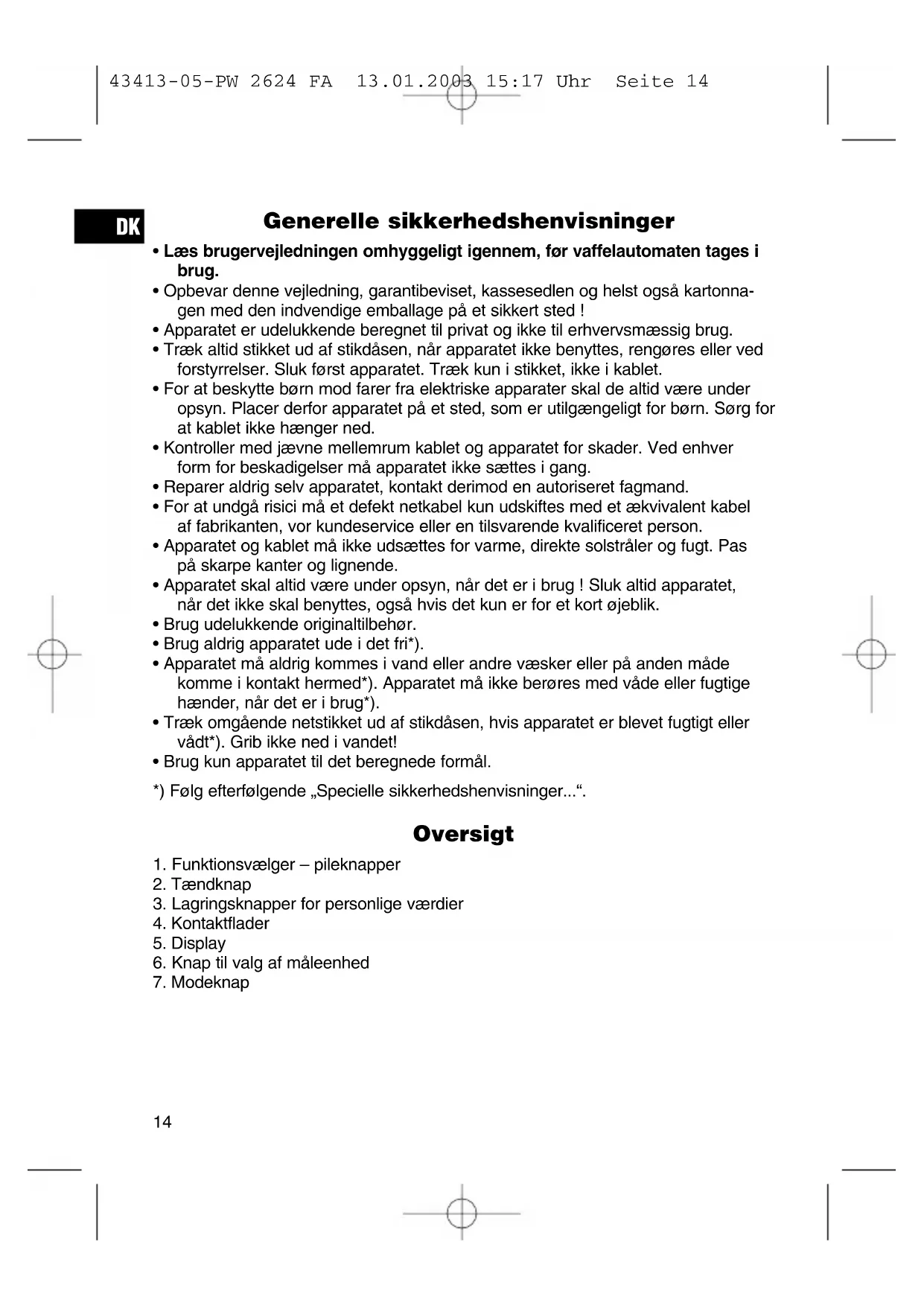 - Brug kun apparatet til det beregnede formål. *) Følg efterfølgende „Specielle sikkerhedshenvisninger...“. Oversigt