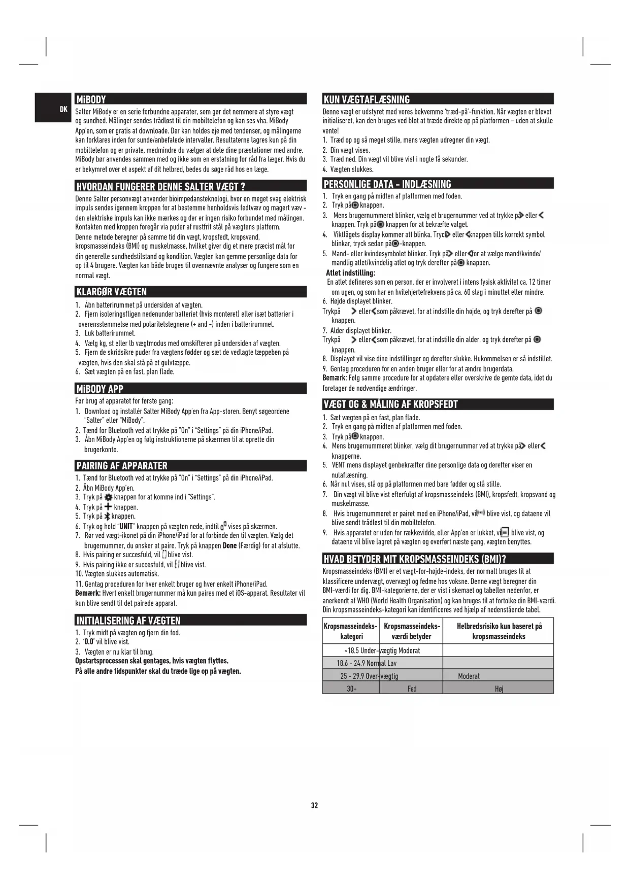 MiBODY Salter MiBody er en serie forbundne apparater, som gør det nemmere at styre vægt og sundhed. Målinger sendes trådløst til din mobiltelefon og kan ses vha. MiBody App’en, som er gratis at downloade. Der kan holdes øje med tendenser, og målingerne kan forklares inden for sunde/anbefalede intervaller. Resultaterne lagres kun på din mobiltelefon og er private, medmindre du vælger at dele dine præstationer med andre. MiBody bør anvendes sammen med og ikke som en erstatning for råd fra læger. Hvis du er bekymret over et aspekt af dit helbred, bedes du søge råd hos en læge. HVORDAN FUNGERER DENNE SALTER VÆGT ? Denne Salter personvægt anvender bioimpedansteknologi, hvor en meget svag elektrisk impuls sendes igennem kroppen for at bestemme henholdsvis fedtvæv og magert væv - den elektriske impuls kan ikke mærkes og der er ingen risiko forbundet med målingen. Kontakten med kroppen foregår via puder af rustfrit stål på vægtens platform. Denne metode beregner på samme tid din vægt, kropsfedt, kropsvand, kropsmasseindeks (BMI) og muskelmasse, hvilket giver dig et mere præcist mål for din generelle sundhedstilstand og kondition. Vægten kan gemme personlige data for op til 4 brugere. Vægten kan både bruges til ovennævnte analyser og fungere som en normal vægt.