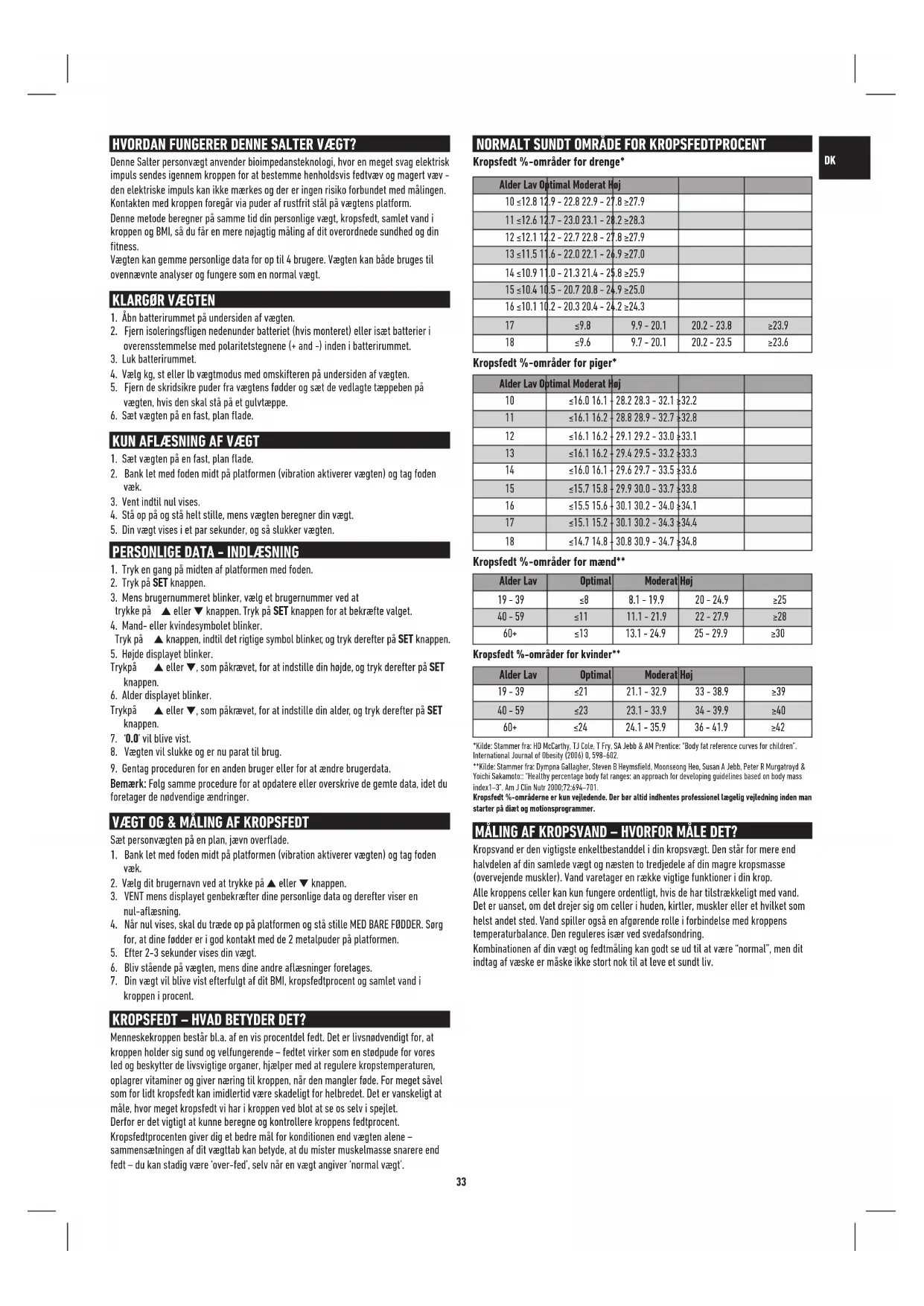 Præcis hvordan bliver mit kropsfedt og –vand målt? Denne Salter personvægt anvender en målemetode, der kaldes bioimpedansanalyse (BIA).En ganske lille strøm sendes gennem kroppen via fødderne og benene. Strømmen løber let gennem det magre muskelvæv, som har et højt væskeindhold, men ikke let gennem fedt. Derfor kan muskelmængden bestemmes ved at måle kroppens impedans (dvs. dens modstand mod strømmen). På baggrund heraf kan man så anslå mængden af fedt og vand. Hvad er værdien af den strøm, som passerer gennem mig, når målingen foretages? Er det sikkert? Strømmen er mindre end 1 mA, hvilket er meget lidt og helt sikkert. Du vil ikke kunne føle det. Bemærk dog, at denne anordning ikke bør bruges af nogen med en intern elektronisk medicinsk anordning, f.eks. en pacemaker, som forholdsregel mod afbrydelse af den pågældende anordning. Hvis jeg måler mit kropsfedt og -vand på forskellige tidspunkter på dagen, kan det svinge ganske betragteligt. Hvilken visning er den rigtige? Målingen af din kropsfedtprocent svinger i takt med indholdet af vand i din krop, og vandindholdet ændrer sig i løbet af dagen. Der findes intet rigtigt eller forkert tidspunkt på dagen at foretage aflæsningen, men det er bedst at foretage målingerne regelmæssigt på et tidspunkt, hvor du mener, kroppen er normalt hydreret. Undgå at aflæse efter at have været i bad eller sauna, efter intensiv motion eller inden for 1-2 timer efter, at du har drukket meget eller indtaget et måltid. Min ven har en kropsfedtanalysator af et andet fabrikat. Da jeg brugte den, opdagede jeg, at jeg fik en anden fedtprocentmåling. Hvordan kan det være? De forskellige kropsfedtanalysatorer foretager målinger på forskellige steder på kroppen og bruger forskellige matematiske algoritmer til at beregne procenten af kropsfedt. Det bedste råd er ikke at lave sammenligninger mellem det ene apparat og det andet, men at bruge det samme apparat hver gang til at holde øje med evt. forandringer. Hvordan fortolker jeg mine målinger af kropsfedt- og –vandprocent? Der henvises til kropsfedt- og –vandtabellerne, der medfølger med produktet. De vil vise, om målingen af din kropsfedt- og vandværdi falder indenfor en sund kategori (i forhold til din alder og dit køn). Hvad skal jeg gøre, hvis min måling af kropsfedt er meget ’høj’? En sund kost, et fornuftigt væskeindtag og en motionsplan kan nedsætte din kropsfedtprocent. Du bør altid få professionel vejledning, f.eks.fra din læge, inden du begynder at følge en eventuel plan. Hvorfor er der så stor forskel på krosfedtområderne for mænd og kvinder? Kvinder har fra naturens side en højere fedtprocent end mænd, eftersom kvindekroppen er opbygget med henblik på graviditet, amning osv. Hvad skal jeg gøre, hvis min måling af vandprocent er ’lav’? Husk at drikke vand med jævne mellemrum og arbejd mod at få fedtprocenten ind i det sunde område. Hvorfor bør jeg ikke bruge kropsanalysevægten, hvis jeg er gravid? Under graviditet ændres kvindekroppens opbygning ganske betydeligt, så den er i stand til at støtte barnets udvikling. Under disse omstændigheder kan målinger af kropsfedt være unøjagtige og vildtledende. Gravide kvinder bør derfor kun bruge vægtfunktionen. GODE RÅD OM BRUG OG VEDLIGEHOLDELSE