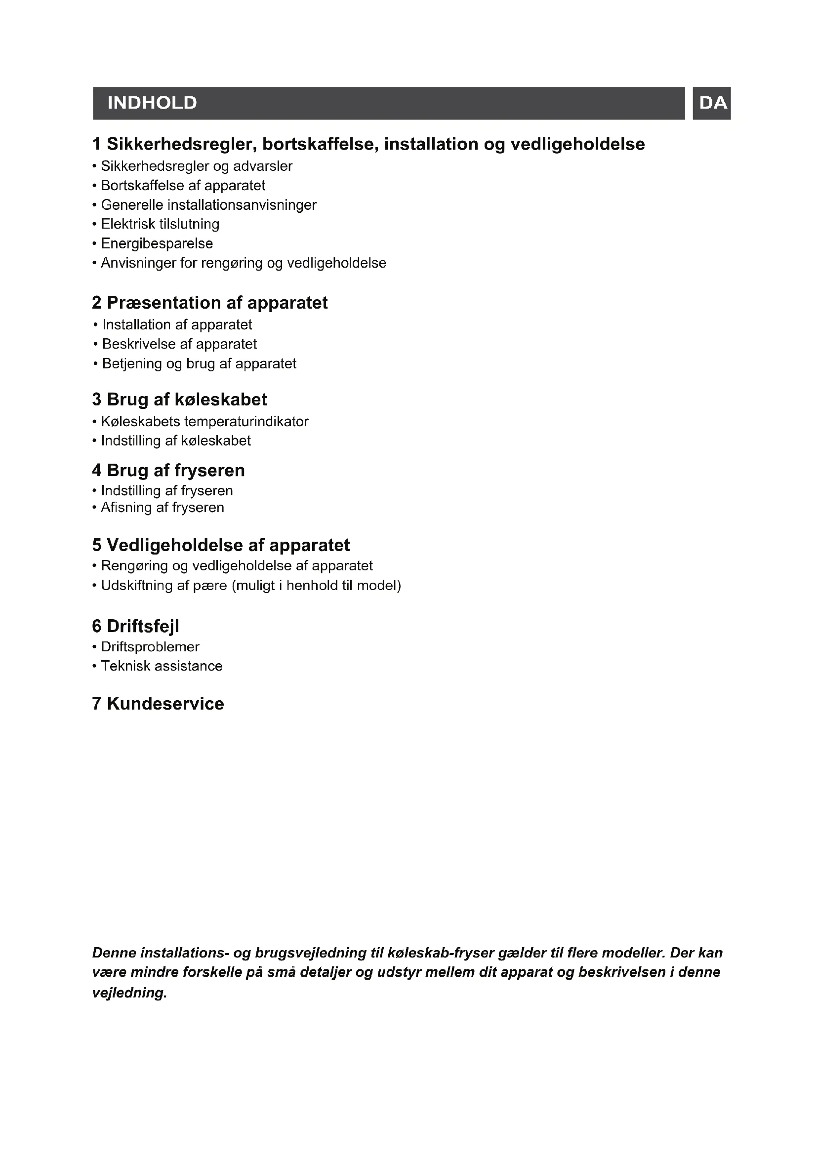- Sikkerhedsregler og advarsler • Bortskaffelse af apparatet • Generelle installationsanvisninger • Elektrisk tilslutning • Energibesparelse • Anvisninger for rengøring og vedligeholdelse