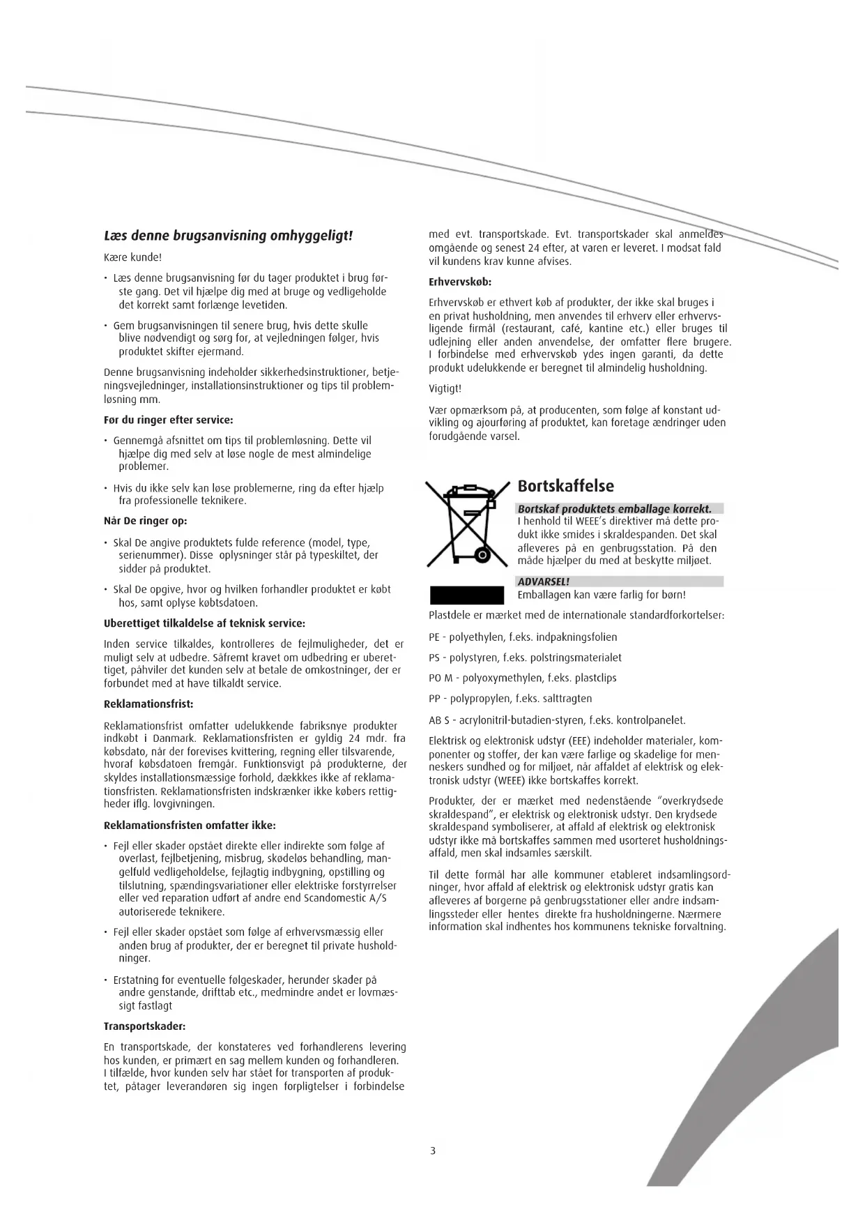 Bortskaf Produktets emballage korrekt. I henhold til WEEE's direktiver ma dette produit ilke smides i skraldespanden.Det skal afleveres pa en genbrugsstation.Pa den made hjælper du med at beskytte miljoet.