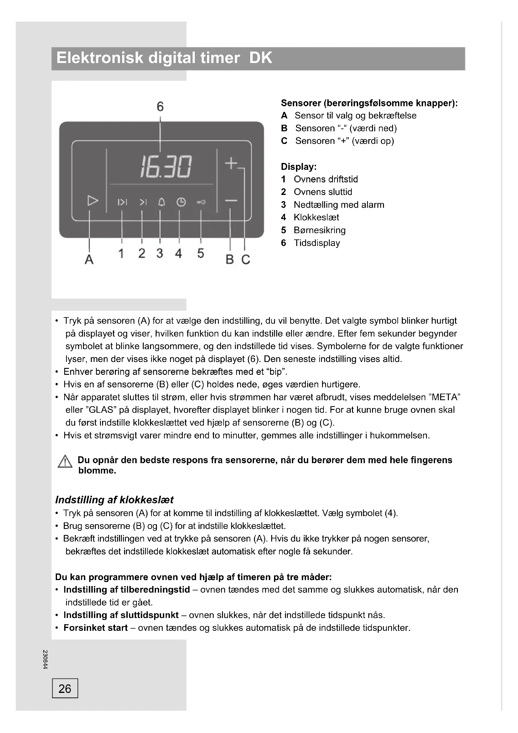 - Hvis et strømsvigt varer mindre end to minutter, gemmes alle indstillinger i hukommelsen. Du opnår den bedste respons fra sensorerne, når du berører dem med hele fi ngerens blomme. Indstilling af klokkeslæt
