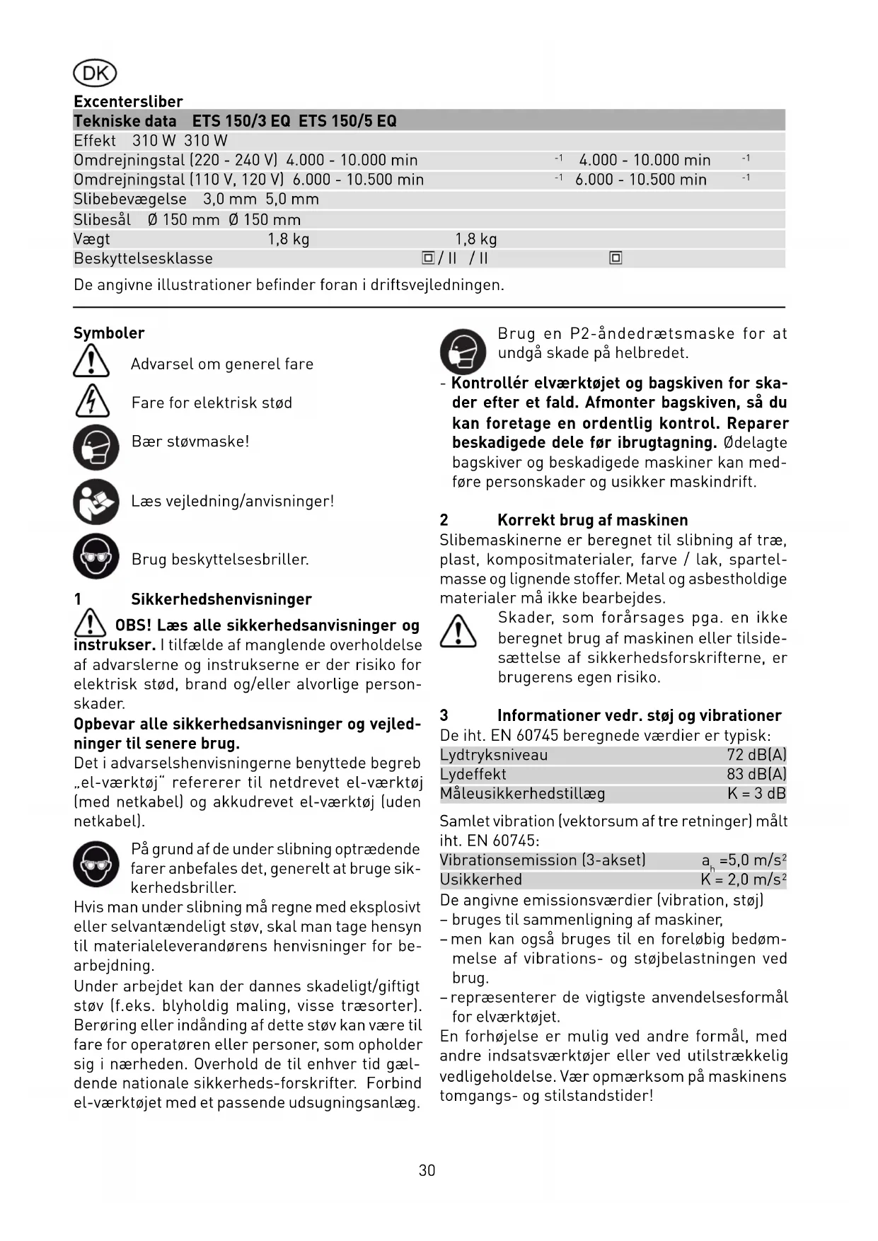 Slibebevægelse 3,0 mm 5,0 mm Slibesål Ø 150 mm Ø 150 mm Vægt 1,8 kg 1,8 kg Beskyttelsesklasse / II / II De angivne illustrationer befi nder foran i driftsvejledningen. Symboler Advarsel om generel fare Fare for elektrisk stød Bær støvmaske! Læs vejledning/anvisninger! Brug beskyttelsesbriller. 1 Sikkerhedshenvisninger OBS! Læs alle sikkerhedsanvisninger og instrukser. I tilfælde af manglende overholdelse af advarslerne og instrukserne er der risiko for elektrisk stød, brand og/eller alvorlige person- skader. Opbevar alle sikkerhedsanvisninger og vejled- ninger til senere brug. Det i advarselshenvisningerne benyttede begreb „el-værktøj“ refererer til netdrevet el-værktøj (med netkabel) og akkudrevet el-værktøj (uden netkabel). På grund af de under slibning optrædende farer anbefales det, generelt at bruge sik- kerhedsbriller. Hvis man under slibning må regne med eksplosivt eller selvantændeligt støv, skal man tage hensyn til materialeleverandørens henvisninger for be- arbejdning. Under arbejdet kan der dannes skadeligt/giftigt støv (f.eks. blyholdig maling, visse træsorter). Berøring eller indånding af dette støv kan være til fare for operatøren eller personer, som opholder sig i nærheden. Overhold de til enhver tid gæl- dende nationale sikkerheds-forskrifter. Forbind el-værktøjet med et passende udsugningsanlæg. Brug en P2-åndedrætsmaske for at undgå skade på helbredet. - Kontrollér elværktøjet og bagskiven for ska- der efter et fald. Afmonter bagskiven, så du kan foretage en ordentlig kontrol. Reparer beskadigede dele før ibrugtagning. Ødelagte bagskiver og beskadigede maskiner kan med- føre personskader og usikker maskindrift. 2 Korrekt brug af maskinen Slibemaskinerne er beregnet til slibning af træ, plast, kompositmaterialer, farve / lak, spartel- masse og lignende stoffer. Metal og asbestholdige materialer må ikke bearbejdes. Skader, som forårsages pga. en ikke beregnet brug af maskinen eller tilside- sættelse af sikkerhedsforskrifterne, er brugerens egen risiko. 3 Informationer vedr. støj og vibrationer De iht. EN 60745 beregnede værdier er typisk: Lydtryksniveau 72 dB(A) Lydeffekt 83 dB(A) Måleusikkerhedstillæg K = 3 dB Samlet vibration (vektorsum af tre retninger) målt iht. EN 60745: Vibrationsemission (3-akset) a