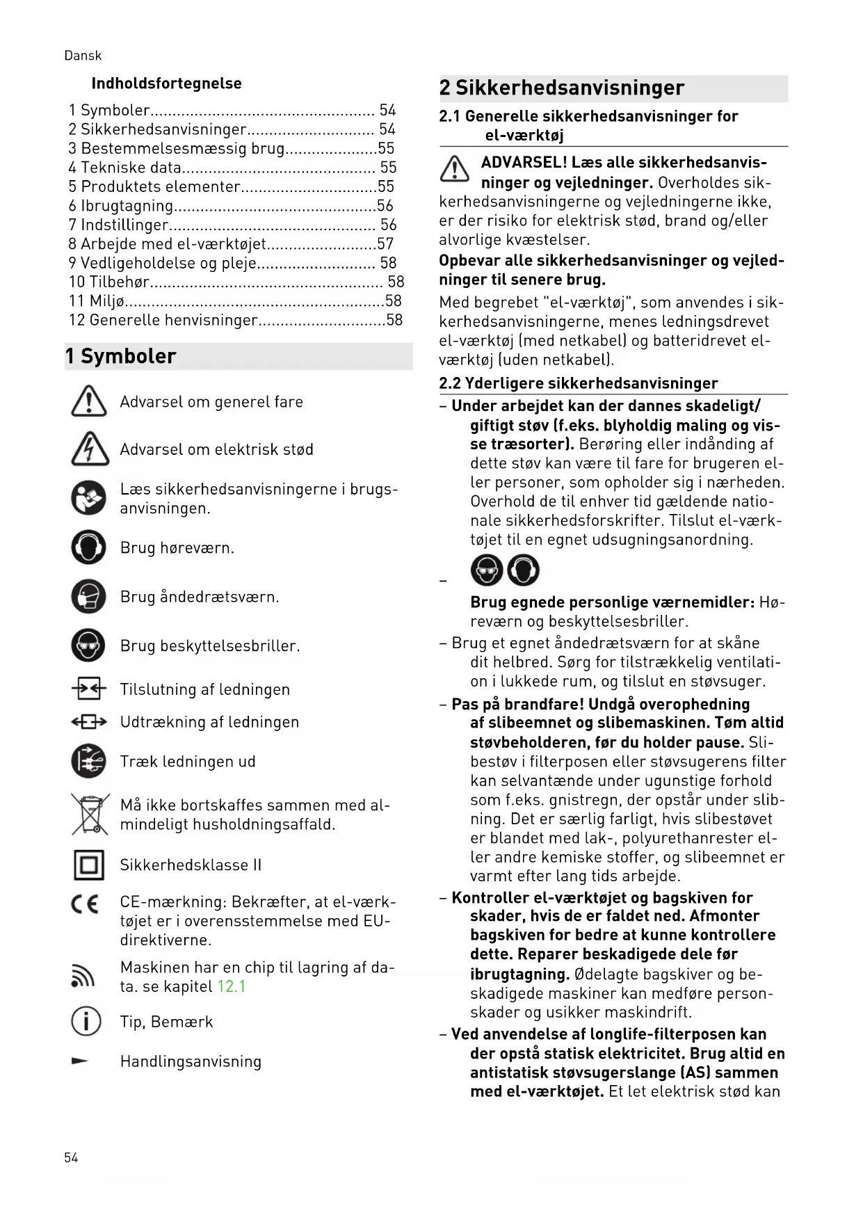 Brug egnede personlige værnemidler: Hø reværn og beskyttelsesbriller. – Brug et egnet åndedrætsværn for at skåne dit helbred. Sørg for tilstrækkelig ventilati on i lukkede rum, og tilslut en støvsuger. – Pas på brandfare! Undgå overophedning af slibeemnet og slibemaskinen. Tøm altid støvbeholderen, før du holder pause. Sli bestøv i filterposen eller støvsugerens filter kan selvantænde under ugunstige forhold som f.eks. gnistregn, der opstår under slib ning. Det er særlig farligt, hvis slibestøvet er blandet med lak-, polyurethanrester el ler andre kemiske stoffer, og slibeemnet er varmt efter lang tids arbejde. – Kontroller el-værktøjet og bagskiven for skader, hvis de er faldet ned. Afmonter bagskiven for bedre at kunne kontrollere dette. Reparer beskadigede dele før ibrugtagning. Ødelagte bagskiver og be skadigede maskiner kan medføre person skader og usikker maskindrift. – Ved anvendelse af longlife-filterposen kan der opstå statisk elektricitet. Brug altid en antistatisk støvsugerslange (AS) sammen med el-værktøjet. Et let elektrisk stød kan Dansk 54forskrække lidt og forstyrre opmærksom heden, så der opstår et uheld. – Rengør olievædede arbejdsmaterialer, f.eks. slibepuder eller polerfilt, med vand, og lad dem tørre i udbredt tilstand. Olie vædede arbejdsmaterialer kan selvantæn de.