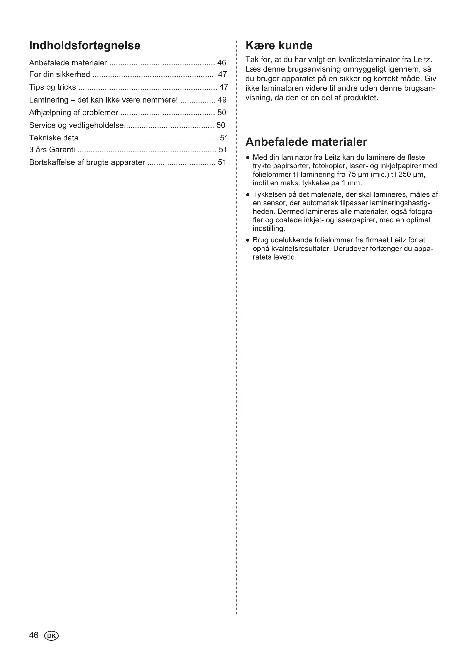 Kære kunde Tak for, at du har valgt en kvalitetslaminator fra Leitz. Læs denne brugsanvisning omhyggeligt igennem, så du bruger apparatet på en sikker og korrekt måde. Giv ikke laminatoren videre til andre uden denne brugsan- visning, da den er en del af produktet. Anbefalede materialer
