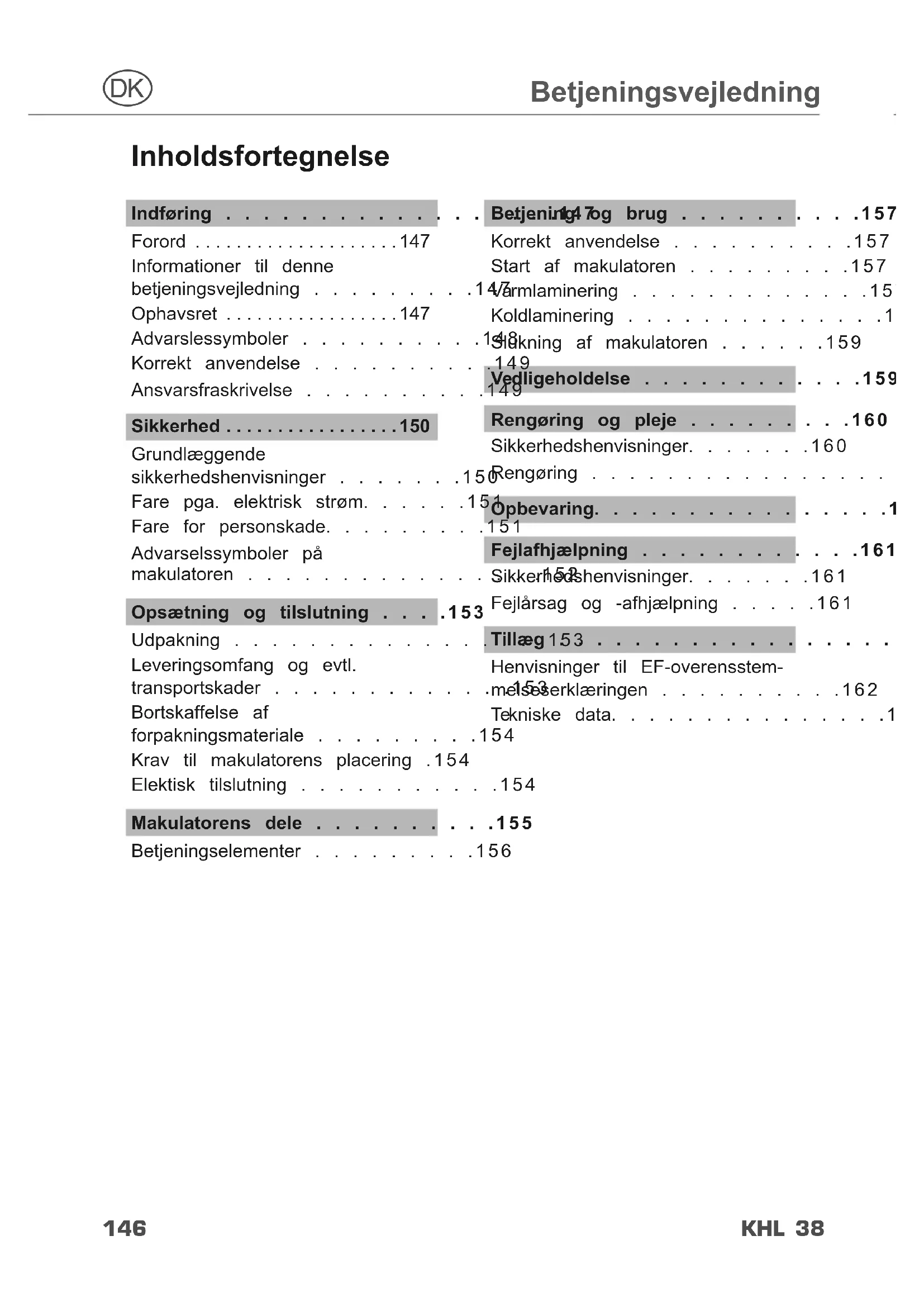 - Tekniske data Betjeningsvejledning147 Indføring KHL 38 p. 163