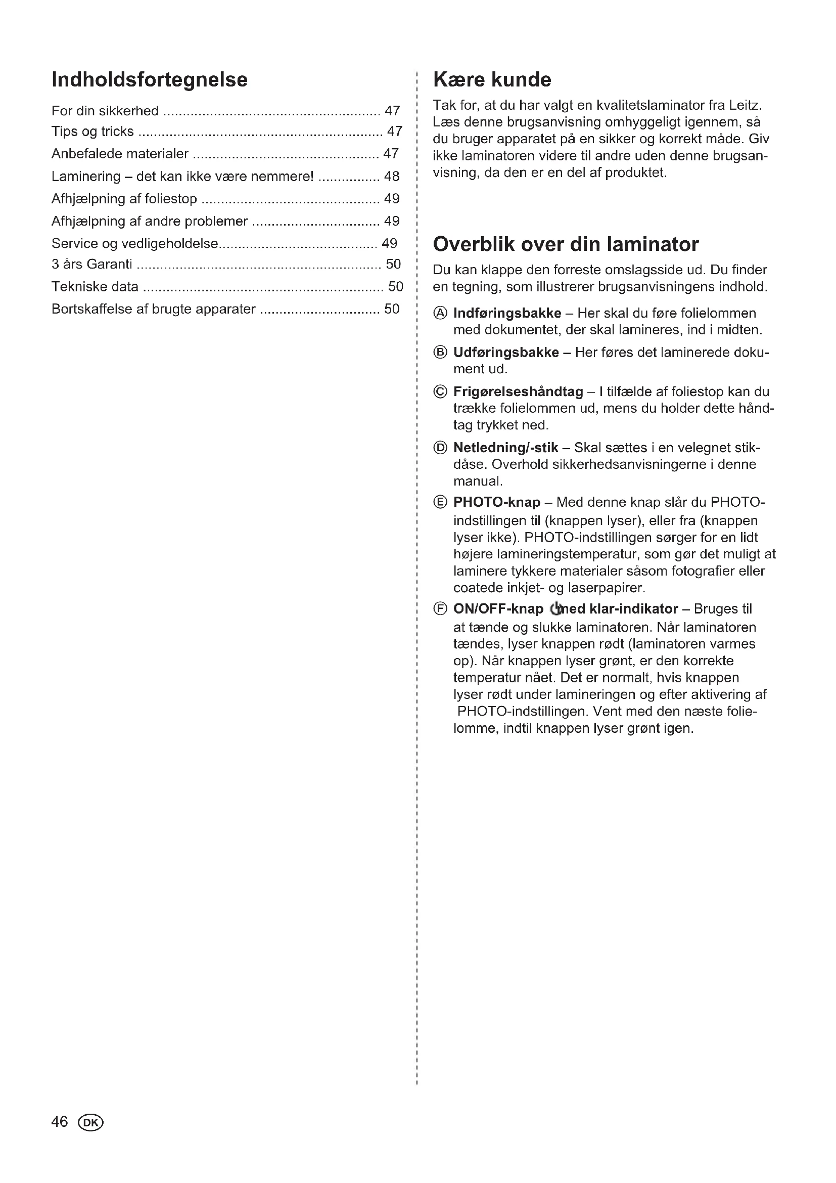 - Bortskaffelse af brugte apparater Kære kunde Tak for, at du har valgt en kvalitetslaminator fra Leitz. Læs denne brugsanvisning omhyggeligt igennem, så du bruger apparatet på en sikker og korrekt måde. Giv ikke laminatoren videre til andre uden denne brugsan- visning, da den er en del af produktet. p. 50
