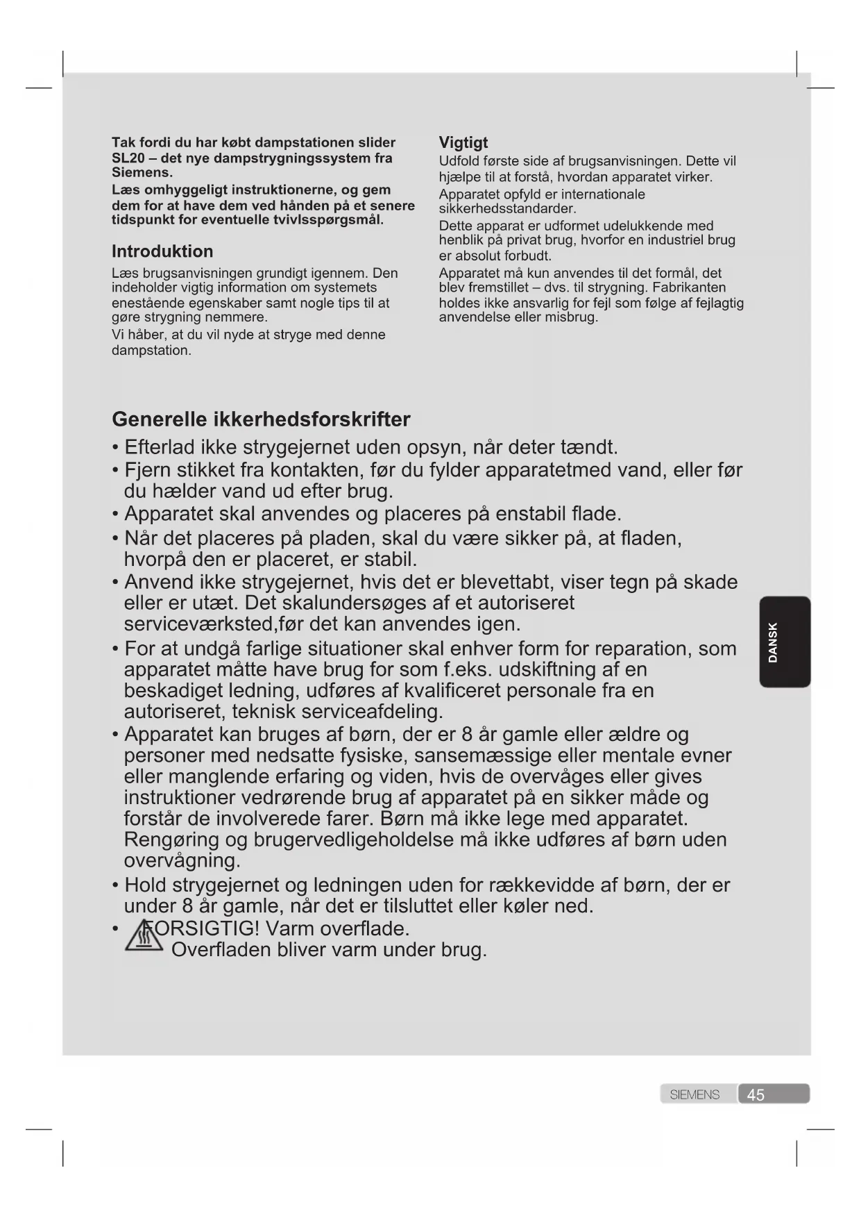 - Het stomen stopt direct na een kort indrukken van de stoomknop. Als bovenstaande het probleem niet oplost, neem contact op met een bevoegd technisch servicecentrum. Ukuntdezegebruiksaanwijzingookdownloadenvanhetinternetviadelokalehomepagevan Siemens.45 S I E M E N SDANSK Takfordiduharkøbtdampstationenslider SL20–detnyedampstrygningssystemfra Siemens. Læsomhyggeligtinstruktionerne,oggem demforathavedemvedhåndenpåetsenere tidspunktforeventuelletvivlsspørgsmål. Introduktion Læs brugsanvisningen grundigt igennem. Den indeholder vigtig information om systemets enestående egenskaber samt nogle tips til at gøre strygning nemmere. Vi håber, at du vil nyde at stryge med denne dampstation. Vigtigt Udfold første side af brugsanvisningen. Dette vil hjælpe til at forstå, hvordan apparatet virker. Apparatet opfyld er internationale sikkerhedsstandarder. Dette apparat er udformet udelukkende med henblik på privat brug, hvorfor en industriel brug er absolut forbudt. Apparatet må kun anvendes til det formål, det blev fremstillet – dvs. til strygning. Fabrikanten holdes ikke ansvarlig for fejl som følge af fejlagtig anvendelse eller misbrug. Generelleikkerhedsforskrifter
