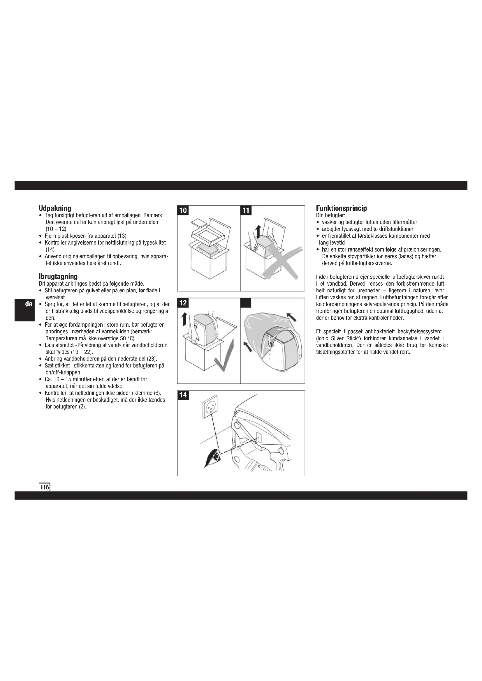 - Hvis du ønsker at anvende befugteren til duftspredning, skal den dertil beregnede duftstofbeholder anvendes (se også afsnittet „Anvendelse af duftstoffer“). Kom al- drig tilsætningsstoffer som f.eks. æteriske olier direkte i vandtanken eller i vandbeholderen. Disse tilsætnings- stoffer beskadiger befugteren! Befugtere, der beska- diges af tilsætningsstoffer, dækkes ikke af garantien. 11-2055-2055D-EU-Manual-DA.indd 114 18.7.2006 19:00:19 Uhr115