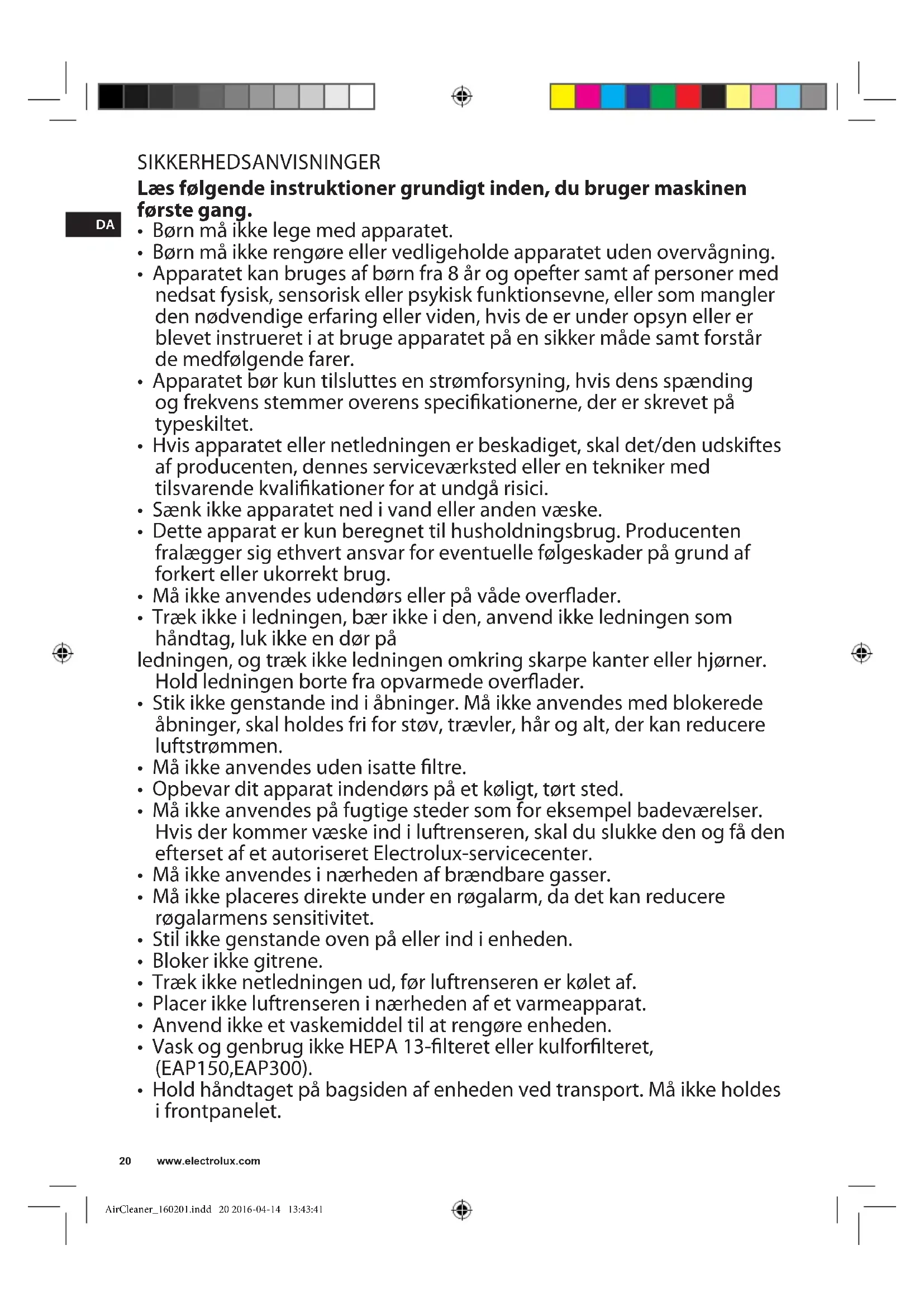 AirCleaner_160201.indd 19 2016-04-14 13:43:40DA SIKKERHEDSANVISNINGER Læs følgende instruktioner grundigt inden, du bruger maskinen første gang.