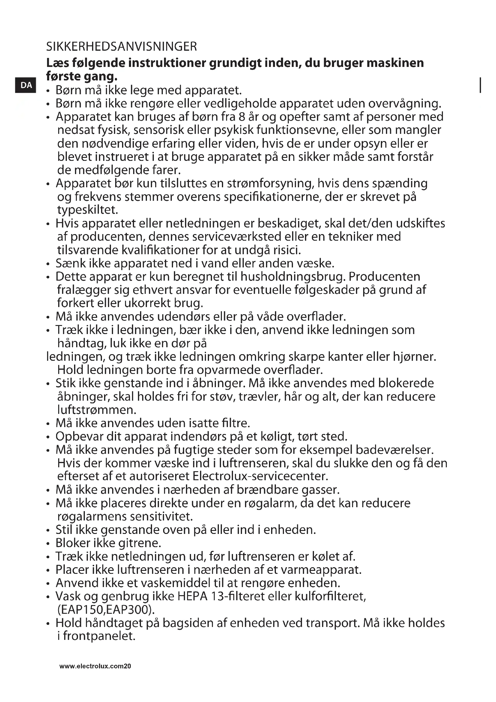 EAP150, EAP300, EAP450Hændelse Mulige årsager/løsningKan jeg vaske mit lter? Nej, ltrene, som følger med enheden, går i stykker og ødelægges, hvis der løber vand igennem dem. (Filtrene til model eAp450 kan vaskes)Kan jeg støvsuge mit lter? Nej, støvsugning vil kun føre støvet tilbage til luften. Hvis du mener, at lteret er for snavset, er det måske tid at udskifte det. (Det vaskbare forlter til model eAp450 kan rengøres med støvsugeren eller en blød børste)Der kommer en lugt fra enheden, og jeg har lige åbnet den.Enheden har været forseglet i tæt indpakket emballage af bølgepap og plast. Fordi den har en blæser og trækker luft gennem den, kan den afgive nogle "nye" lugte. Afhængigt af følsomheden skulle det forsvinde i løbet af et par dage eller måske en uge afhængigt af, hvor meget den anvendes.Kan den rense et større område end det, den er klassiceret til?CADR-klassiceringer følger af kontrollerede testomgivelser, hvis disse omgivelser ændres, kan det påvirke funktionen. Men hvis du har et lidt større rum end det for CADR-klassiceringen, hjælper den stadig til at forbedre luften, men kan det vare lidt længereHvor bør jeg placere enheden? Sørg for god luftcirkulation på siderne og foran enheden. Hvis der er døre eller smalle gange, kan det reducere luftstrømmen til luftrenseren, men vil efterhånden cirkulere i nærheden af maskinen.Lampen for luftkvalitet er orange eller rød, men luften virker ren.Rengør sensoren med en støvsuger, da den kan være blokeret eller tilstoppet.Nogle gange kan en trykluftdåse erne støvet i sensoren.Der er stadig støv, som du kan se i luften eller på møblerneEnheden opsamler det meste støv og partikler, men med åbne døre og vinduer, et central varme-, ventilations- og airconditionsystem etc. kan der stadig ndes støv, som du kan se.Der er ikke noget, der holder lteret på pladsFiltrene er beregnet til at sidde fast inde i enheden. Når enheden tændes, skaber kraften fra luften, der suges gennem maskinen, en tæt forsegling med ltrene.Jeg kan høre, at blæsermotoren kører Det er normalt, især om natten, når alle omgivelseslyde er stille, kan du høre, at motoren kører periodisk.Enheden erner ikke længere lugte eektivt eller synes at afgive en lugt.Kontrollér, at luftkvalitetsensoren ikke er blokeret eller tilstoppet.Flyt enheden tættere på de ubehagelige lugte.Udskift ltrene, da de kan have nået deres kapacitet til at absorbere forurenende stoer. Det kan være nødvendigt at udskifte ltre oftere.Lampen Check lter forbliver tændt efter udskiftning af hepA-lteret.Tryk på knappen reSet lter ved forsigtigt at stikke en clips ind i knaphullet reSet lter. Hold nede i 3-5 sekunder, indtil der lyder et “bip”, som angiver, at enheden er nulstillet.www.electrolux.com24■ ■ ■ EAP300, EAP450Hændelse Mulige årsager/løsningKan jeg frakoble søvn-tilstanden? Nej, men du kan manuelt indstille blæserhastigheden, som du foretrækker, og den bliver på denne hastighed, indtil du ændrer den. Enheden afgiver en tikkende lyd. Det skyldes PlasmaWave™ teknologien, den kommer og forsvinder afhængigt af omgivelserne, men så længe PlasmaWave™ lampen er tændt, fungerer funktionen.Fjernbetjeningen virker ikke. Kontrollér, at ernbetjeningens batteri er sat korrekt i.Udskift et opbrugt batteri.Kontrollér, at ernbetjeningen har en uhindret synslinje til luftrenseren. ■ ■ ■ EAP450Hændelse Mulige årsager/løsningLampen for luftkvalitet lyser hvidt, men der er stadig støv/lugt i luften.Kontrollér, at sensoren ikke er blokeret eller tilstoppet.Udskift lteretEnheden synes at afgive lugte. Flyt enheden tættere på de ubehagelige lugte.Udskift lteretDer er stadig støv, som kan ses i luften eller på møblerne.Enheden opsamler det meste støv og partikler, men med åbne døre og vinduer, et central varme-, ventilations- og airconditionsystem etc. kan der stadig ndes støv, som du kan se.Enheden kører med højt omdrejningstal hele tiden.Rengør sensoren med en støvsuger, da den kan være blokeret eller tilstoppet.Nogle gange kan en trykluftdåse erne støvet i sensoren.Lampen CheCk lter forbliver tændt efter udskiftning af lterkassetten.Tryk på knappen reSet lter ved forsigtigt at stikke en clips ind i knaphullet reSet lter. Hold nede i 3-5 sekunder, indtil der lyder et "bip", som angiver, at enheden er nulstillet. BORTSKAFFELSE Genbrug materialer med symbolet . Anbring emballagematerialet i passende beholdere til genbrug. Hjælp med at beskytte miljøet og menneskelig sundhed samt at genbruge aald af elektriske og elektroniske apparater. Kasser ikke apparater, der er mærket med symbolet , sammen med husholdningsaaldet. Lever produktet tilbage til din lokale genbrugsplads eller kontakt din kommune.