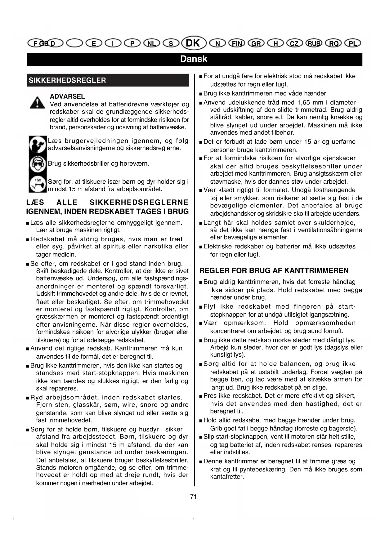 F GB D Svenska E I P NL DK N FIN GR H CZ RUS RO PL CLT-1423P / 1823 P manual 24/11/04 11:57 Page 70SIKKERHEDSREGLER ADVARSEL Ved anvendelse af batteridrevne værktøjer og redskaber skal de grundlæggende sikkerheds- regler altid overholdes for at formindske risikoen for brand, personskader og udsivning af batterivæske. Læs brugervejledningen igennem, og følg advarselsanvisningerne og sikkerhedsreglerne. Brug sikkerhedsbriller og høreværn. Sørg for, at tilskuere især børn og dyr holder sig i mindst 15 m afstand fra arbejdsområdet.
