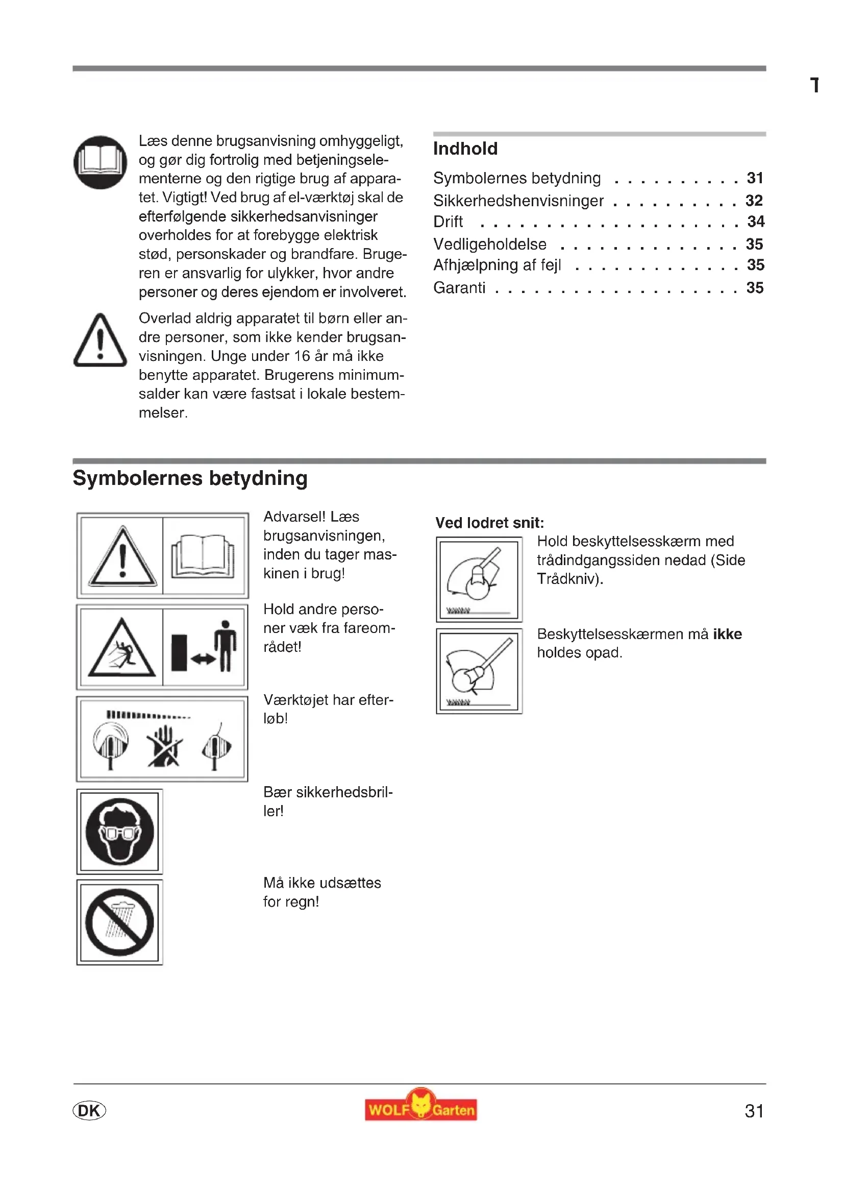 - Garanti Symbolernes betydning Læs denne brugsanvisning omhyggeligt, og gør dig fortrolig med betjeningsele- menterne og den rigtige brug af appara- tet. Vigtigt! Ved brug af el-værktøj skal de efterfølgende sikkerhedsanvisninger overholdes for at forebygge elektrisk stød, personskader og brandfare. Bruge- ren er ansvarlig for ulykker, hvor andre personer og deres ejendom er involveret. Overlad aldrig apparatet til børn eller an- dre personer, som ikke kender brugsan- visningen. Unge under 16 år må ikke benytte apparatet. Brugerens minimum- salder kan være fastsat i lokale bestem- melser. Advarsel! Læs brugsanvisningen, inden du tager mas- kinen i brug! Hold andre perso- ner væk fra fareom- rådet! Værktøjet har efter- løb! Bær sikkerhedsbril- ler! Må ikke udsættes for regn! Ved lodret snit: Hold beskyttelsesskærm med trådindgangssiden nedad (Side Trådkniv). Beskyttelsesskærmen må ikke holdes opad. Originale driftsvejledning32 p. 35