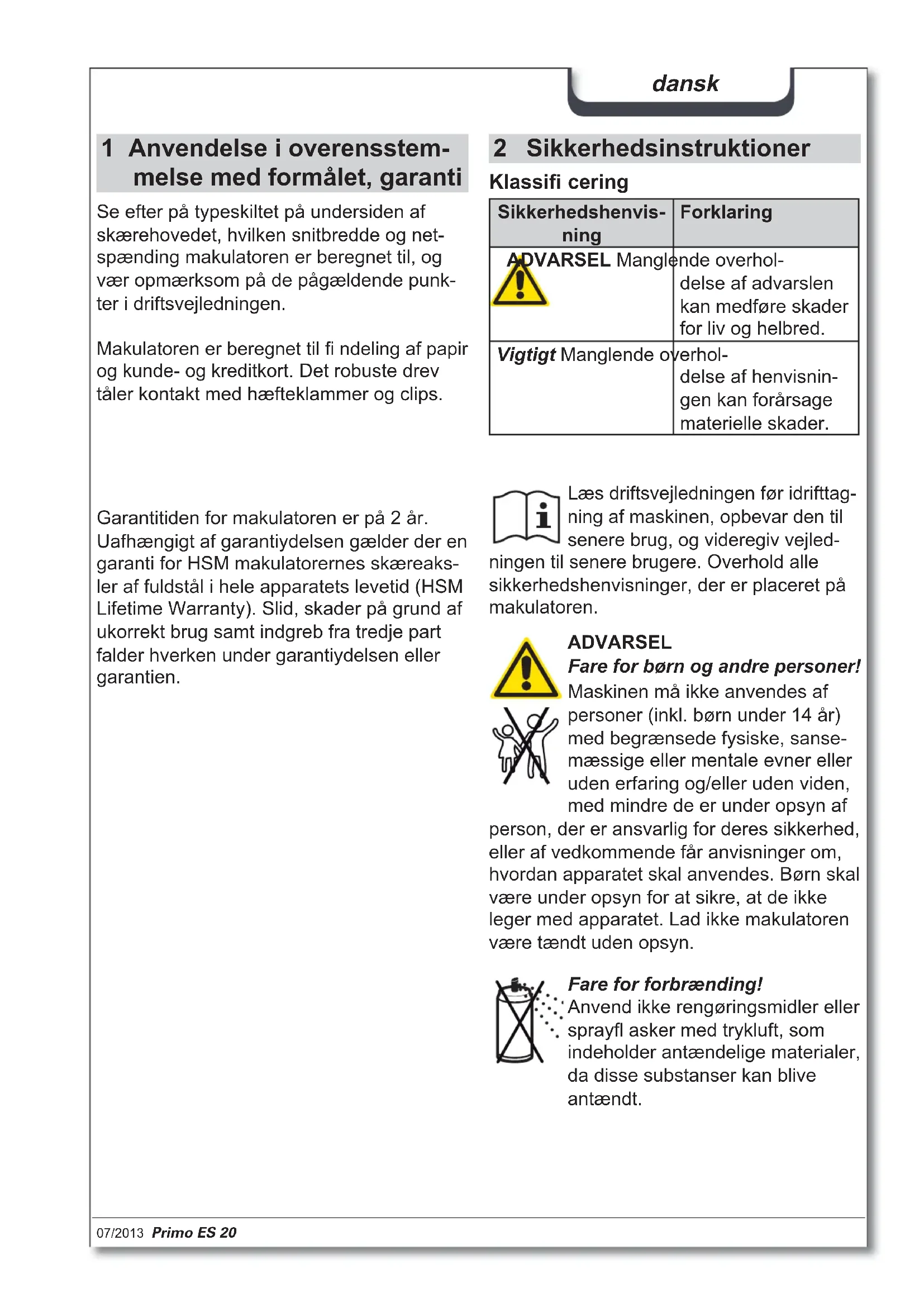 æs driftsvejledningen før idrifttag- ning af maskinen, opbevar den til senere brug, og videregiv vejled- ningen til senere brugere. Overhold alle sikkerhedshenvisninger, der er placeret på makulatoren. ADVARSEL Fare for børn og andre personer! Maskinen må ikke anvendes af personer (inkl. børn under 14 år) med begrænsede fysiske, sanse- mæssige eller mentale evner eller uden erfaring og/eller uden viden, med mindre de er under opsyn af person, der er ansvarlig for deres sikkerhed, eller af vedkommende får anvisninger om, hvordan apparatet skal anvendes. Børn skal være under opsyn for at sikre, at de ikke leger med apparatet. Lad ikke makulatoren være tændt uden opsyn. Garantitiden for makulatoren er på 2 år. Uafhængigt af garantiydelsen gælder der en garanti for HSM makulatorernes skæreaks- ler af fuldstål i hele apparatets levetid (HSM Lifetime Warranty). Slid, skader på grund af ukorrekt brug samt indgreb fra tredje part falder hverken under garantiydelsen eller garantien. Se efter på typeskiltet på undersiden af skærehovedet, hvilken snitbredde og net- spænding makulatoren er beregnet til, og vær opmærksom på de pågældende punk- ter i driftsvejledningen. Fare for forbrænding! Anvend ikke rengøringsmidler eller sprayfl asker med trykluft, som indeholder antændelige materialer, da disse substanser kan blive antændt. Makulatoren er beregnet til fi ndeling af papir og kunde- og kreditkort. Det robuste drev tåler kontakt med hæfteklammer og clips.46 Primo ES 20 07/2013 dansk ADVARSEL Farlig netspænding! Forkert omgang med maskinen kan medfører elektrisk stød. – Kontrollér, at strømnettets spænding og frekvens svarer til oplysningerne på type- skiltet, før netstikket sættes i. – Sørg for, at det er nemt at nå netstikket. – Undgå, at der trænger vand ind i makula- toren. Dyb hverken netkablet eller netstik- ket i vand. – Tag aldrig fat i netstikket med fugtige hænder. – Træk aldrig netstikket ud af stikdåsen med ledningen, men tag altid fat i netstik- ket. – Anvend kun apparatet i tørre indendørs rum. Anvend det aldrig i fugtige rum eller i regn. ADVARSEL Fare for kvæstelser! Grib aldrig ind i spalten på papirtil- førselsåbningen. Fare for kvæstelser på grund af indtrækning! Før ikke langt hår, løstsiddende tøj, slips, tørklæder, halskæder, armbånd osv. hen i nærheden af tilførselsåbningen. Makulér ikke materiale, som har tendens til at danne løkker, f.eks. bånd, sam- mensnøringer, blød plasticfolie. Kontrollér regelmæssigt apparatet og kablet for skader. Sluk makula- toren, hvis den er beskadiget eller ikke fungerer korrekt, samt før den fl yttes eller rengøres, og træk netstik- ket ud. – Hold apparatet, netstikket og netkablet væk fra åben ild og varme fl ader. Ventila- tionsåbningerne skal være fri, og der skal overholdes en afstand til væggen eller til møbler på min. 5 cm. – Apparatet er ikke beregnet til anvendelse umiddelbart i nærhden af skærm- og kon- torarbejdspladser. Servicearbejder, som er forbundet med fjernelse af husafdækninger, må kun udføres af HSM-kunde- service og service-teknikere fra vores samarbejdspartnere. Kundeserviceadresser se side 68. HSM garanterer leveringen af reservedele i op til 10 år, efter denne model ikke læn- gere produceres. Vigtigt Fare på grund af forkert brug Anvend udelukkende maskinen i henhold oplysningerne i kapitlet “Anvendelse i over- ensstemmelse med formålet”.07/2013 Primo ES 20 47 dansk 3 Oversigt 1 Affaldsbeholder 2 Skærehoved 3 Sikkerhedsinstruktioner, sikkerhedsele- ment 4 Tilførselsåbning til papir og kunde-/kre- ditkort 5 Start-stop-automatik 6 Reverseringstast R: returløb 7 Typeskilt på undersiden af skærehovedet 4 Leverance