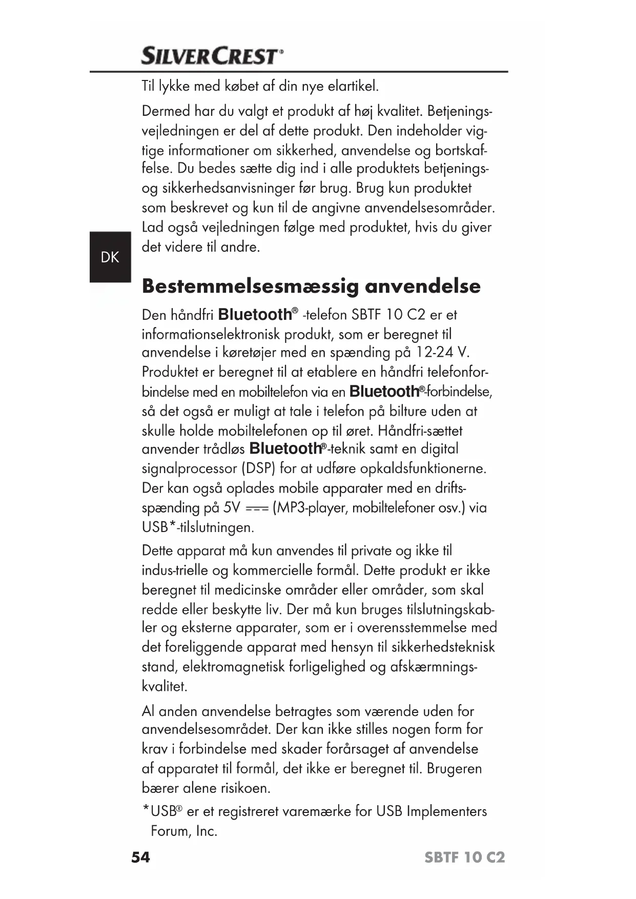 SBTF 10 C2 Til lykke med købet af din nye elartikel. Dermed har du valgt et produkt af høj kvalitet. Betjenings- vejledningen er del af dette produkt. Den indeholder vig- tige informationer om sikkerhed, anvendelse og bortskaf- felse. Du bedes sætte dig ind i alle produktets betjenings- og sikkerhedsanvisninger før brug. Brug kun produktet som beskrevet og kun til de angivne anvendelsesområder. Lad også vejledningen følge med produktet, hvis du giver det videre til andre. Bestemmelsesmæssig anvendelse Den håndfri Bluetooth