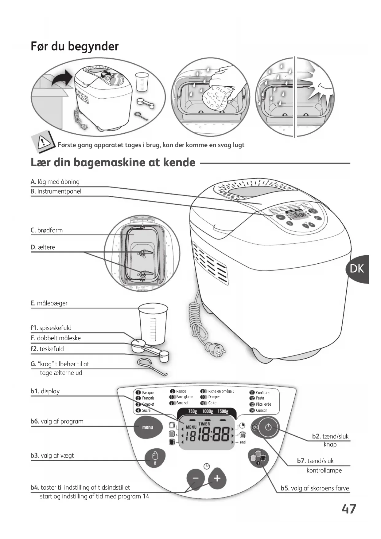 - Nunca coloque o corpo do aparelho nem a tampa dentro de água. Limpeza e manutenção Conselhos de segurança TEFAL-OW5000-NC00017447_TEFAL-OW5000-NC00017447 26/07/10 10:16 Page46BasiqueFrançaisCompletRapideSans glutenSans selRiche en oméga 3Damper Cake SucréConfiturePastaPâte levéeCuisson Før du begynder Bas iqueFran çai sCom pletRap ideSan s gl utenSan s se lRic he e n om éga 3Dam perCak eSCon fitu rePast aPât e le véeC Første gang apparatet tages i brug, kan der komme en svag lugt Lær din bagemaskine at kende A. låg med åbning B. instrumentpanel f2. teskefuld b1. display b2. tænd/sluk knap b7. tænd/sluk kontrollampe b5. valg af skorpens farve F. dobbelt måleske f1. spiseskefuld C. brødform G. “krog” tilbehør til at tage ælterne ud E. målebæger b6. valg af program b3. valg af vægt b4. taster til indstilling af tidsindstillet start og indstilling af tid med program 14 D. æltere