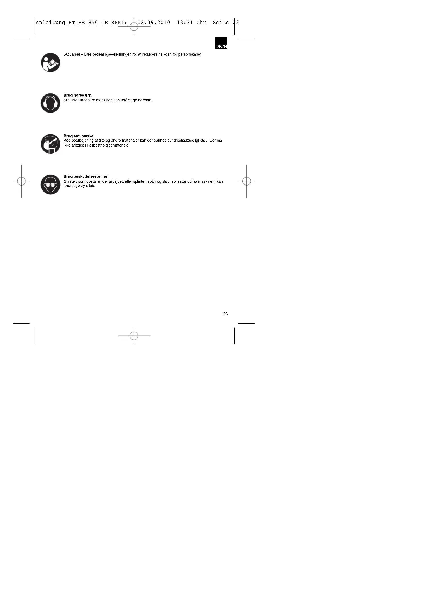 Anleitung_BT_BS_850_1E_SPK1:_ 02.09.2010 13:31 Uhr Seite 2223 DK/N „Advarsel – Læs betjeningsvejledningen for at reducere risikoen for personskade“ Brug høreværn. Støjudviklingen fra maskinen kan forårsage høretab. Brug støvmaske. Ved bearbejdning af træ og andre materialer kan der dannes sundhedsskadeligt støv. Der må ikke arbejdes i asbestholdigt materiale! Brug beskyttelsesbriller. Gnister, som opstår under arbejdet, eller splinter, spån og støv, som står ud fra maskinen, kan forårsage synstab. Anleitung_BT_BS_850_1E_SPK1:_ 02.09.2010 13:31 Uhr Seite 2324 DK/N Vigtigt! Ved brug af el-værktøj er der visse sikkerhedsforanstaltninger, der skal respekteres for at undgå skader på personer og materiel. Læs derfor betjeningsvejledningen grundigt igennem. Opbevar vejledningen et praktisk sted, så du altid kan tage den frem efter behov. Husk at lade betjeningsvejledningen følge med maskinen, hvis du overdrager den til andre! Vi fraskriver os ethvert ansvar for skader på personer eller materiel, som måtte opstå som følge af, at anvisningerne i denne betjeningsvejledning, navnlig vedrørende sikkerhed, tilsidesættes.
