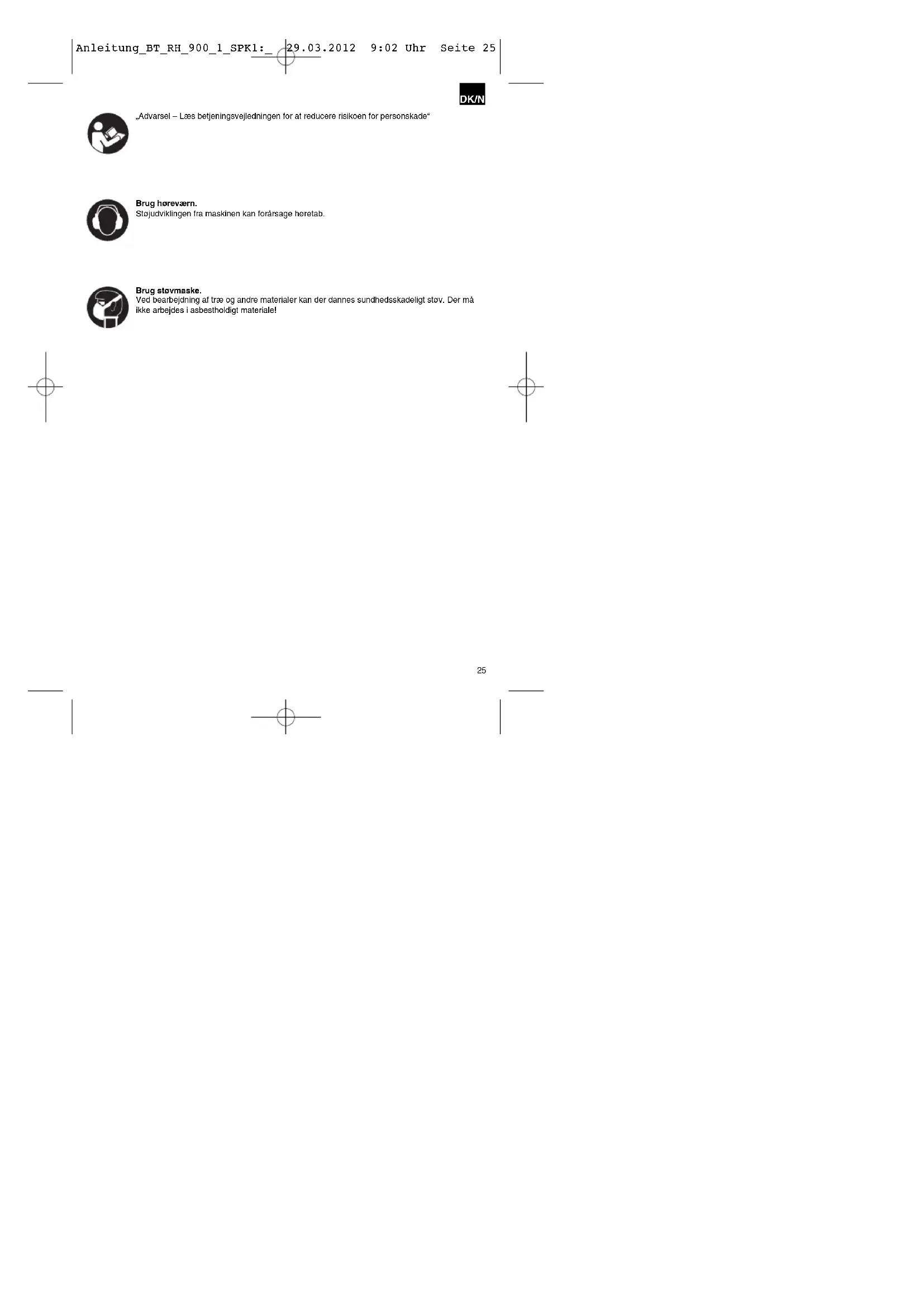Conservate l’apparecchio e i suoi accessori in un luogo buio, asciutto, al riparo dal gelo e non accessibile ai bambini. La temperatura ottimale per la conservazione è compresa tra i 5 e i 30 °C. Conservate l’elettroutensile nell’imballaggio originale. Anleitung_BT_RH_900_1_SPK1:_ 29.03.2012 9:02 Uhr Seite 2425 DK/N „Advarsel – Læs betjeningsvejledningen for at reducere risikoen for personskade“ Brug høreværn. Støjudviklingen fra maskinen kan forårsage høretab. Brug støvmaske. Ved bearbejdning af træ og andre materialer kan der dannes sundhedsskadeligt støv. Der må ikke arbejdes i asbestholdigt materiale! Anleitung_BT_RH_900_1_SPK1:_ 29.03.2012 9:02 Uhr Seite 2526 DK/N Vigtigt! Ved brug af el-værktøj er der visse sikkerhedsforanstaltninger, der skal respekteres for at undgå skader på personer og materiel. Læs derfor betjeningsvejledningen grundigt igennem. Opbevar vejledningen et praktisk sted, så du altid kan tage den frem efter behov. Husk at lade betjeningsvejledningen følge med maskinen, hvis du overdrager den til andre! Vi fraskriver os ethvert ansvar for skader på personer eller materiel, som måtte opstå som følge af, at anvisningerne i denne betjeningsvejledning, navnlig vedrørende sikkerhed, tilsidesættes.