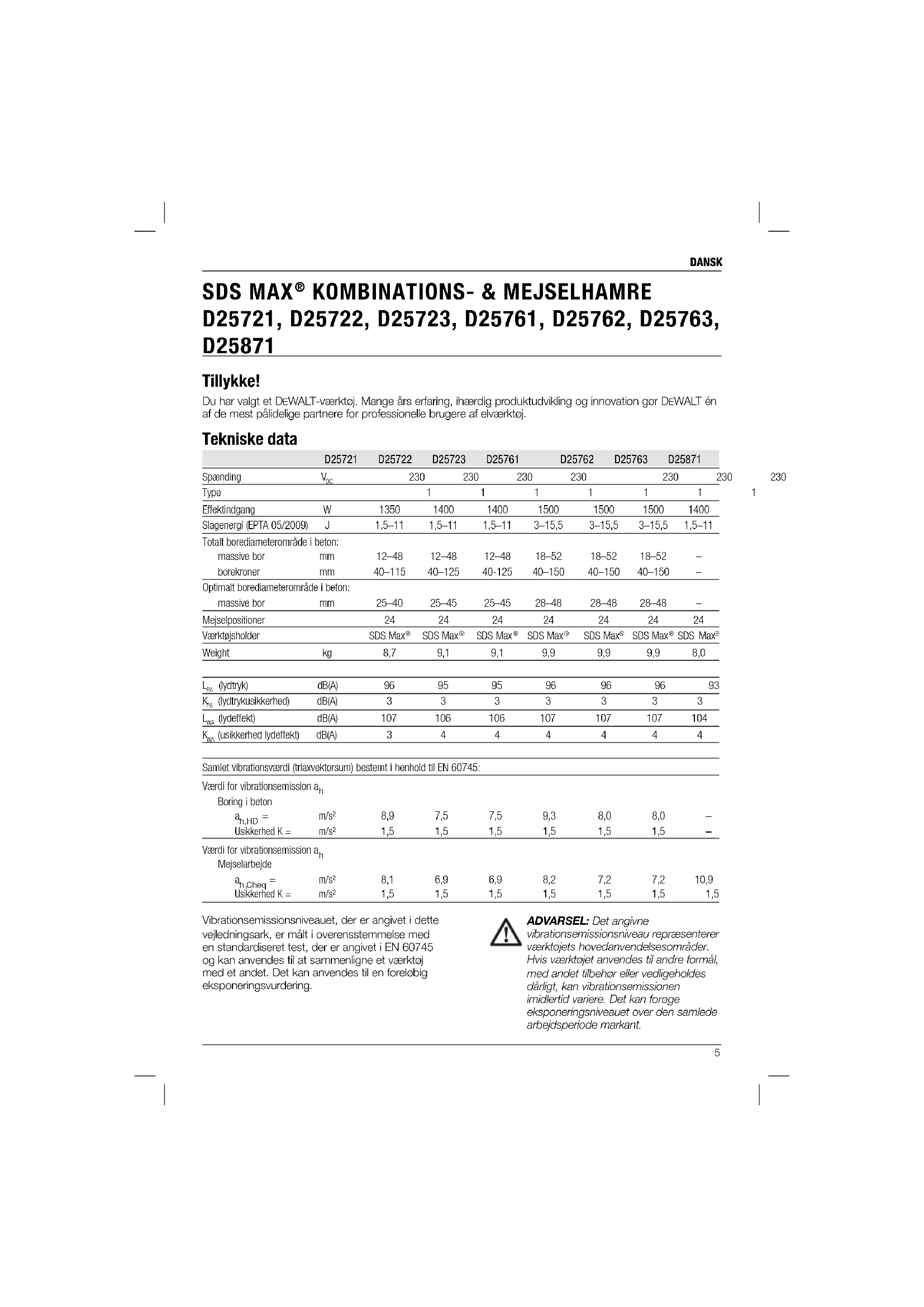 Tillykke! Du har valgt et DEWALT-værktøj. Mange års erfaring, ihærdig produktudvikling og innovation gør DEWALT én af de mest pålidelige partnere for professionelle brugere af elværktøj. Tekniske data D25721 D25722 D25723 D25761 D25762 D25763 D25871 Spænding V