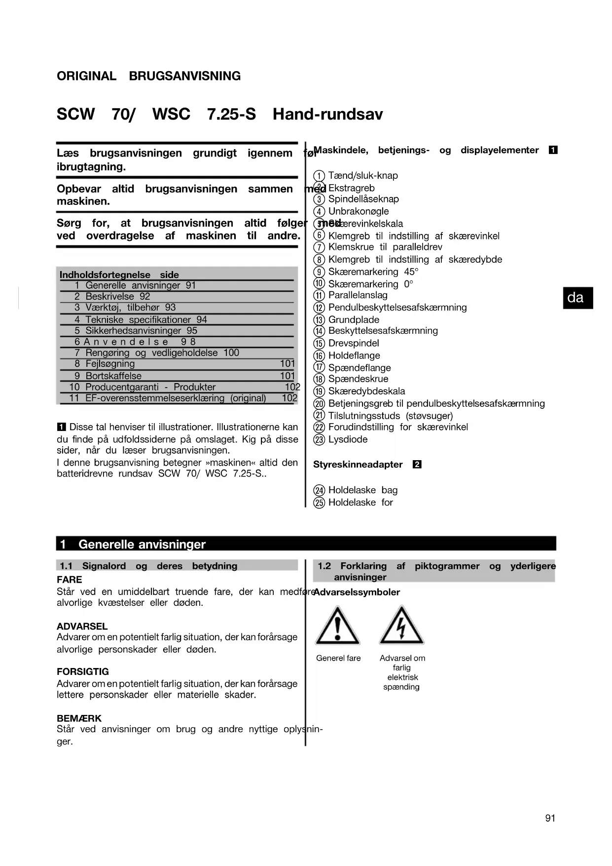 Printed: 14.05.2014 | Doc-Nr: PUB / 5070536 / 000 / 02ORIGINAL BRUGSANVISNING SCW 70/ WSC 7.25‑S Hand‑rundsav Læs brugsanvisningen grundigt igennem før ibrugtagning. Opbevar altid brugsanvisningen sammen med maskinen. Sørg for, at brugsanvisningen altid følger med ved overdragelse af maskinen til andre. Indholdsfortegnelse side1 Generelle anvisninger 912 Beskrivelse 923 Værktøj, tilbehør 934 Tekniske specifikationer 945 Sikkerhedsanvisninger 956Anvendelse 987 Rengøring og vedligeholdelse 1008 Fejlsøgning 1019 Bortskaffelse 10110 Producentgaranti - Produkter 10211 EF-overensstemmelseserklæring (original) 102 1 Disse tal henviser til illustrationer. Illustrationerne kan dufindepåudfoldssidernepåomslaget.Kigpådisse sider, når du læser brugsanvisningen. I denne brugsanvisning betegner »maskinen« altid den batteridrevne rundsav SCW 70/ WSC 7.25-S..Maskindele, betjenings‑ og displayelementer 1 Tænd/sluk-knap Ekstragreb Spindellåseknap Unbrakonøgle Skærevinkelskala Klemgreb til indstilling af skærevinkel Klemskrue til paralleldrev Klemgreb til indstilling af skæredybde Skæremarkering 45° Skæremarkering 0° Parallelanslag Pendulbeskyttelsesafskærmning Grundplade Beskyttelsesafskærmning Drevspindel Holdeflange Spændeflange Spændeskrue Skæredybdeskala