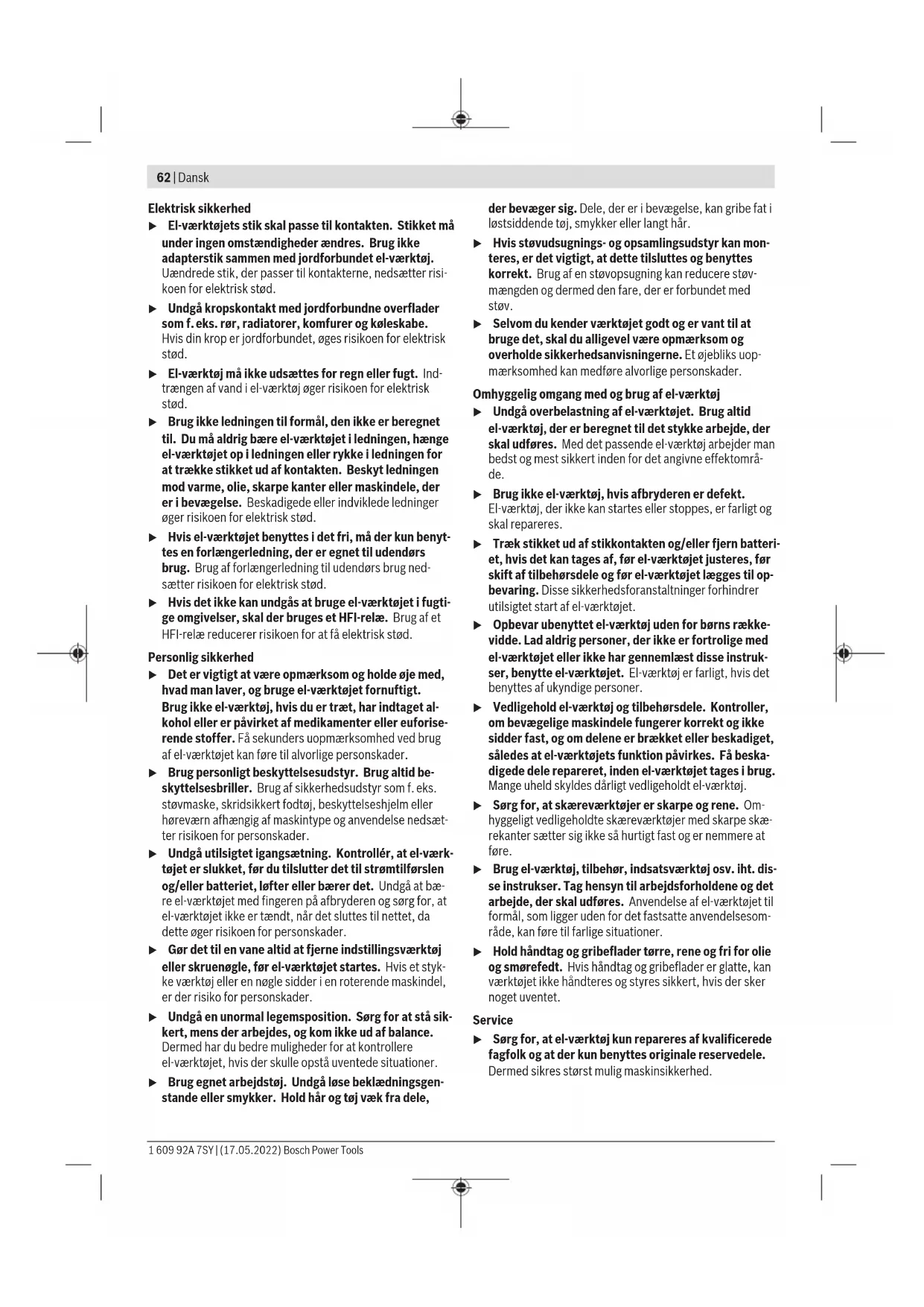 1,5 1,5 1,5 Det svingningsniveau og støjemissionsniveau, der fremgår af anvisningerne, er målt iht. en standardiseret måleværdi og kan anvendes til sammenligning af elværktøj med hinanden. De er også egnet til en foreløbig vurdering af svingnings- og støjemissionen. Det angivne svingnings- og støjemissionsniveau repræsente- rer de væsentlige anvendelser af el‑værktøjet. Hvis el‑værk- tøjet dog anvendes til andre formål, med afvigende indsats- værktøj eller utilstrækkelig vedligeholdelse, kan svingnings- og støjemissionsniveauet afvige. Dette kan føre til en betyde- lig forøgelse af svingnings- og støjemissionen i hele arbejds- tidsrummet. Til en nøjagtig vurdering af svingnings- og støjemissionen bør der også tages højde for de tider, i hvilke værktøjet er sluk- ket eller godt nok kører, men rent faktisk ikke anvendes. Det- te kan føre til en betydelig reduktion af svingnings- og støje- missionsniveauet i hele arbejdstidsrummet. Fastlæg ekstra sikkerhedsforanstaltninger til beskyttelse af brugeren mod svingningers virkning som f.eks.: Vedligehol- delse af el‑værktøj og indsatsværktøj, holde hænder varme, organisation af arbejdsforløb. Montering u Anvend kun savklinger, hvis max. tilladte hastighed er højere end dit el‑værktøjs omdrejningstal i ubelastet tilstand. Bosch Power Tools 1 609 92A 7SY | (17.05.2022)66 | Dansk Isætning/skift af rundsavklinge u Træk stikket ud af stikkontakten, før der udføres ar- bejde på el‑værktøjet. u Brug beskyttelseshandsker, når savklingen monteres. Berøring med savklingen er forbundet med kvæstelsesfa- re. u Brug aldrig slibeskiver som indsatsværktøj. u Brug kun savklinger, der svarer til de tekniske data, der er angivet i denne vejledning og på elværktøjets typeskilt, og som er kontrolleret og mærket tilsvaren- de iht. EN847‑1. Valg af savklinge Du finder en oversigt over anbefalede savklinger i slutningen af denne vejledning. Afmontering af savklinge (se billede A) Ved skift af værktøj anbefales det at lægge el-værktøjet på forsiden af motorhuset. – Tryk på spindelåseknappen (5), og hold den inde. u Aktivér kun spindellåseknappen (5), når savspindlen står stille. Ellers kan el‑værktøjet blive beskadiget. – Skru med unbrakonøglen (4) spændeskruen (20) ud i drejeretning ➊. – Sving pendulbeskyttelsesskærmen (12) tilbage, og hold den fast. – Tag spændeflangen (21) og savklingen (22) af savspind- len (24). Montering af savklinge (se billede A) Ved skift af værktøj anbefales det at lægge el-værktøjet på forsiden af motorhuset. – Rengør savklingen (22) og alle spændedele, der skal monteres. – Sving pendulbeskyttelsesskærmen (12) tilbage, og hold den fast. – Sæt savklingen (22) på holdeflangen (23). Tændernes skæreretning (pilenes retning på savklingen) og retning- spilen på beskyttelsesskærmen (12) skal stemme overens. – Sæt spændeflangen (21) på, og skru spændeskruen (20) fast i drejeretningen ➋. Sørg for, at holdeflange (23) og spændeflange (21) monteres korrekt. – Tryk på spindelåseknappen (5), og hold den inde. – Spænd med unbrakonøglen (4) spændeskruen (20) fast i drejeretningen ➋. Tilspændingsmomentet skal være 6−9Nm, hvilket svarer til håndfast plus ¼ omdrejning. Støv-/spånudsugning Støv fra materialer som f.eks. blyholdig maling, nogle træ- sorter, mineraler og metal kan være sundhedsfarlige. Berø- ring eller indånding af støv kan føre til allergiske reaktioner og/eller åndedrætssygdomme hos brugeren eller personer, der opholder sig i nærheden af arbejdspladsen. Bestemt støv som f.eks. ege- eller bøgestøv gælder som kræftfremkaldende, især i forbindelse med ekstra stoffer til træbehandling (chromat, træbeskyttelsesmiddel). Asbest- holdigt materiale må kun bearbejdes af fagfolk. – Brug helst en støvopsugning, der egner sig til materialet. – Sørg for god udluftning af arbejdspladsen. – Det anbefales at bære åndeværn med filterklasse P2. Overhold forskrifterne, der gælder i dit land vedr. de materi- aler, der skal bearbejdes. u Undgå at der samler sig støv på arbejdspladsen. Støv kan let antænde sig selv. Montering af udsugningsadapter (se billede B) Sæt udsugningsadapteren (26) på spånudkastet (16), indtil den går i indgreb. Sørg for også at sikre udsugningsadapte- ren (26) med skruen (25). På udsugningsadapteren (26) kan der tilsluttes en udsug- ningsslange med en diameter på 35 mm. u Udsugningsadapteren må ikke være monteret uden tilsluttet ekstern udsugning. Ellers kan udsugnings- kanalen tilstoppes. u Der må ikke tilsluttes en støvpose til udsugningsadap- teren. Ellers kan udsugningsssystemet tilstoppes. Udsugningsadapteren (26) skal rengøres med regelmæssige mellemrum for at sikre en optimal udsugning. Opsugning med fremmed støvsuger Forbind udsugningsslangen med en støvsuger (tilbehør). Du finder en oversigt over tilslutning til forskellige støvsugere i slutningen af denne vejledning. El-værktøjet kan tilsluttes direkte til stikkontakten på en Bosch-universalstøvsuger med fjernstartanordning. Denne startes automatisk, når el-værktøjet tændes. Støvsugeren skal være egnet til det materiale, som skal op- suges. Anvend en specialstøvsuger til opsugning af særligt sund- hedsfarligt, kræftfremkaldende eller tørt støv. Brug u Træk stikket ud af stikkontakten, før der udføres ar- bejde på el‑værktøjet. Driftstilstande Indstilling af snitdybde (se billede C) u Tilpas snitdybden til emnets tykkelse. Der bør være mindre end en fuld tandhøjde synlig under emnet. Løsn spændehåndtaget (27). For at få en mindre snitdybde trækker du saven væk fra bundpladen (14), og for at forøge snitdybde trykker du saven mod bundpladen (14). Indstil det ønskede mål på snitdybdeskalaen. Spænd spændehånd- taget (27) igen. Hvis du efter at have løsnet spændehåndtaget (27) ikke kan justere snitdybden helt som ønsket, skal du trække sp