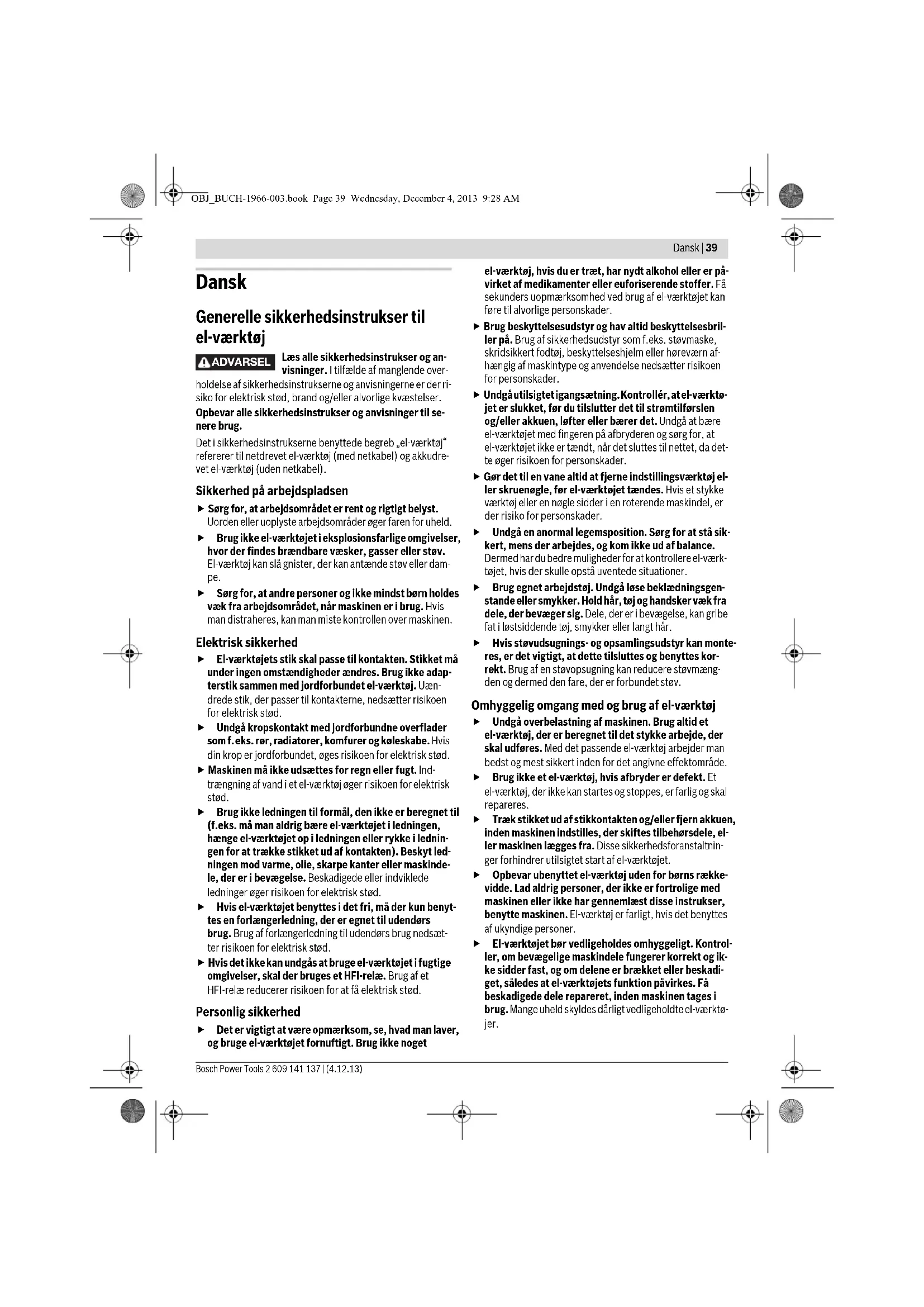 Toebehoren kiezen – 163 OBJ_BUCH-1966-003.book Page 38 Wednesday, December 4, 2013 9:28 AMDansk | 39 Bosch Power Tools 2 609 141 137 | (4.12.13) Dansk Generelle sikkerhedsinstrukser til el-værktøj Læs alle sikkerhedsinstrukser og an- visninger. I tilfælde af manglende over- holdelse af sikkerhedsinstrukserne og anvisningerne er der ri- siko for elektrisk stød, brand og/eller alvorlige kvæstelser. Opbevar alle sikkerhedsinstrukser og anvisninger til se- nere brug. Det i sikkerhedsinstrukserne benyttede begreb „el-værktøj“ refererer til netdrevet el-værktøj (med netkabel) og akkudre- vet el-værktøj (uden netkabel). Sikkerhed på arbejdspladsen Sørg for, at arbejdsområdet er rent og rigtigt belyst. Uorden eller uoplyste arbejdsområder øger faren for uheld. Brug ikke el-værktøjet i eksplosionsfarlige omgivelser, hvor der findes brændbare væsker, gasser eller støv. El-værktøj kan slå gnister, der kan antænde støv eller dam- pe. Sørg for, at andre personer og ikke mindst børn holdes væk fra arbejdsområdet, når maskinen er i brug. Hvis man distraheres, kan man miste kontrollen over maskinen. Elektrisk sikkerhed El-værktøjets stik skal passe til kontakten. Stikket må under ingen omstændigheder ændres. Brug ikke adap- terstik sammen med jordforbundet el-værktøj. Uæn- drede stik, der passer til kontakterne, nedsætter risikoen for elektrisk stød. Undgå kropskontakt med jordforbundne overflader som f.eks. rør, radiatorer, komfurer og køleskabe. Hvis din krop er jordforbundet, øges risikoen for elektrisk stød. Maskinen må ikke udsættes for regn eller fugt. Ind- trængning af vand i et el-værktøj øger risikoen for elektrisk stød. Brug ikke ledningen til formål, den ikke er beregnet til (f.eks. må man aldrig bære el-værktøjet i ledningen, hænge el-værktøjet op i ledningen eller rykke i lednin- gen for at trække stikket ud af kontakten). Beskyt led- ningen mod varme, olie, skarpe kanter eller maskinde- le, der er i bevægelse. Beskadigede eller indviklede ledninger øger risikoen for elektrisk stød. Hvis el-værktøjet benyttes i det fri, må der kun benyt- tes en forlængerledning, der er egnet til udendørs brug. Brug af forlængerledning til udendørs brug nedsæt- ter risikoen for elektrisk stød. Hvis det ikke kan undgås at bruge el-værktøjet i fugtige omgivelser, skal der bruges et HFI-relæ. Brug af et HFI-relæ reducerer risikoen for at få elektrisk stød. Personlig sikkerhed Det er vigtigt at være opmærksom, se, hvad man laver, og bruge el-værktøjet fornuftigt. Brug ikke noget el-værktøj, hvis du er træt, har nydt alkohol eller er på- virket af medikamenter eller euforiserende stoffer. Få sekunders uopmærksomhed ved brug af el-værktøjet kan føre til alvorlige personskader. Brug beskyttelsesudstyr og hav altid beskyttelsesbril- ler på. Brug af sikkerhedsudstyr som f.eks. støvmaske, skridsikkert fodtøj, beskyttelseshjelm eller høreværn af- hængig af maskintype og anvendelse nedsætter risikoen for personskader. Undgå utilsigtet igangsætning. Kontrollér, at el-værktø- jet er slukket, før du tilslutter det til strømtilførslen og/eller akkuen, løfter eller bærer det. Undgå at bære el-værktøjet med fingeren på afbryderen og sørg for, at el-værktøjet ikke er tændt, når det sluttes til nettet, da det- te øger risikoen for personskader. Gør det til en vane altid at fjerne indstillingsværktøj el- ler skruenøgle, før el-værktøjet tændes. Hvis et stykke værktøj eller en nøgle sidder i en roterende maskindel, er der risiko for personskader. Undgå en anormal legemsposition. Sørg for at stå sik- kert, mens der arbejdes, og kom ikke ud af balance. Dermed har du bedre muligheder for at kontrollere el-værk- tøjet, hvis der skulle opstå uventede situationer. Brug egnet arbejdstøj. Undgå løse beklædningsgen- stande eller smykker. Hold hår, tøj og handsker væk fra dele, der bevæger sig. Dele, der er i bevægelse, kan gribe fat i løstsiddende tøj, smykker eller langt hår. Hvis støvudsugnings- og opsamlingsudstyr kan monte- res, er det vigtigt, at dette tilsluttes og benyttes kor- rekt. Brug af en støvopsugning kan reducere støvmæng- den og dermed den fare, der er forbundet støv. Omhyggelig omgang med og brug af el-værktøj Undgå overbelastning af maskinen. Brug altid et el-værktøj, der er beregnet til det stykke arbejde, der skal udføres. Med det passende el-værktøj arbejder man bedst og mest sikkert inden for det angivne effektområde. Brug ikke et el-værktøj, hvis afbryder er defekt. Et el-værktøj, der ikke kan startes og stoppes, er farlig og skal repareres. Træk stikket ud af stikkontakten og/eller fjern akkuen, inden maskinen indstilles, der skiftes tilbehørsdele, el- ler maskinen lægges fra. Disse sikkerhedsforanstaltnin- ger forhindrer utilsigtet start af el-værktøjet. Opbevar ubenyttet el-værktøj uden for børns række- vidde. Lad aldrig personer, der ikke er fortrolige med maskinen eller ikke har gennemlæst disse instrukser, benytte maskinen. El-værktøj er farligt, hvis det benyttes af ukyndige personer. El-værktøjet bør vedligeholdes omhyggeligt. Kontrol- ler, om bevægelige maskindele fungerer korrekt og ik- ke sidder fast, og om delene er brækket eller beskadi- get, således at el-værktøjets funktion påvirkes. Få beskadigede dele repareret, inden maskinen tages i brug. Mange uheld skyldes dårligt vedligeholdte el-værktø- jer. ADVARSEL OBJ_BUCH-1966-003.book Page 39 Wednesday, December 4, 2013 9:28 AM40 | Dansk 2 609 141 137 | (4.12.13) Bosch Power Tools Sørg for, at skæreværktøjer er skarpe og rene. Omhyg- geligt vedligeholdte skæreværktøjer med skarpe skære- kanter sætter sig ikke så hurtigt fast og er nemmere at føre. Brug el-værktøj, tilbehør, indsatsværktøj osv. iht. dis- se instrukser. Tag hensyn til arbejdsforholdene og det arbejde, der skal udføres. Anvendelse af el-værktøjet til formål, som ligger uden 