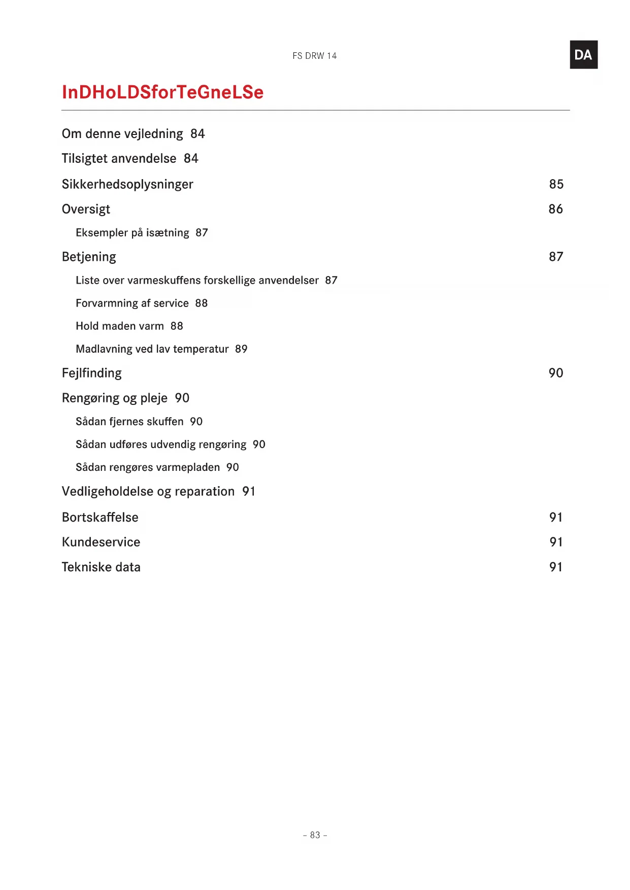 indholdsforTegnelse Om denne vejledning 84 Tilsigtet anvendelse 84 Sikkerhedsoplysninger 85 Oversigt 86 Eksempler på isætning 87 Betjening 87 Liste over varmeskuffens forskellige anvendelser 87 Forvarmning af service 88 Hold maden varm 88 Madlavning ved lav temperatur 89 Fejlfinding 90 Rengøring og pleje 90 Sådan fjernes skuffen 90 Sådan udføres udvendig rengøring 90 Sådan rengøres varmepladen 90 Vedligeholdelse og reparation 91 Bortskaffelse 91 Kundeservice 91 Tekniske data 91FS DRW 14 – 84 –