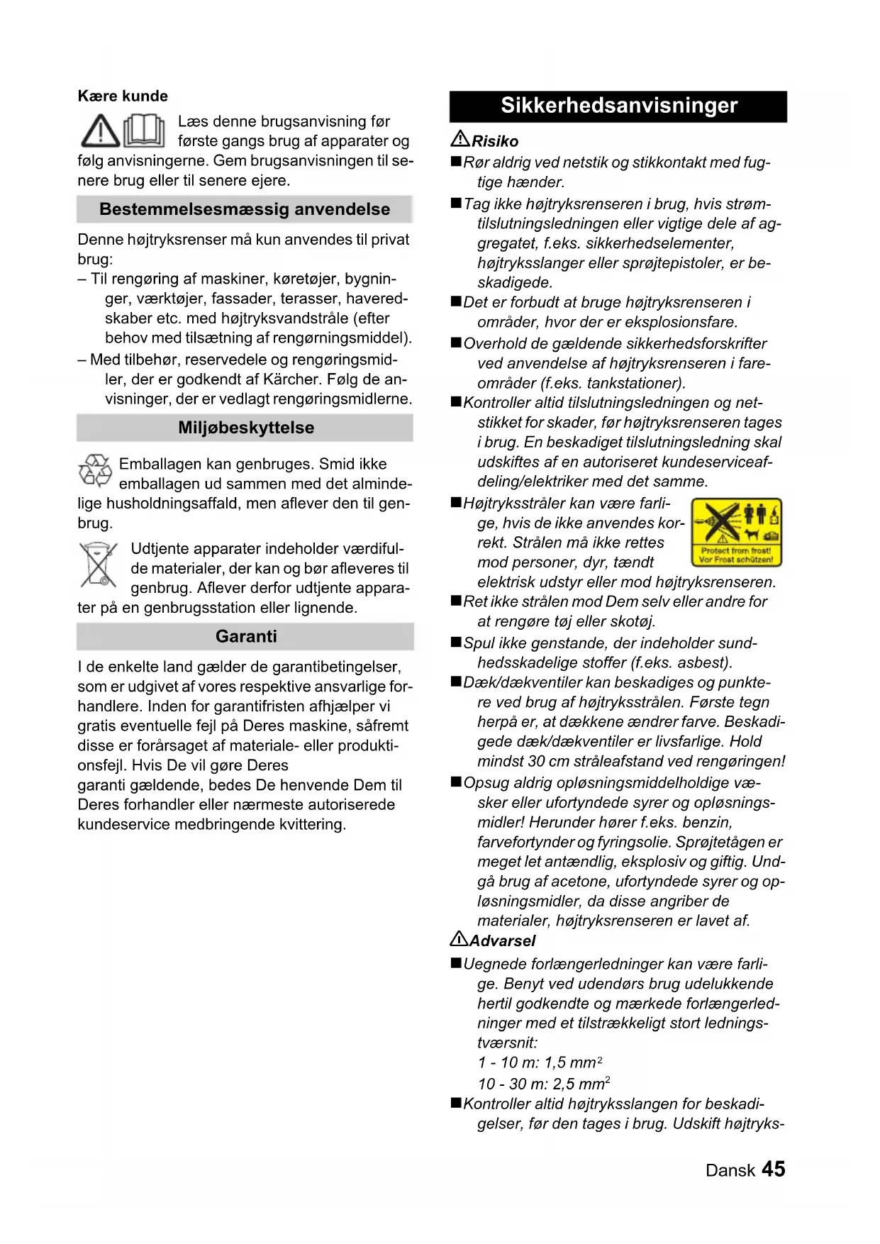 CEE) 2000/14/CE Normas harmonizadas aplicadas EN 60335–1 EN 60335–2–79 EN 55014–1: 2000 + A1: 2001 + A2: 2002 EN 55014–2: 1997 + A1: 2001 EN 61000–3–2: 2000 + A2: 2005 EN 61000–3–3: 1995 + A1: 2001 Processo aplicado de avaliação de conformi- dade Anexo V Nível de potência acústica dB(A) Medido: 85 dB(A) Garantido: 87 dB(A)Dansk 45 Kære kunde Læs denne brugsanvisning før første gangs brug af apparater og følg anvisningerne. Gem brugsanvisningen til se- nere brug eller til senere ejere. Denne højtryksrenser må kun anvendes til privat brug: – Til rengøring af maskiner, køretøjer, bygnin- ger, værktøjer, fassader, terasser, havered- skaber etc. med højtryksvandstråle (efter behov med tilsætning af rengørningsmiddel). – Med tilbehør, reservedele og rengøringsmid- ler, der er godkendt af Kärcher. Følg de an- visninger, der er vedlagt rengøringsmidlerne. Emballagen kan genbruges. Smid ikke emballagen ud sammen med det alminde- lige husholdningsaffald, men aflever den til gen- brug. Udtjente apparater indeholder værdiful- de materialer, der kan og bør afleveres til genbrug. Aflever derfor udtjente appara- ter på en genbrugsstation eller lignende. I de enkelte land gælder de garantibetingelser, som er udgivet af vores respektive ansvarlige for- handlere. Inden for garantifristen afhjælper vi gratis eventuelle fejl på Deres maskine, såfremt disse er forårsaget af materiale- eller produkti- onsfejl. Hvis De vil gøre Deres garanti gældende, bedes De henvende Dem til Deres forhandler eller nærmeste autoriserede kundeservice medbringende kvittering. Risiko ! Rør aldrig ved netstik og stikkontakt med fug- tige hænder. ! Tag ikke højtryksrenseren i brug, hvis strøm- tilslutningsledningen eller vigtige dele af ag- gregatet, f.eks. sikkerhedselementer, højtryksslanger eller sprøjtepistoler, er be- skadigede. ! Det er forbudt at bruge højtryksrenseren i områder, hvor der er eksplosionsfare. ! Overhold de gældende sikkerhedsforskrifter ved anvendelse af højtryksrenseren i fare- områder (f.eks. tankstationer). ! Kontroller altid tilslutningsledningen og net- stikket for skader, før højtryksrenseren tages i brug. En beskadiget tilslutningsledning skal udskiftes af en autoriseret kundeserviceaf- deling/elektriker med det samme. ! Højtryksstråler kan være farli- ge, hvis de ikke anvendes kor- rekt. Strålen må ikke rettes mod personer, dyr, tændt elektrisk udstyr eller mod højtryksrenseren. ! Ret ikke strålen mod Dem selv eller andre for at rengøre tøj eller skotøj. ! Spul ikke genstande, der indeholder sund- hedsskadelige stoffer (f.eks. asbest). ! Dæk/dækventiler kan beskadiges og punkte- re ved brug af højtryksstrålen. Første tegn herpå er, at dækkene ændrer farve. Beskadi- gede dæk/dækventiler er livsfarlige. Hold mindst 30 cm stråleafstand ved rengøringen! ! Opsug aldrig opløsningsmiddelholdige væ- sker eller ufortyndede syrer og opløsnings- midler! Herunder hører f.eks. benzin, farvefortynder og fyringsolie. Sprøjtetågen er meget let antændlig, eksplosiv og giftig. Und- gå brug af acetone, ufortyndede syrer og op- løsningsmidler, da disse angriber de materialer, højtryksrenseren er lavet af. 몇 Advarsel ! Uegnede forlængerledninger kan være farli- ge. Benyt ved udendørs brug udelukkende hertil godkendte og mærkede forlængerled- ninger med et tilstrækkeligt stort lednings- tværsnit: