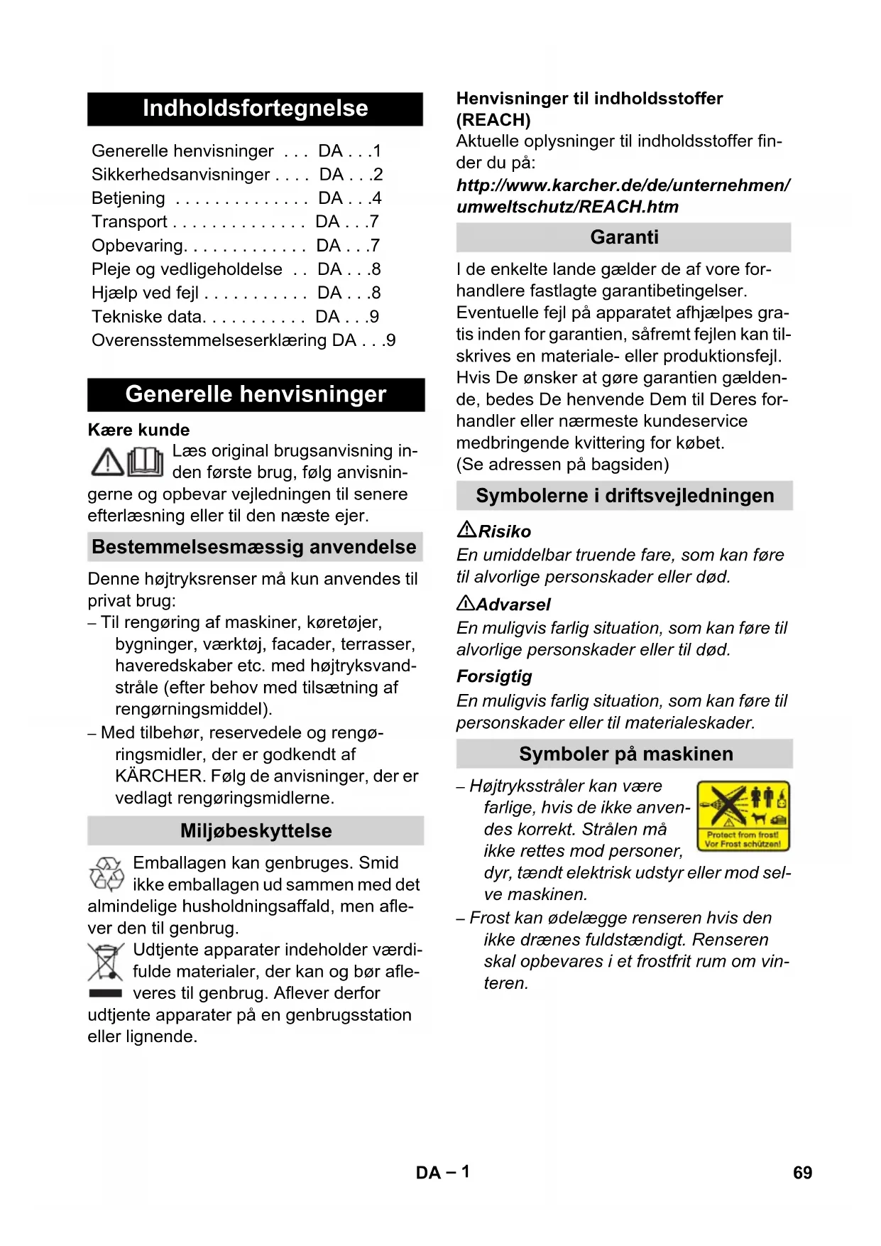 - Overensstemmelseserklæring DA Generelle henvisninger Bestemmelsesmæssig anvendelse Miljøbeskyttelse Garanti Symbolerne i driftsvejledningen Symboler på maskinen 69DA– 2 Risiko Rør aldrig ved netstik og stikkontakt med fugtige hænder. Tag ikke maskinen i brug, hvis strømtil- slutningsledningen eller vigtige dele af maskinen, som f.eks. sikkerhedsele- menter, højtryksslanger eller sprøjtepi- stoler, er beskadigede. Kontroller altid tilslutningsledningen og netstikket for skader, før maskinen ta- ges i brug. En beskadiget tilslutnings- ledning skal omgående udskiftes af en autoriseret kundeserviceafdeling/el-in- stallatør. Kontroller altid højtryksslangen for be- skadigelser, før den tages i brug. Ud- skift højtryksslangen med det samme, hvis den er beskadiget. Det er forbudt at bruge højtryksrense- ren i områder, hvor der er eksplosions- fare. Overhold de gældende sikkerhedsfor- skrifter ved anvendelse af højtryksren- seren i fareområder (f.eks. tankstationer). Højtryksstråler kan være farlige, hvis de ikke anvendes korrekt. Strålen må ikke rettes mod personer, dyr, tændt elek- trisk udstyr eller mod højtryksrenseren. Ret ikke strålen mod Dem selv eller an- dre for at rengøre tøj eller skotøj. Spul ikke genstande, der indeholder sundhedsskadelige stoffer (f.eks. as- best). Dæk/dækventiler kan beskadiges og punktere ved brug af højtryksstrålen. Første tegn herpå er, at dækkene æn- drer farve. Beskadigede dæk/dækventi- ler er livsfarlige. Hold mindst 30 cm stråleafstand ved rengøringen! Eksplosionsrisiko! Brændbare væsker må ikke sprøjtes. Opsug aldrig opløsningsmiddelholdige væsker eller ufortyndede syrer og op- løsningsmidler! Herunder hører f.eks. benzin, farvefortynder og fyringsolie. Sprøjtetågen er meget let antændelig, eksplosiv og giftig. Undgå brug af ace- tone, ufortyndede syrer og opløsnings- midler, da disse angriber maskinens materialer. 몇 Advarsel Stikket og koblingen af forlængerlednin- ger skal være vandtæt og må ikke ligge i vand. Uegnede forlængerledninger kan være farlige. Benyt udelukkende godkendte og mærkede forlængerledninger med et tilstrækkeligt stort ledningstværsnit ved udendørs brug: p. 9