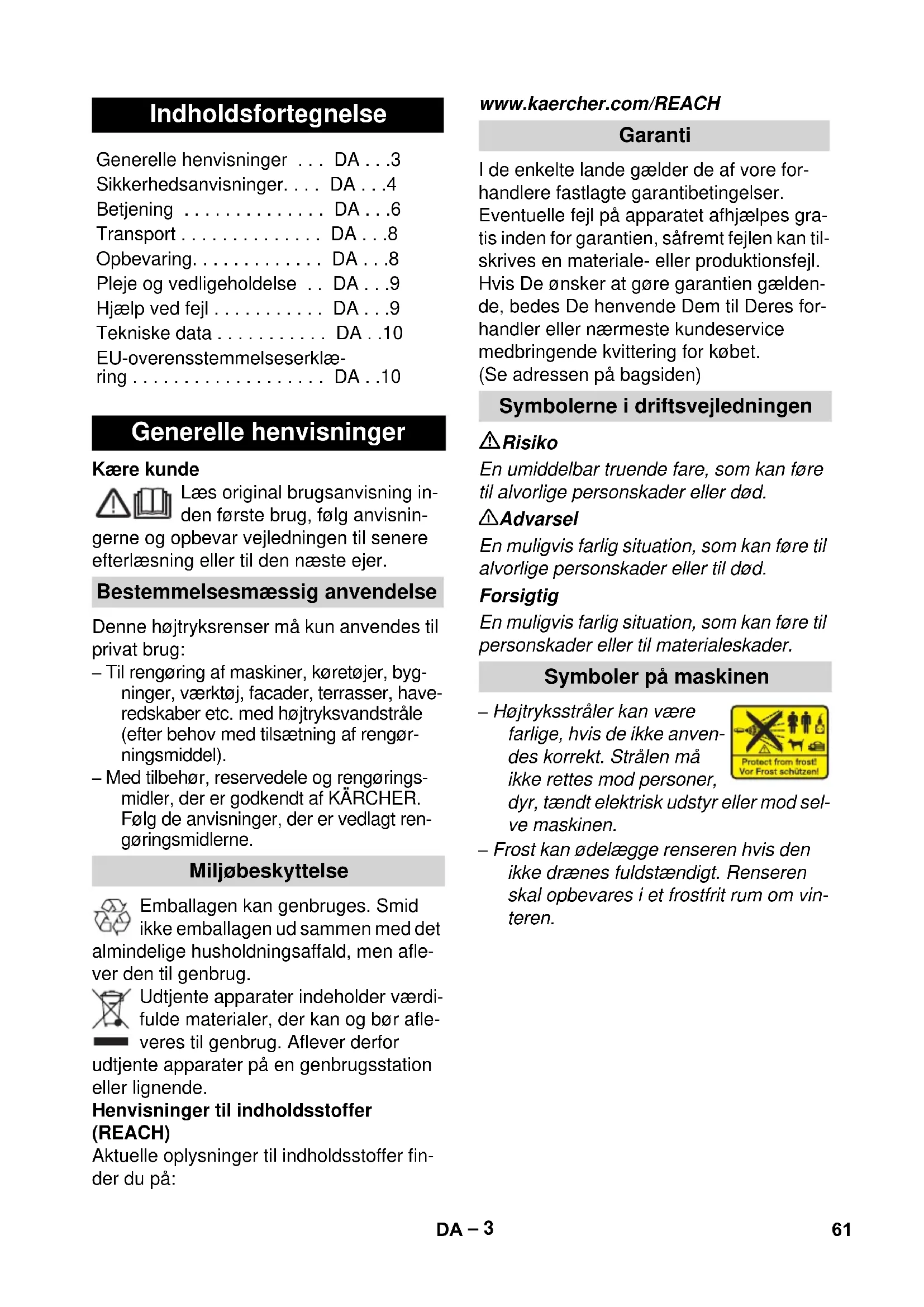 Produto: Maquinas de lavar de alta pressão Tipo: 1.601-xxx Respectivas Directrizes da CE 2006/42/CE (+2009/127/CE) 2004/108/CE 2000/14/CE Normas harmonizadas aplicadas EN 55014–1: 2006 + A1: 2009 EN 55014–2: 1997 + A2: 2008 EN 60335–1 EN 60335–2–79 EN 61000–3–2: 2006 + A2: 2009 EN 61000–3–3: 2008 EN 62233: 2008 Processo aplicado de avaliação de con- formidade 2000/14/CE: Anexo V Nível de potência acústica dB(A) Medido: 93 Garantido: 95 CEO Head of Approbation 60 PT– 3 Kære kunde Læs original brugsanvisning in- den første brug, følg anvisnin- gerne og opbevar vejledningen til senere efterlæsning eller til den næste ejer. Denne højtryksrenser må kun anvendes til privat brug: – Til rengøring af maskiner, køretøjer, byg- ninger, værktøj, facader, terrasser, have- redskaber etc. med højtryksvandstråle (efter behov med tilsætning af rengør- ningsmiddel). – Med tilbehør, reservedele og rengørings- midler, der er godkendt af KÄRCHER. Følg de anvisninger, der er vedlagt ren- gøringsmidlerne. Emballagen kan genbruges. Smid ikke emballagen ud sammen med det almindelige husholdningsaffald, men afle- ver den til genbrug. Udtjente apparater indeholder værdi- fulde materialer, der kan og bør afle- veres til genbrug. Aflever derfor udtjente apparater på en genbrugsstation eller lignende. Henvisninger til indholdsstoffer (REACH) Aktuelle oplysninger til indholdsstoffer fin- der du på: www.kaercher.com/REACH I de enkelte lande gælder de af vore for- handlere fastlagte garantibetingelser. Eventuelle fejl på apparatet afhjælpes gra- tis inden for garantien, såfremt fejlen kan til- skrives en materiale- eller produktionsfejl. Hvis De ønsker at gøre garantien gælden- de, bedes De henvende Dem til Deres for- handler eller nærmeste kundeservice medbringende kvittering for købet. (Se adressen på bagsiden) Risiko En umiddelbar truende fare, som kan føre til alvorlige personskader eller død. 몇 Advarsel En muligvis farlig situation, som kan føre til alvorlige personskader eller til død. Forsigtig En muligvis farlig situation, som kan føre til personskader eller til materialeskader. – Højtryksstråler kan være farlige, hvis de ikke anven- des korrekt. Strålen må ikke rettes mod personer, dyr, tændt elektrisk udstyr eller mod sel- ve maskinen. – Frost kan ødelægge renseren hvis den ikke drænes fuldstændigt. Renseren skal opbevares i et frostfrit rum om vin- teren. Indholdsfortegnelse Generelle henvisninger . . . DA . . .3 Sikkerhedsanvisninger. . . . DA . . .4 Betjening . . . . . . . . . . . . . . DA . . .6 Transport . . . . . . . . . . . . . . DA . . .8 Opbevaring. . . . . . . . . . . . . DA . . .8 Pleje og vedligeholdelse . . DA . . .9 Hjælp ved fejl . . . . . . . . . . . DA . . .9 Tekniske data . . . . . . . . . . . DA . .10 EU-overensstemmelseserklæ- ring . . . . . . . . . . . . . . . . . . . DA . .10 Generelle henvisninger Bestemmelsesmæssig anvendelse Miljøbeskyttelse Garanti Symbolerne i driftsvejledningen Symboler på maskinen 61DA– 4 Risiko Rør aldrig ved netstik og stikkontakt med fugtige hænder. Tag ikke maskinen i brug, hvis strømtil- slutningsledningen eller vigtige dele af maskinen, som f.eks. sikkerhedsele- menter, højtryksslanger eller sprøjtepi- stoler, er beskadigede. Kontroller altid tilslutningsledningen og netstikket for skader, før maskinen ta- ges i brug. En beskadiget tilslutnings- ledning skal omgående udskiftes af en autoriseret kundeserviceafdeling/el-in- stallatør. Kontroller altid højtryksslangen for be- skadigelser, før den tages i brug. Ud- skift højtryksslangen med det samme, hvis den er beskadiget. Det er forbudt at bruge højtryksrenseren i områder, hvor der er eksplosionsfare. Overhold de gældende sikkerhedsfor- skrifter ved anvendelse af højtryksren- seren i fareområder (f.eks. tankstationer). Højtryksstråler kan være farlige, hvis de ikke anvendes korrekt. Strålen må ikke rettes mod personer, dyr, tændt elek- trisk udstyr eller mod højtryksrenseren. Ret ikke strålen mod Dem selv eller an- dre for at rengøre tøj eller skotøj. Spul ikke genstande, der indeholder sund- hedsskadelige stoffer (f.eks. asbest). Dæk/dækventiler kan beskadiges og punktere ved brug af højtryksstrålen. Første tegn herpå er, at dækkene æn- drer farve. Beskadigede dæk/dækventi- ler er livsfarlige. Hold mindst 30 cm stråleafstand ved rengøringen! Eksplosionsrisiko! Brændbare væsker må ikke sprøjtes. Opsug aldrig opløsningsmiddelholdige væsker eller ufortyndede syrer og op- løsningsmidler! Herunder hører f.eks. benzin, farvefortynder og fyringsolie. Sprøjtetågen er meget let antændelig, eksplosiv og giftig. Undgå brug af ace- tone, ufortyndede syrer og opløsnings- midler, da disse angriber maskinens materialer. 몇 Advarsel Stikket og koblingen af forlængerlednin- ger skal være vandtæt og må ikke ligge i vand. Uegnede forlængerledninger kan være farlige. Benyt udelukkende godkendte og mærkede forlængerledninger med et tilstrækkeligt stort ledningstværsnit ved udendørs brug: