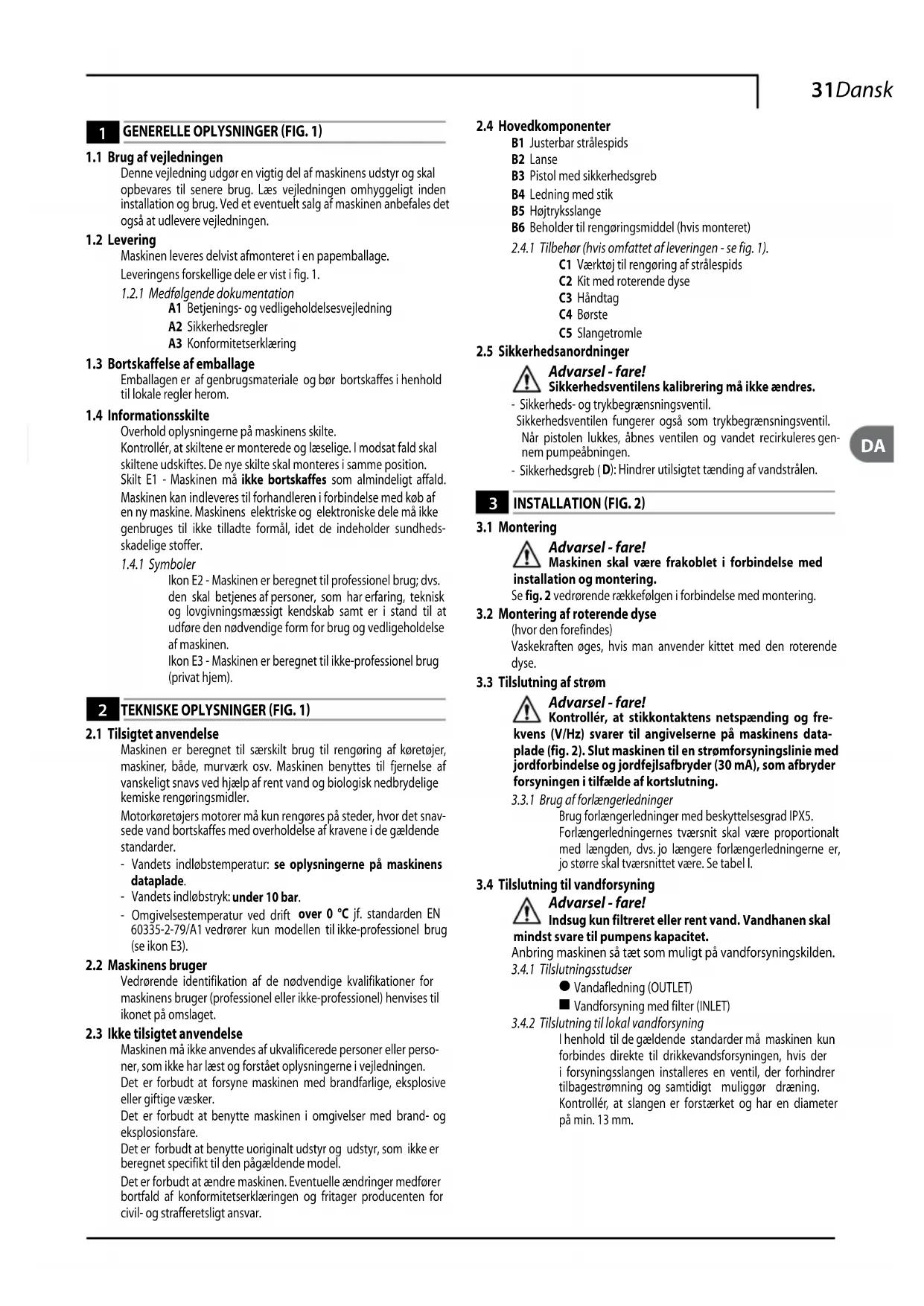 Advarsel - fare! Kontrollér, at stikkontaktens netspænding og fre-kvens (V/Hz) svarer til angivelserne på maskinens data-plade (fig. 2). Slut maskinen til en strømforsyningslinie med jordforbindelse og jordfejlsafbryder (30 mA), som afbryder forsyningen i tilfælde af kortslutning.